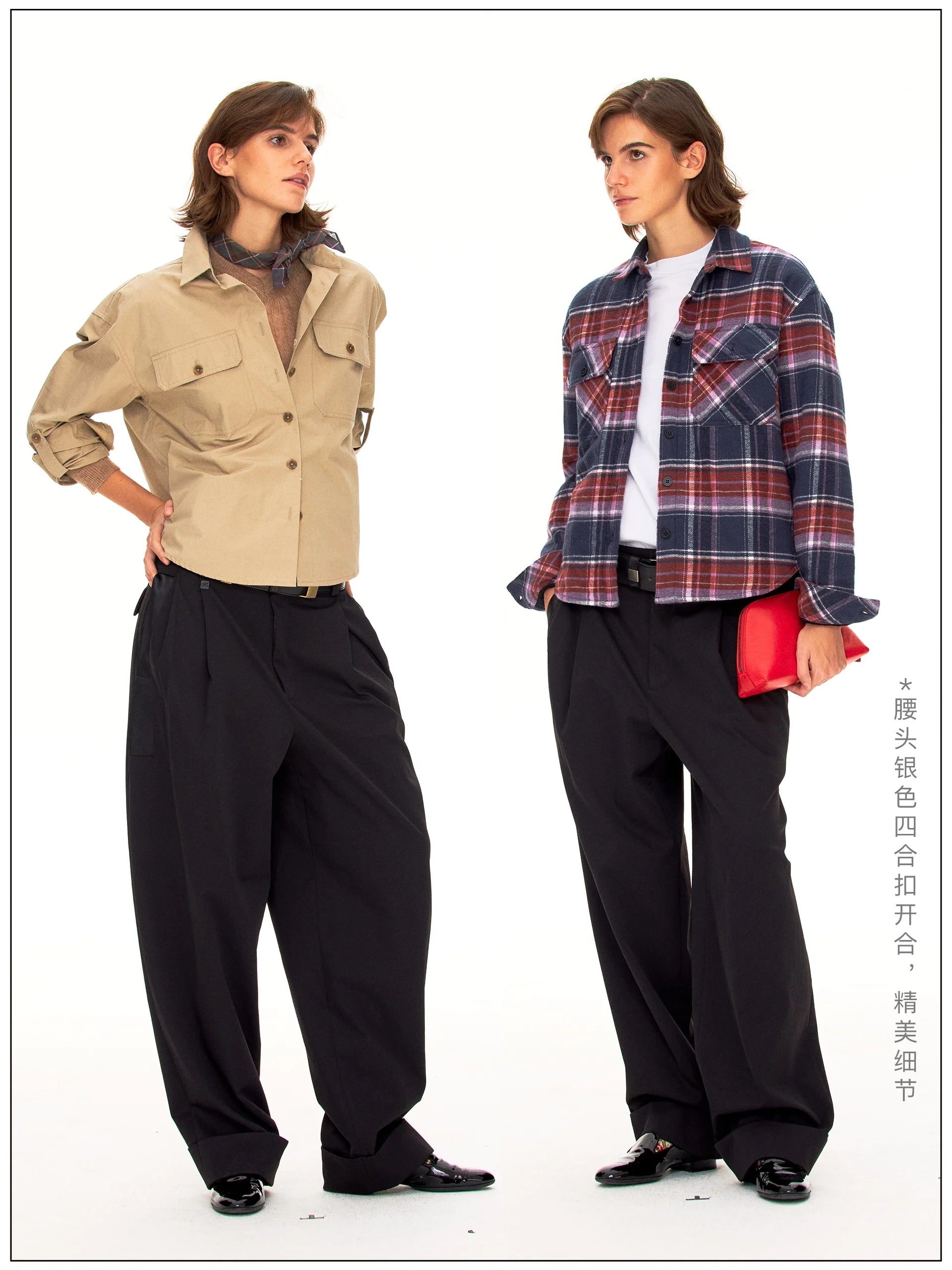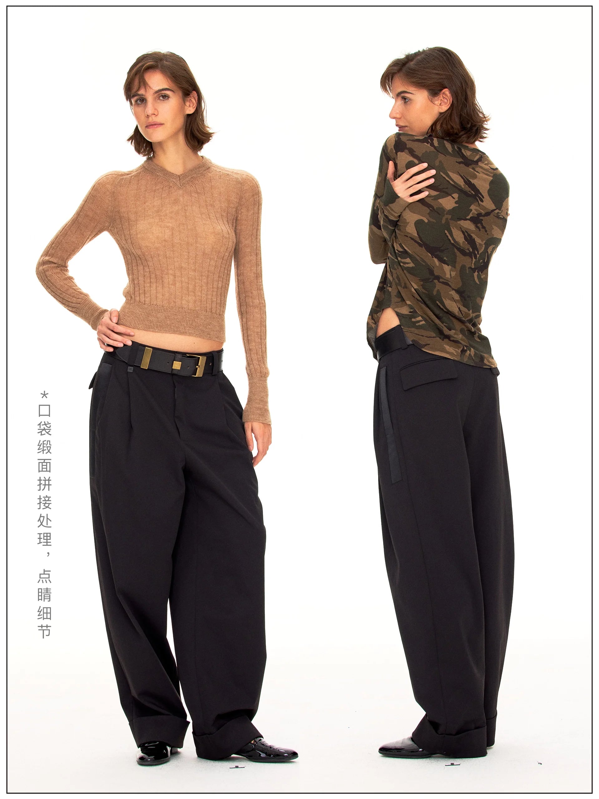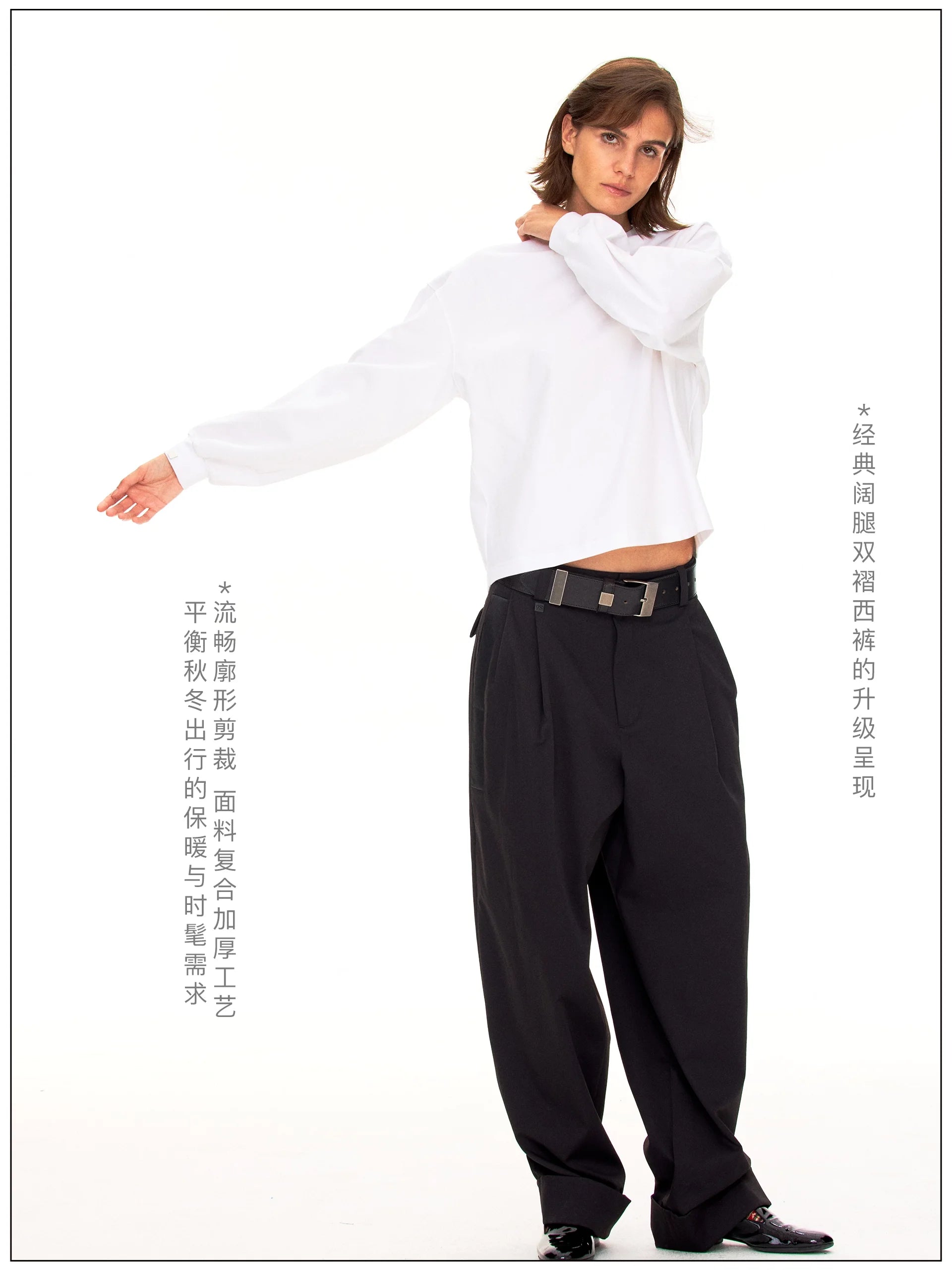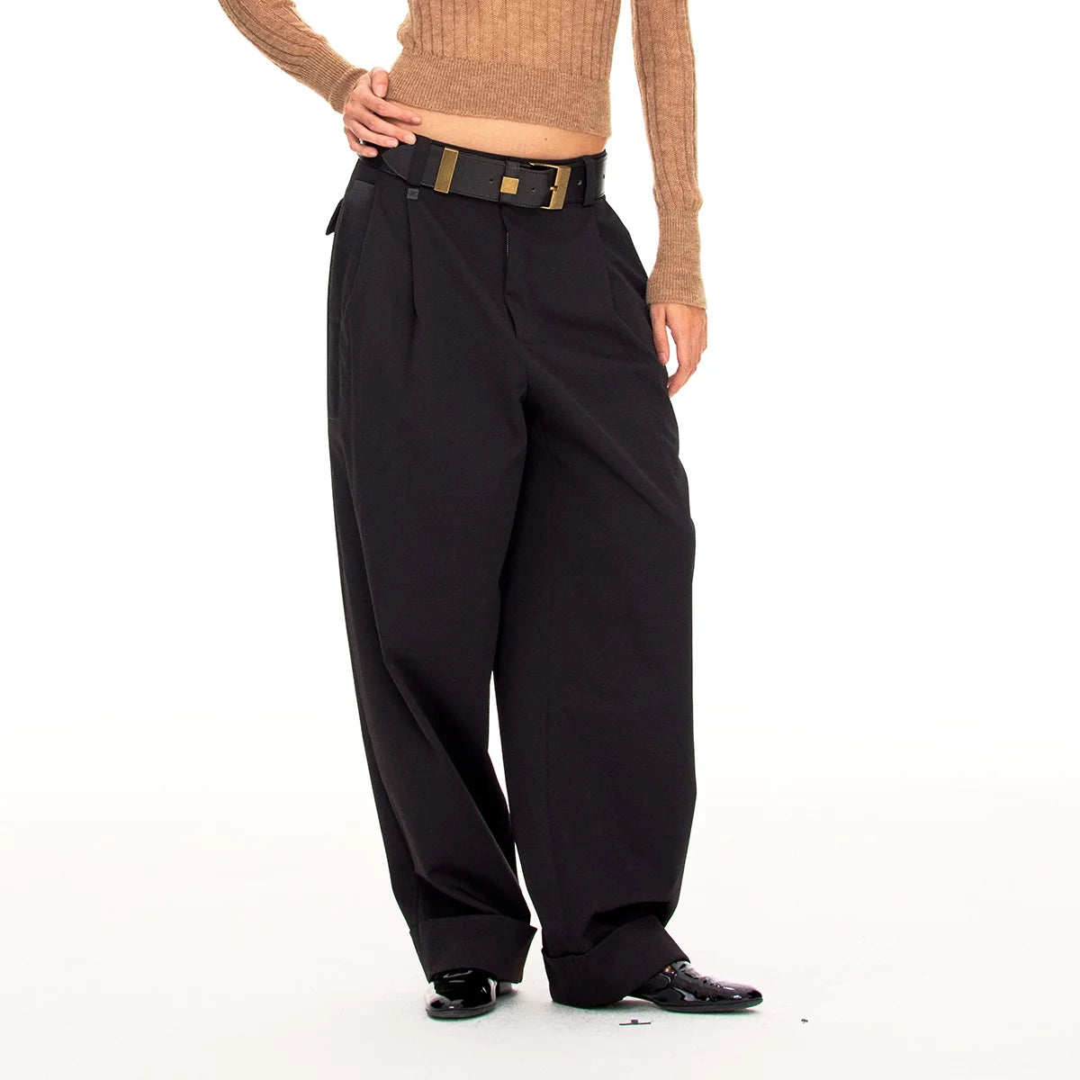 Elevate your wardrobe with these elegant high-waisted satin trousers, designed for a polished, modern silhouette. Featuring double front pleats and a wide-leg fit, these trousers offer both structure and fluidity. Styled with a thick black belt and metallic accents, they add a bold edge to any ensemble. The slightly overlength hem creates a graceful drape over your footwear. Modeled by a female, these trousers are ideal for sophisticated, contemporary dressing.