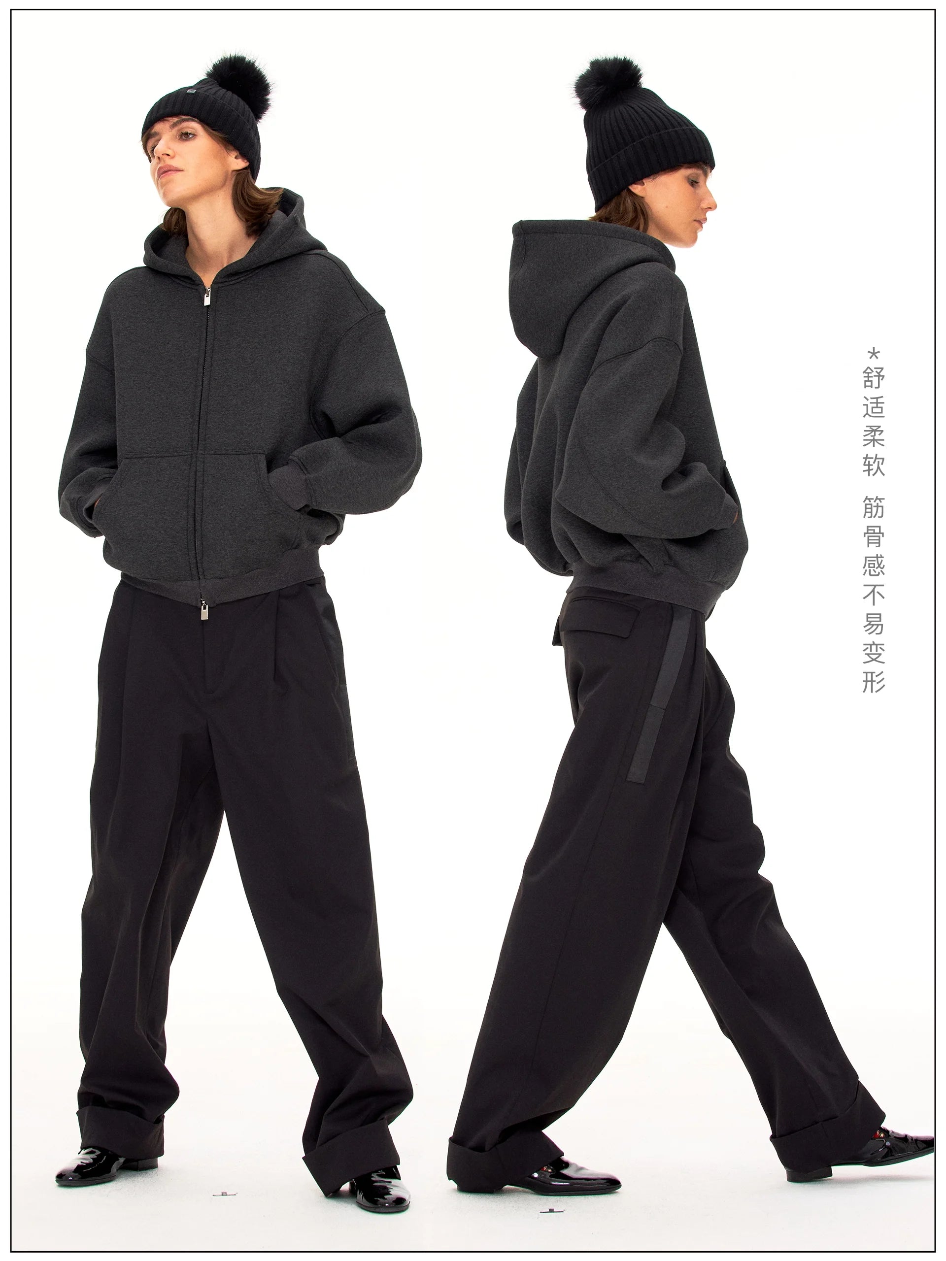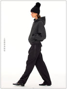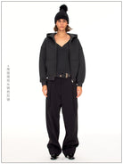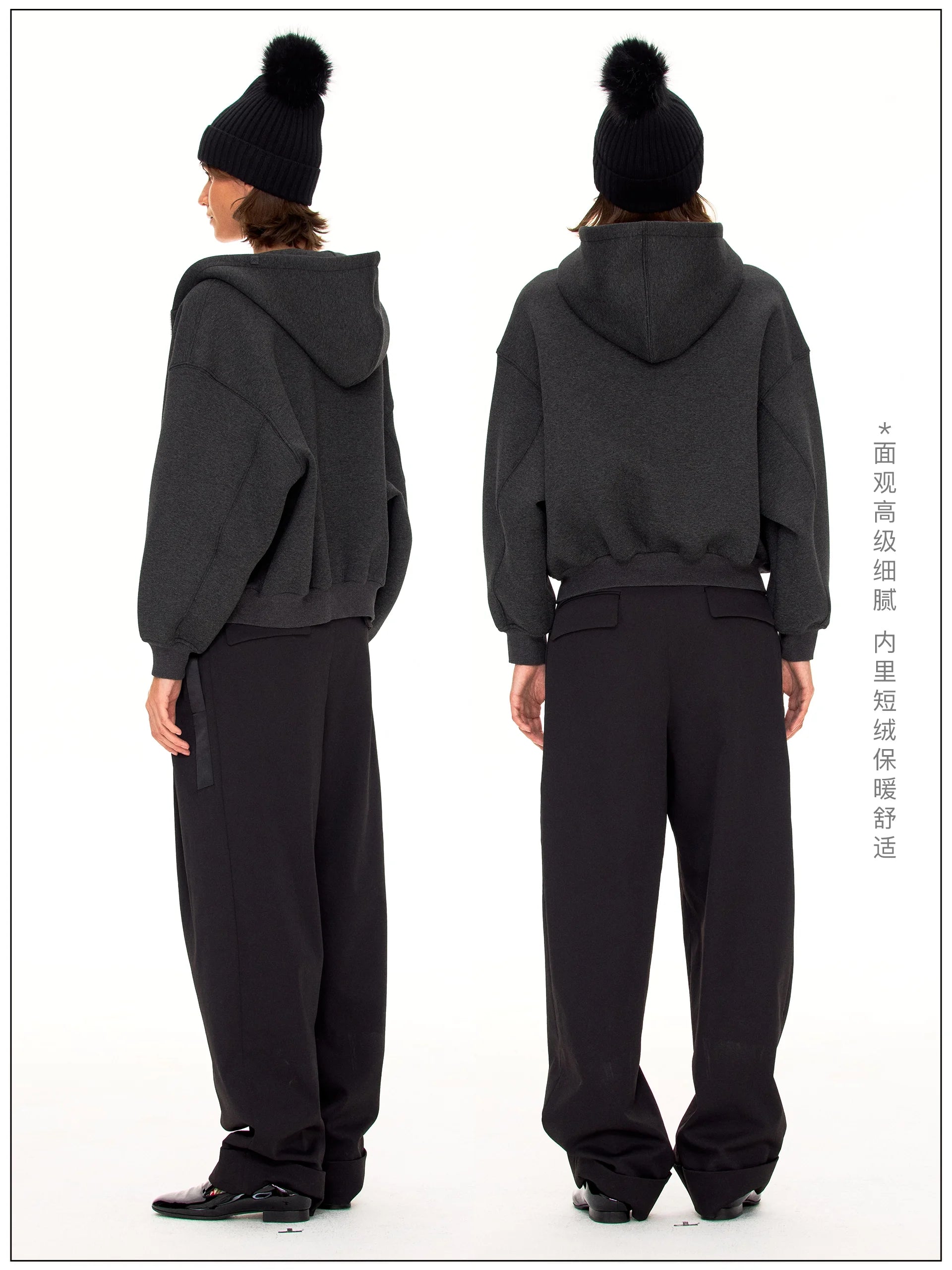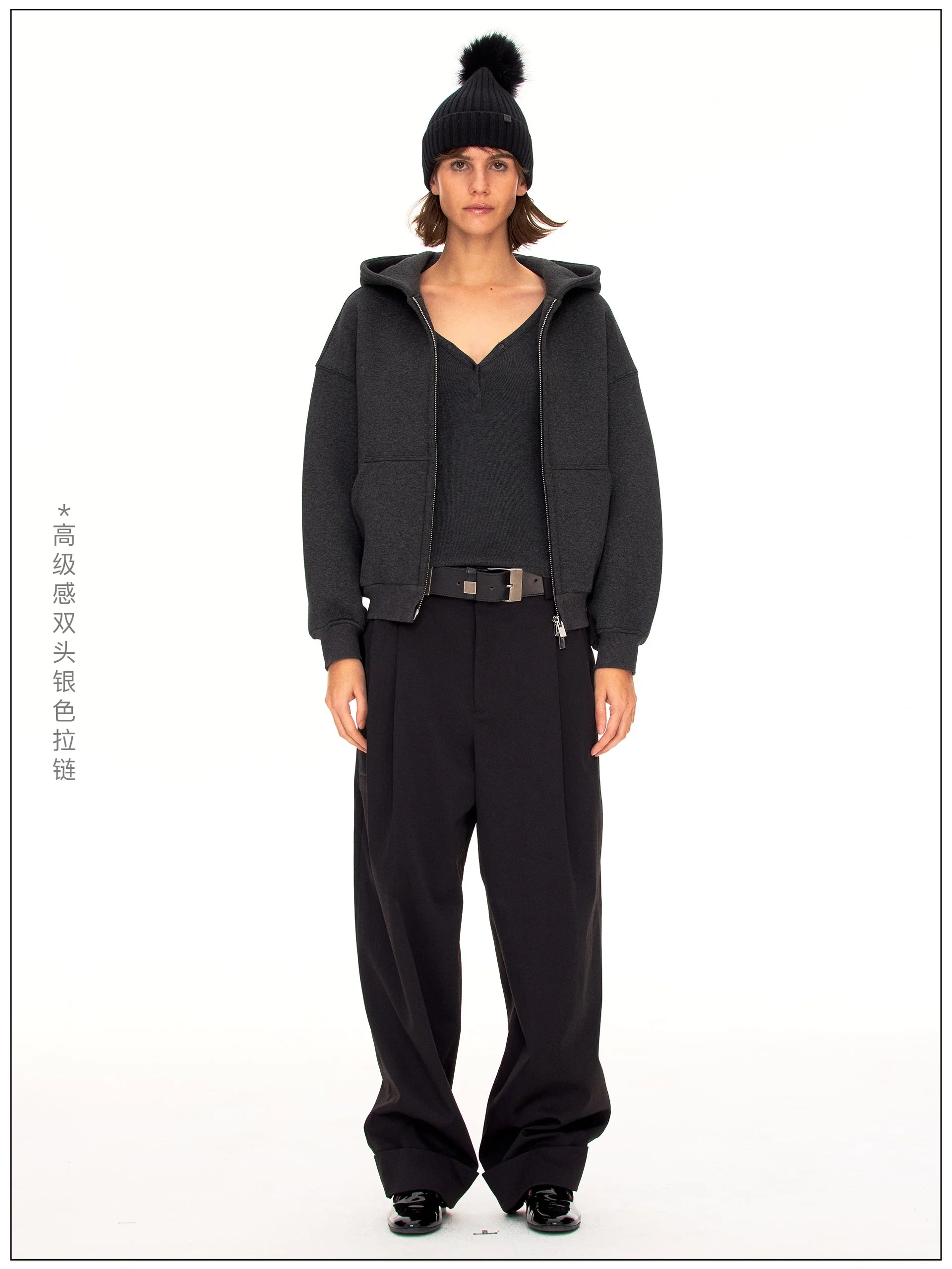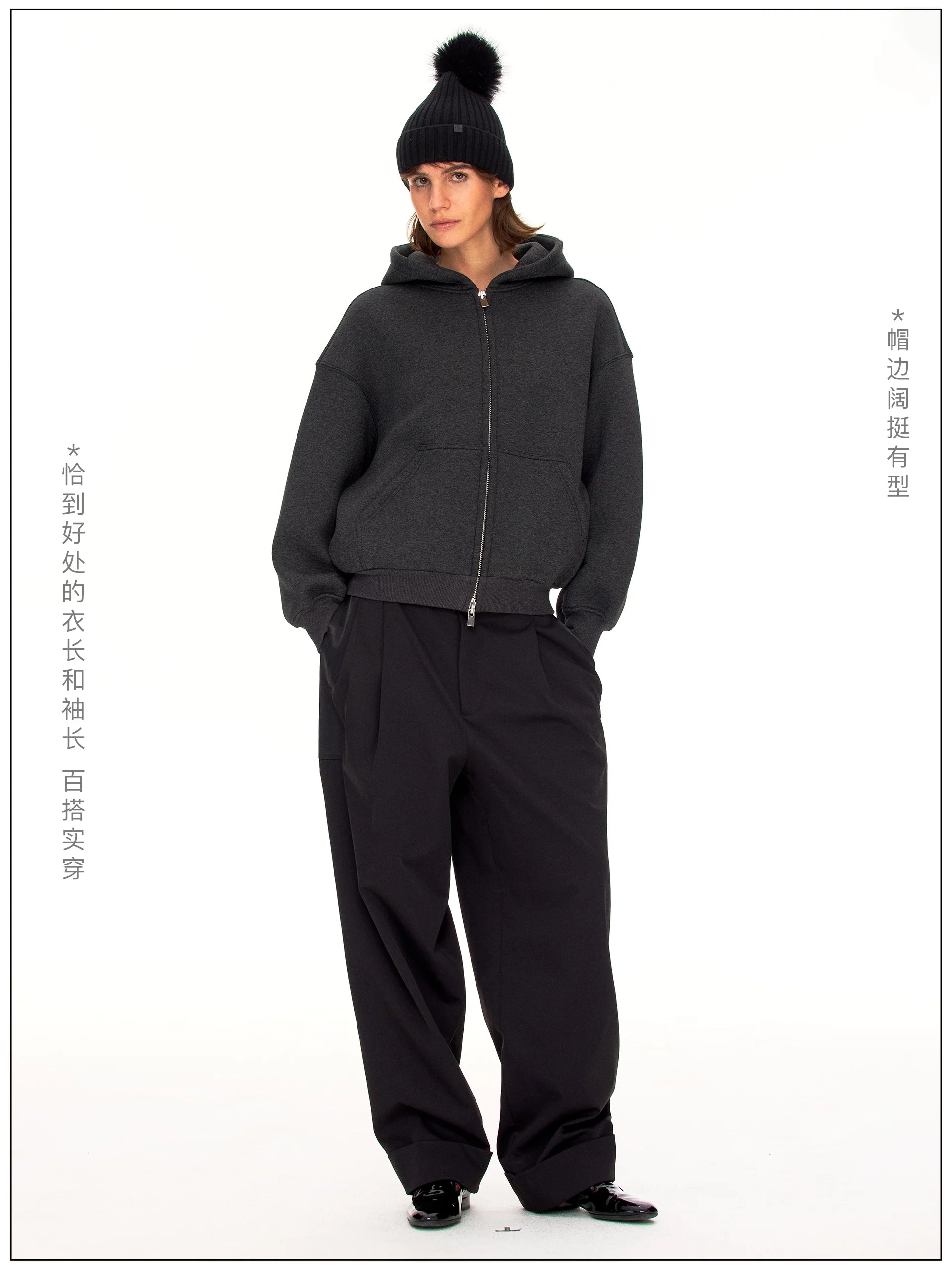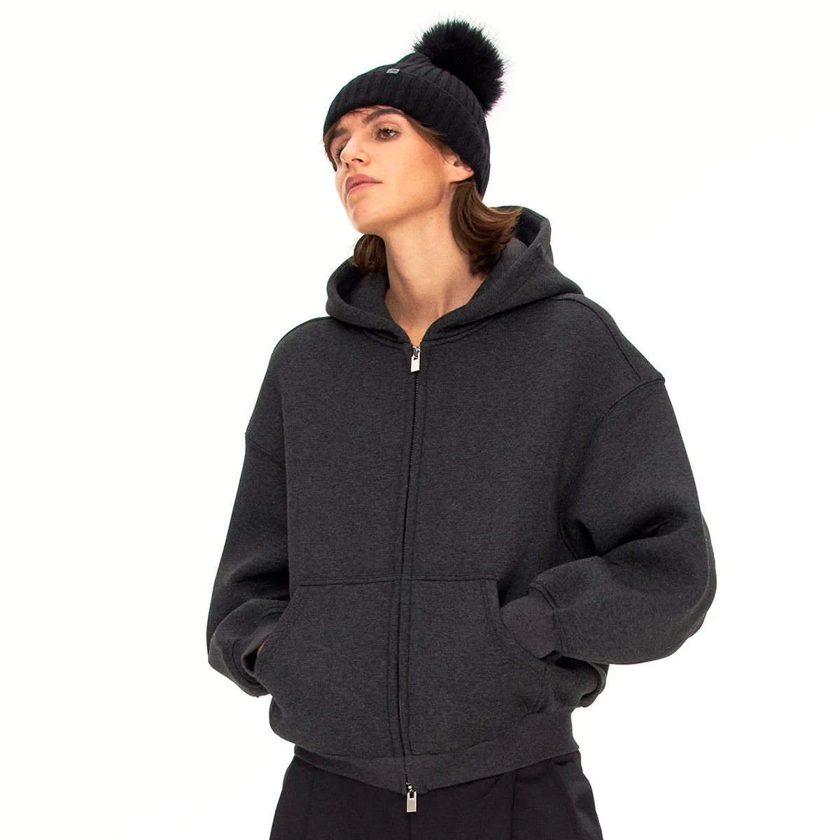 This limited edition hoodie features a dome silhouette crafted from premium Italian fabric for a refined yet relaxed look. Designed for women, it offers an oversized fit with a front zipper closure, a streamlined hood without drawstrings, and a kangaroo-style front pocket. The dark charcoal tone complements its minimalist aesthetic, making it a versatile staple for contemporary casualwear.