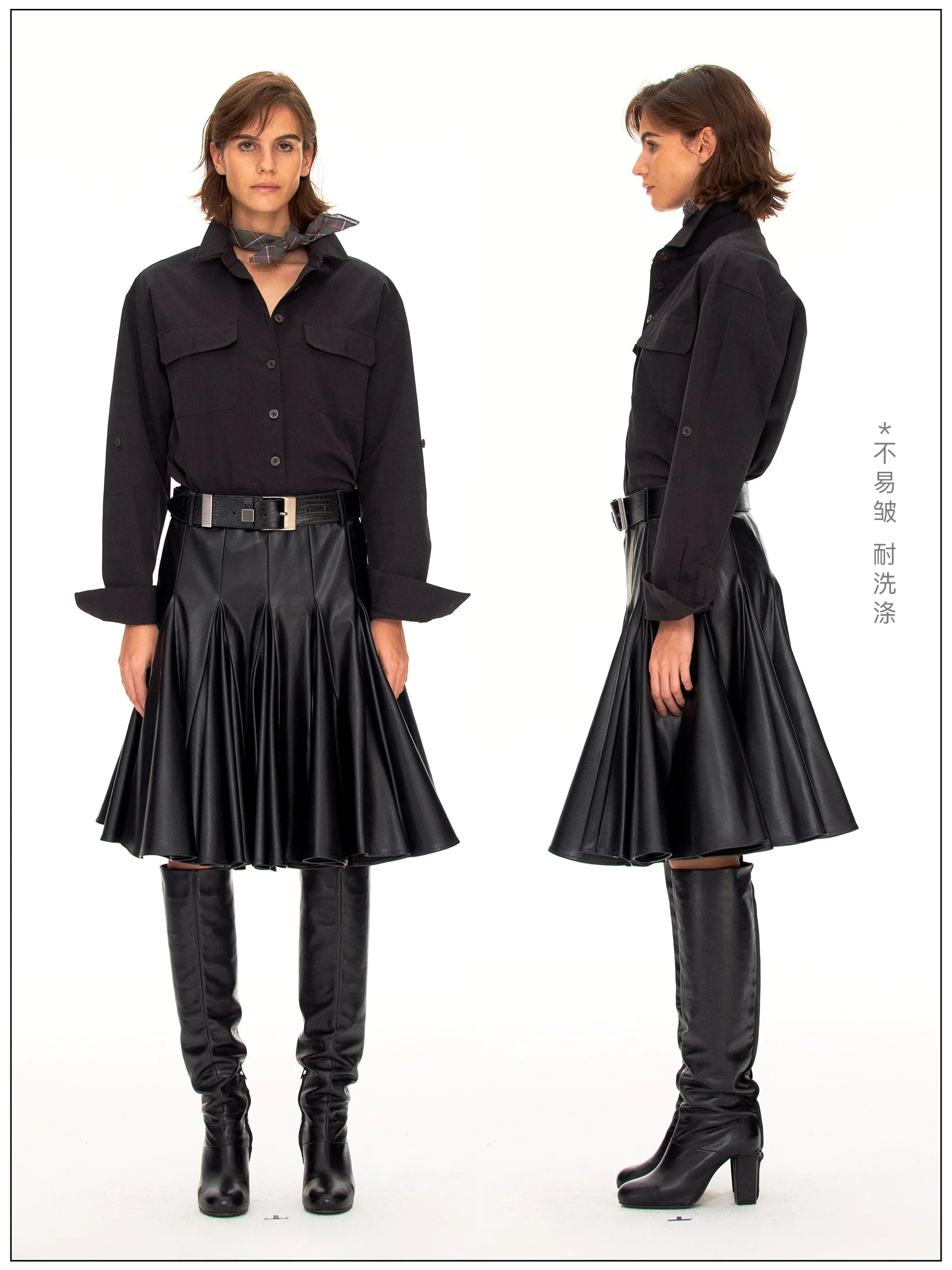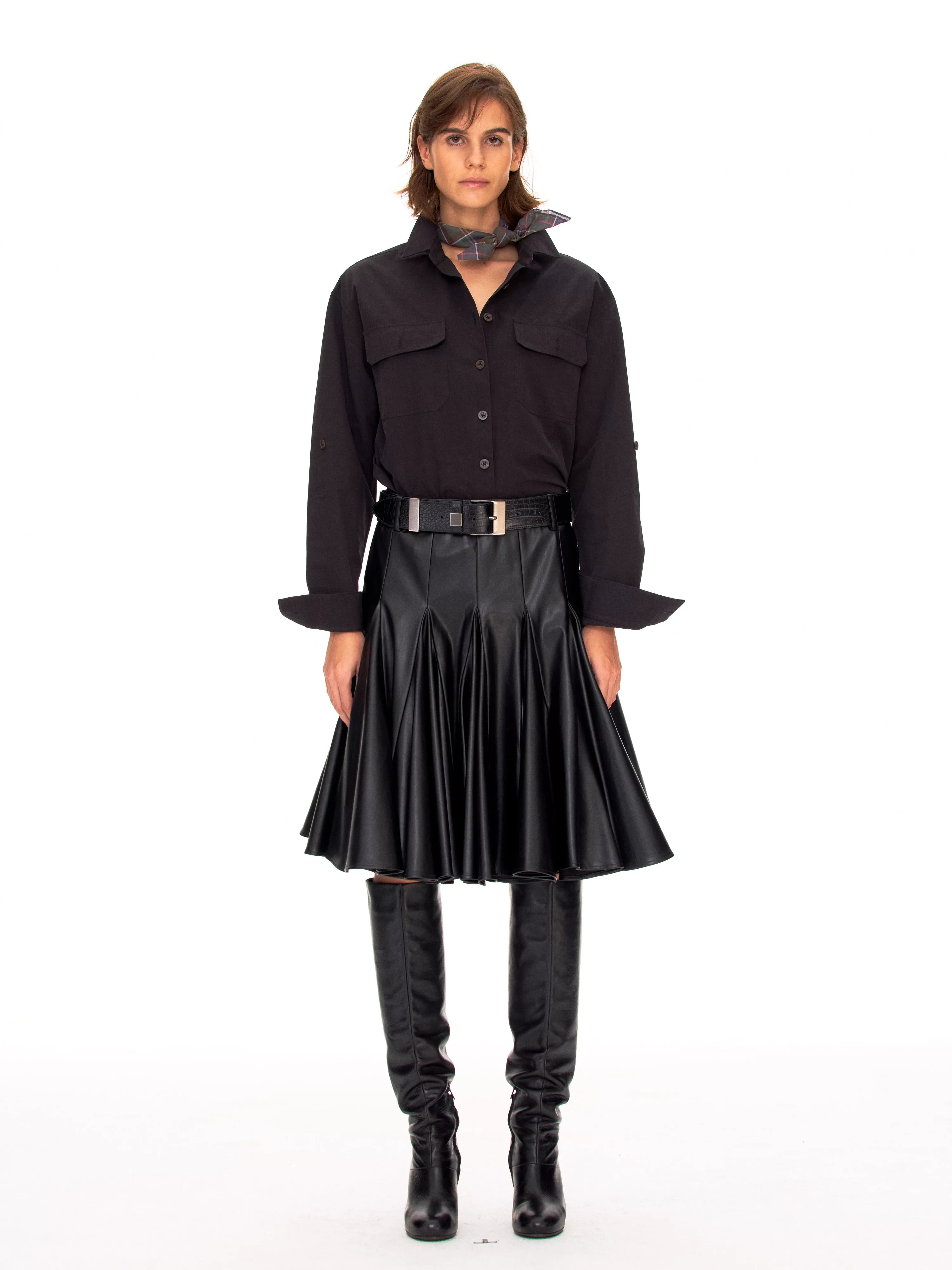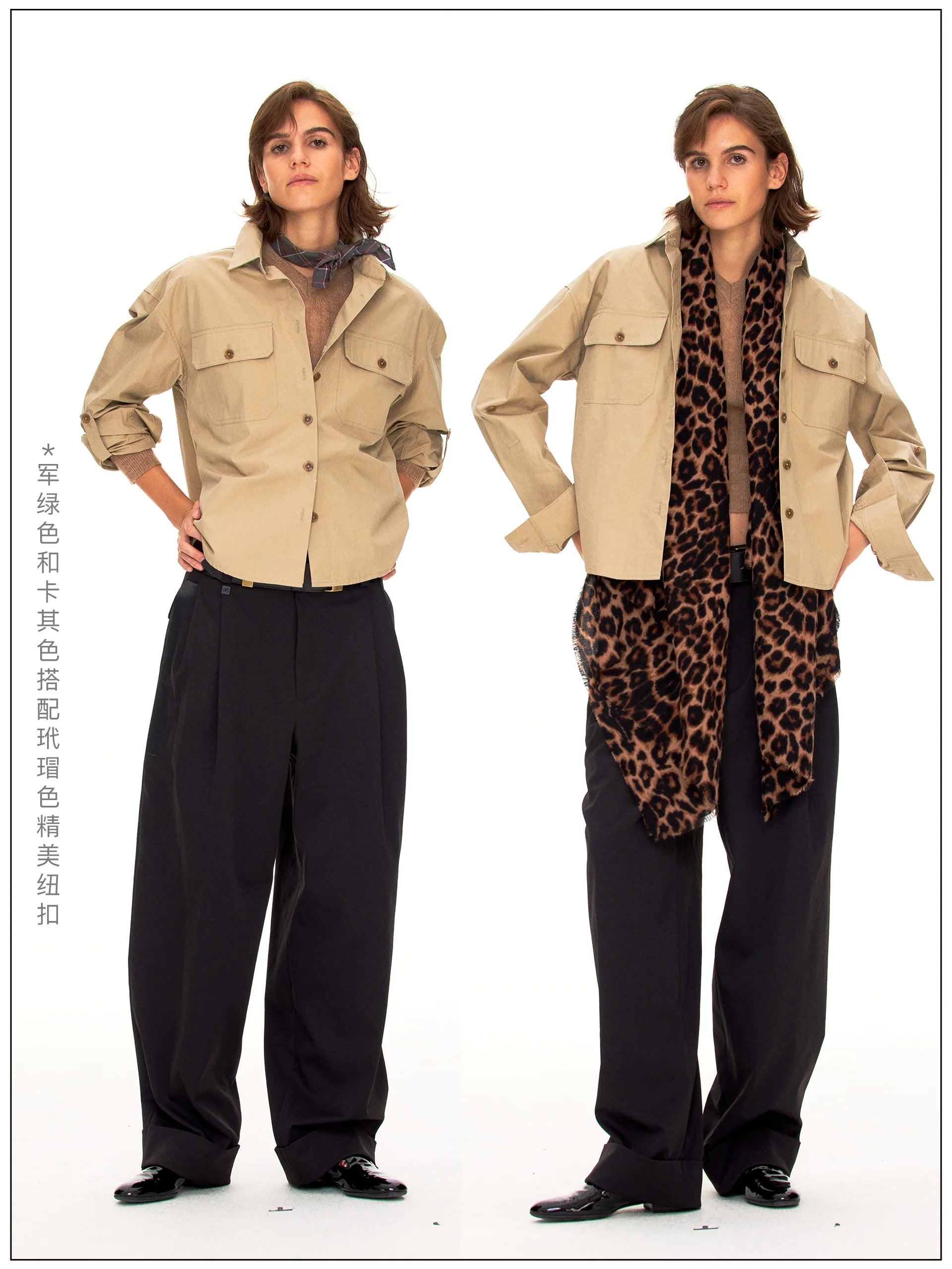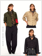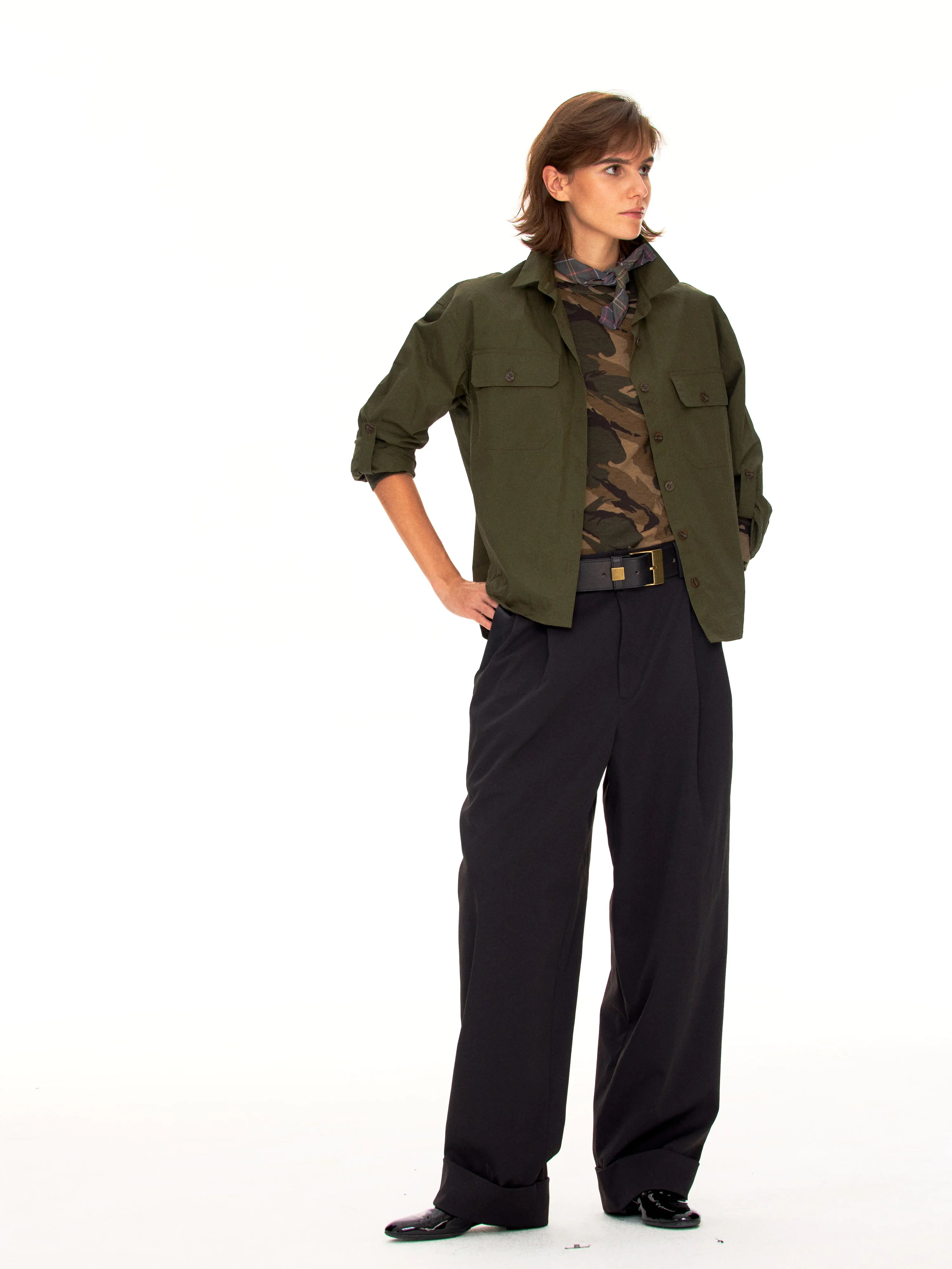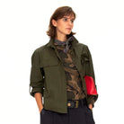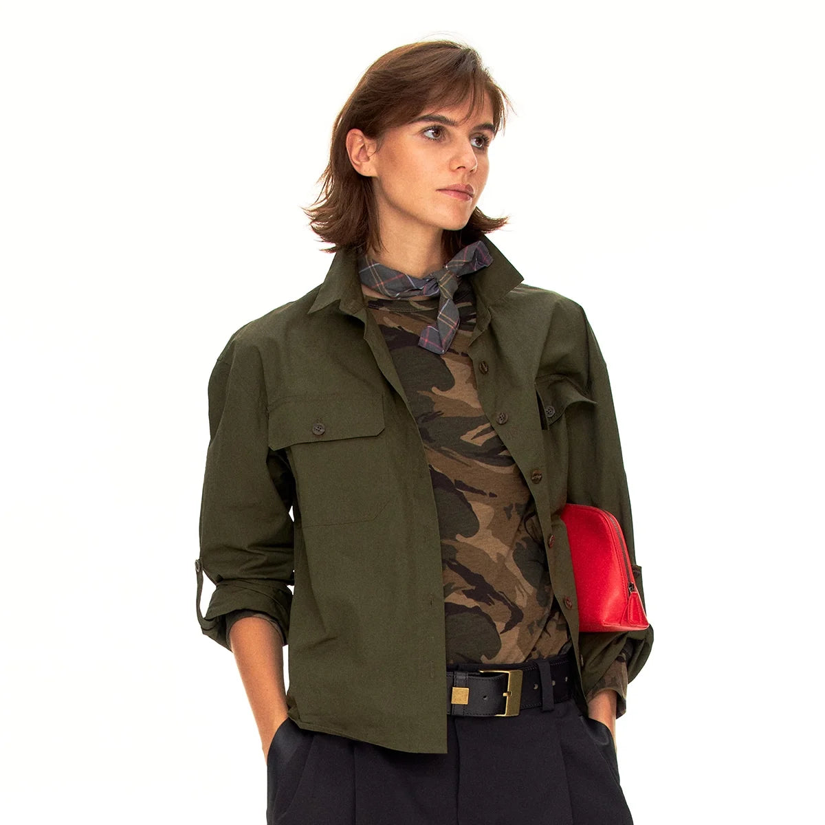 Step into adventure with this women's olive safari button-up shirt, inspired by classic military style. Designed with rolled-up sleeves and dual flap chest pockets, it offers both function and edge. The structured silhouette adds polish, while its versatile tone pairs effortlessly with camouflage prints and bold accessories. Perfect for layering or as a standalone statement piece, this shirt brings utilitarian chic to your wardrobe.
