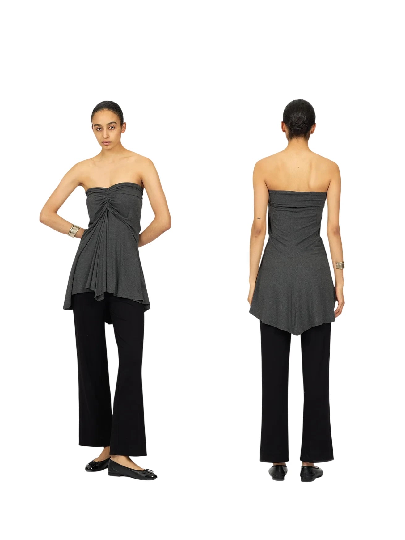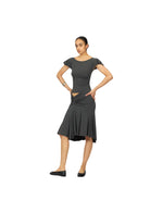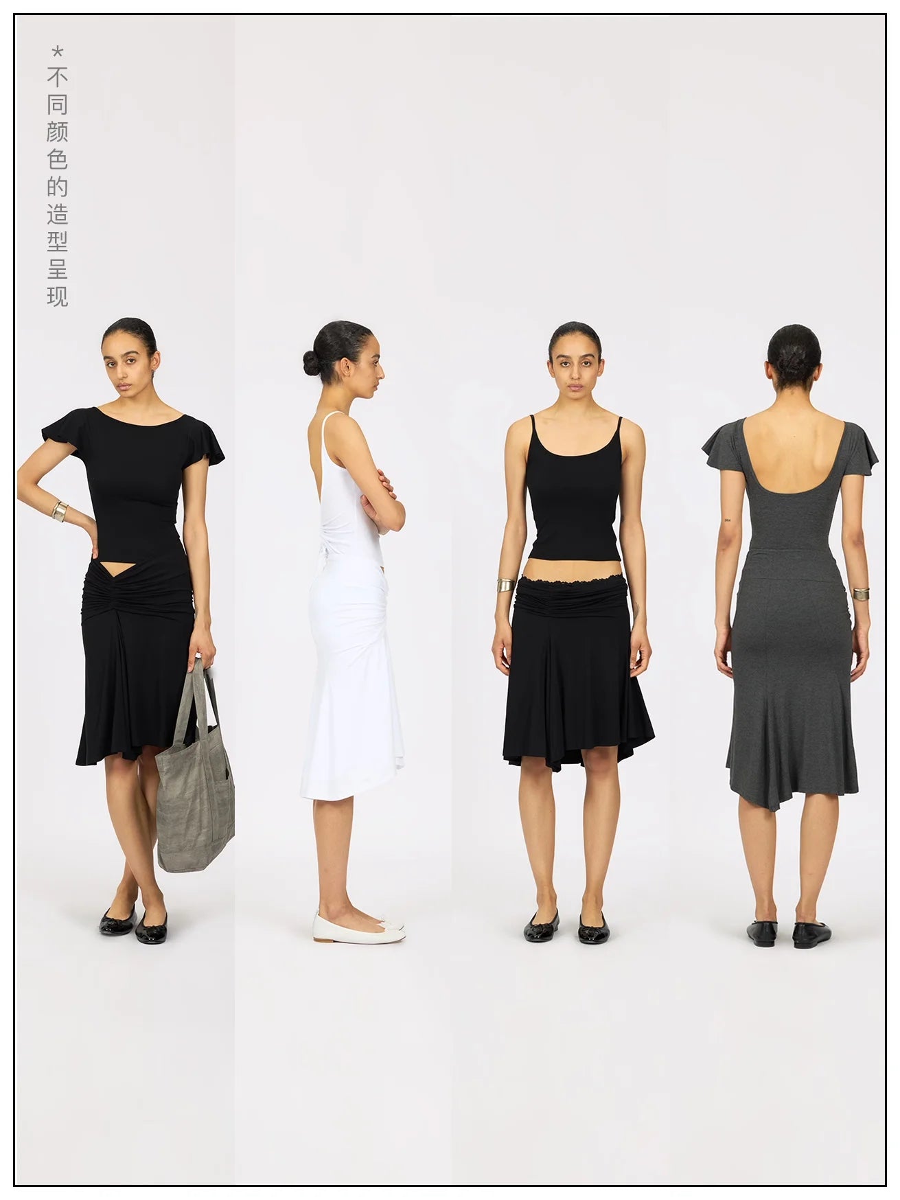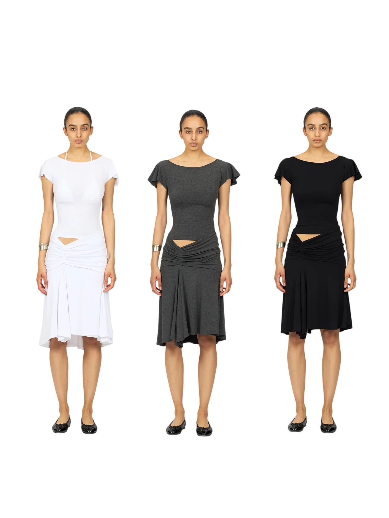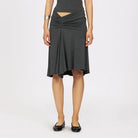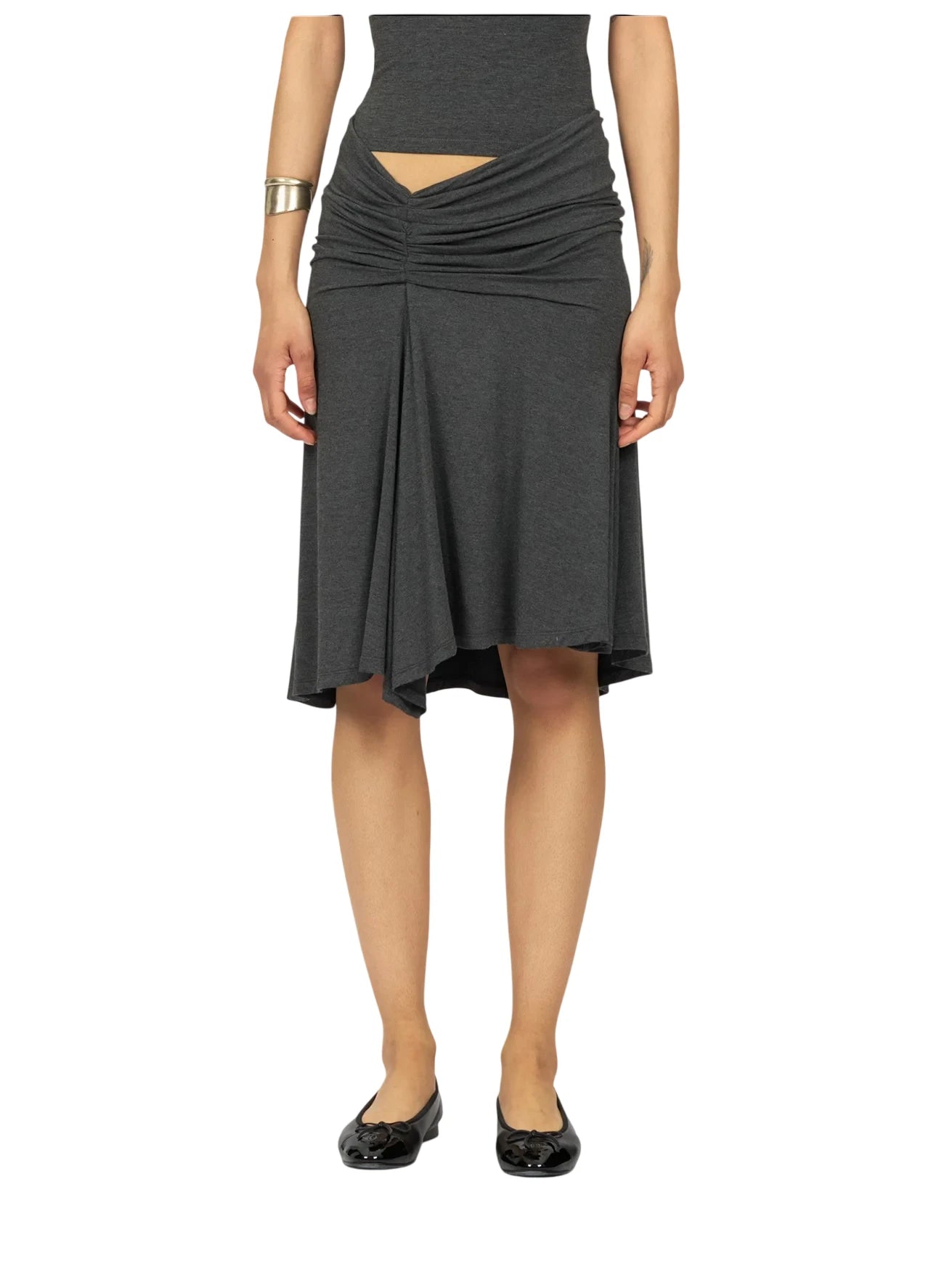This women's mermaid skirt features a rich dark charcoal grey tone with a ruched waistband and an asymmetrical, flowing hemline for a dynamic silhouette. An inverted triangle front cutout adds a modern touch above the waistline, while pleated detailing enhances its soft, draped texture. It offers a stylish yet relaxed fit, perfect for casual sophistication.