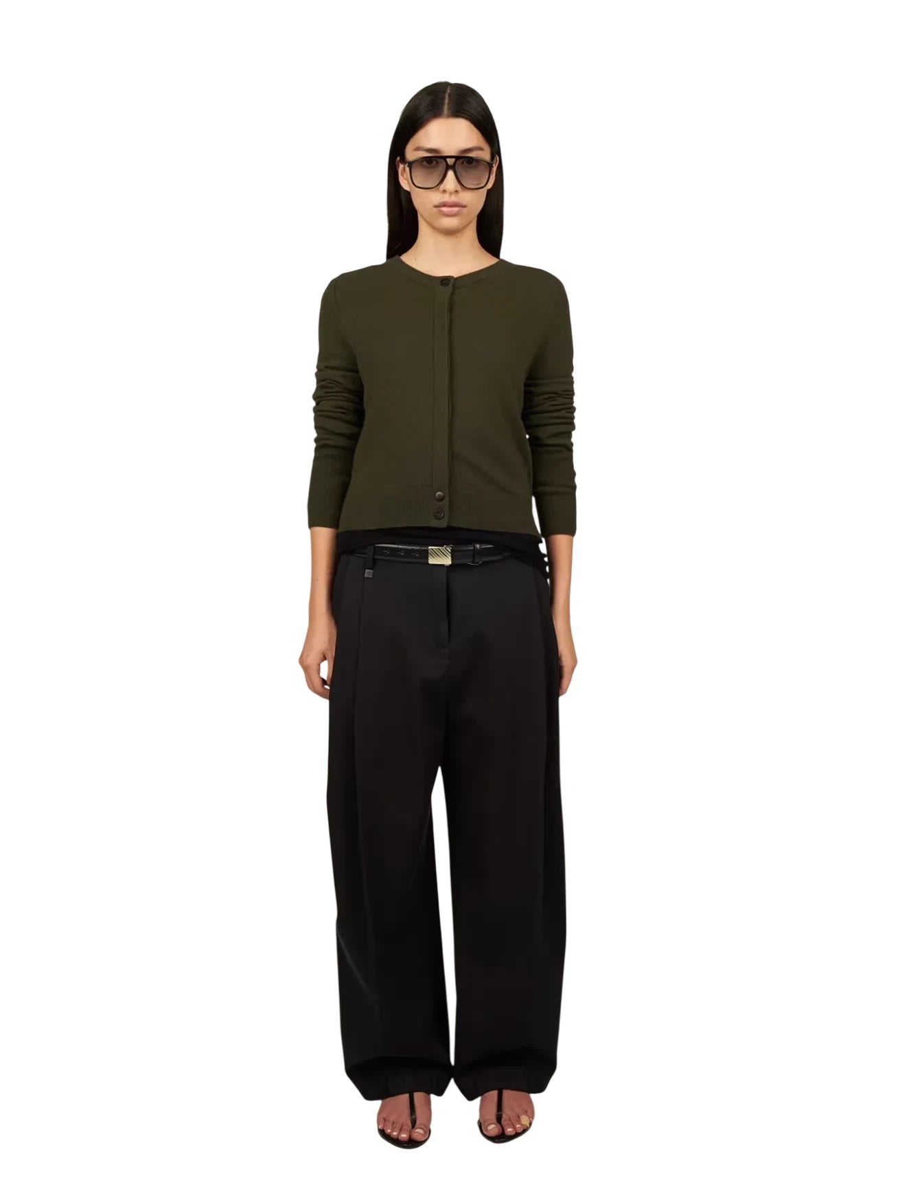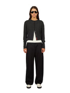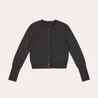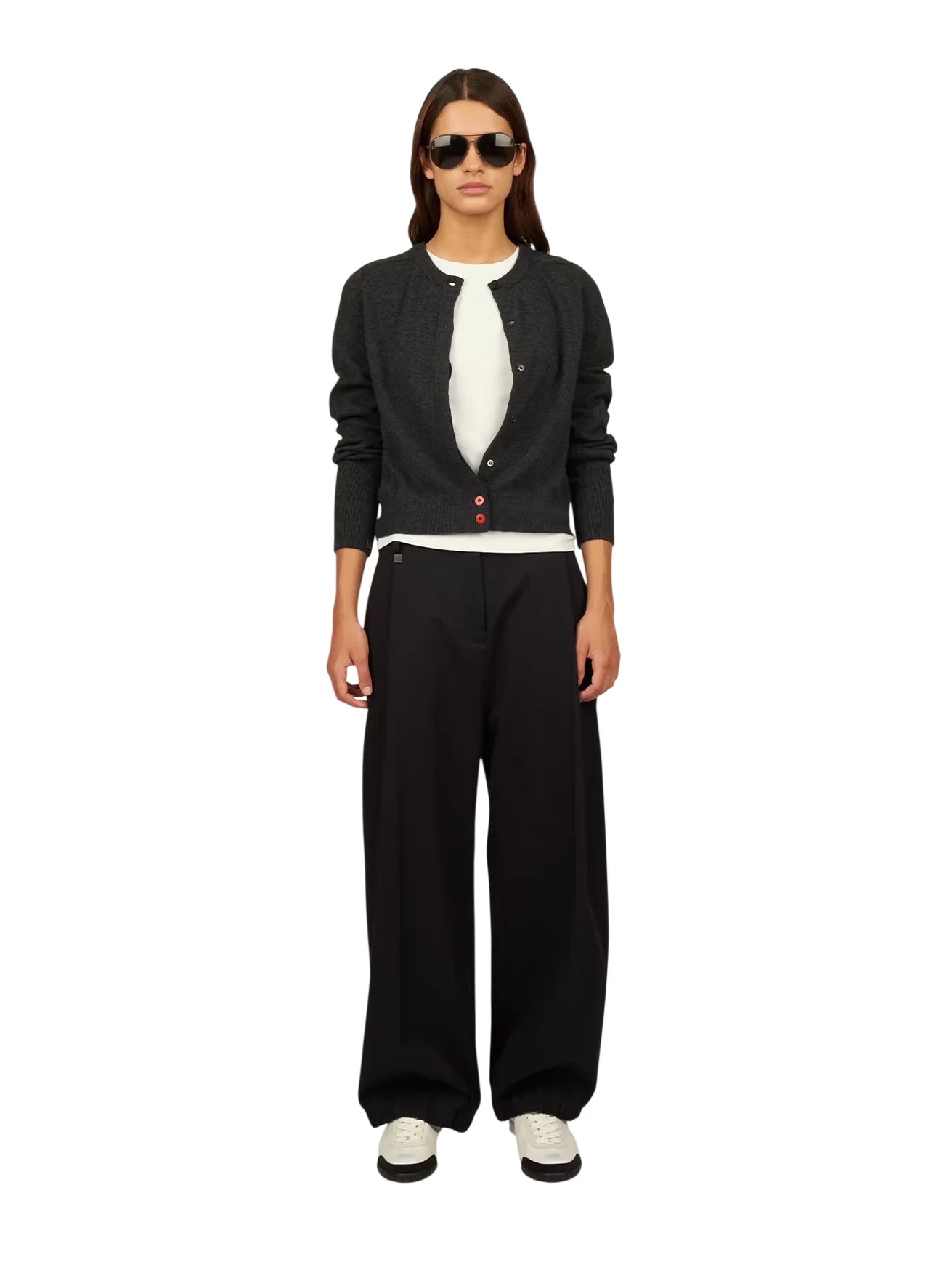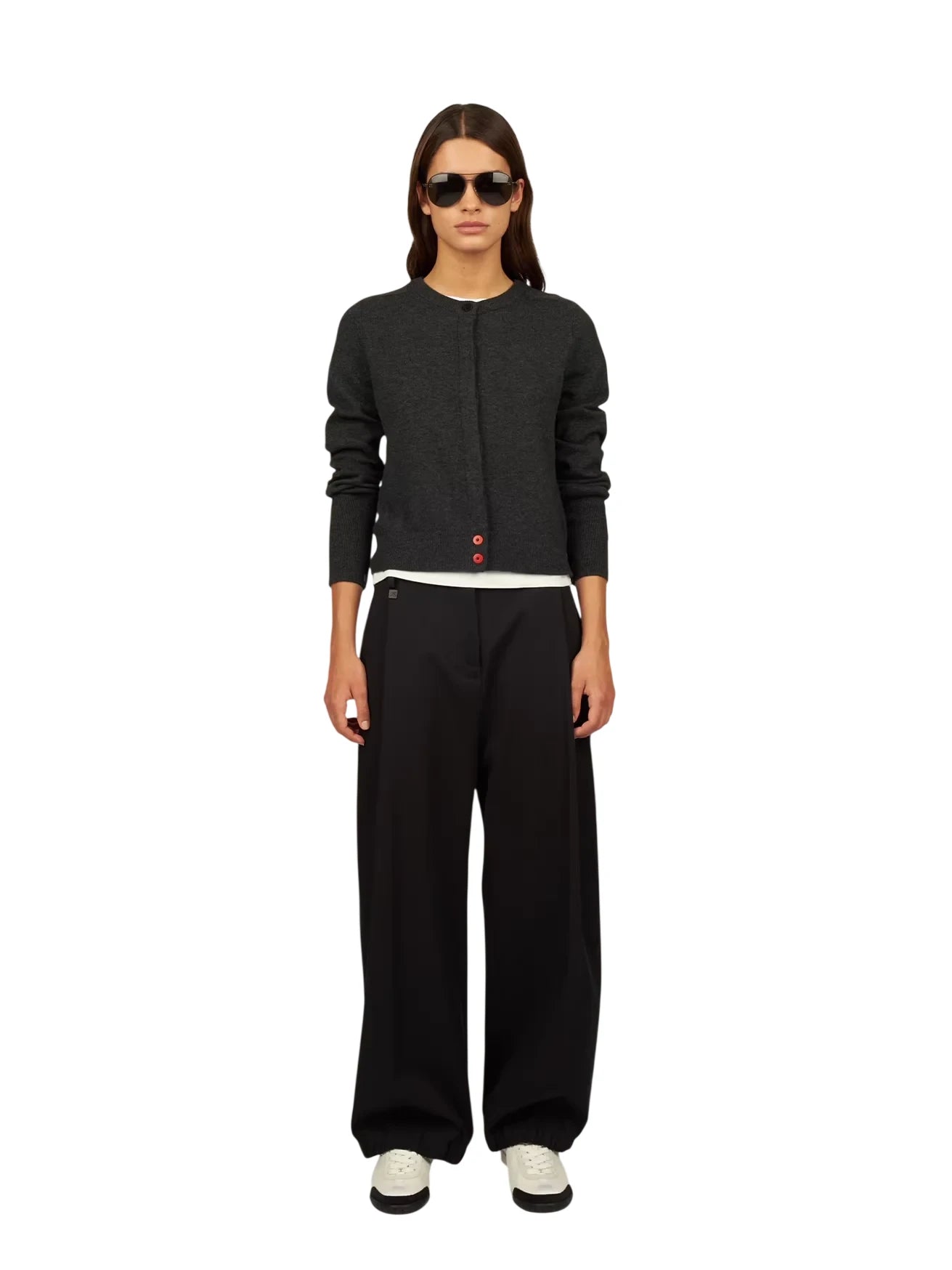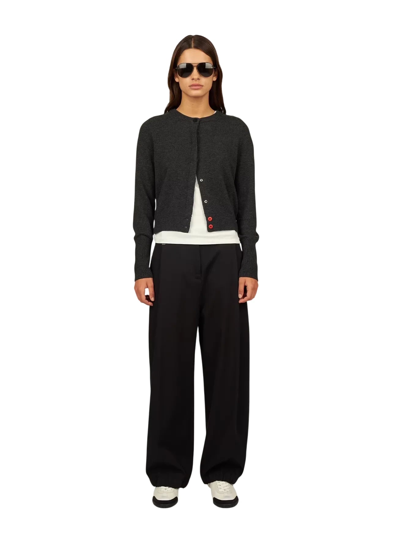 This women's cropped knit cardigan features a dark grey hue and a classic button-up front. Made with full sleeves and a soft texture, it layers perfectly over a simple white t-shirt for a relaxed, stylish look. A unique detail comes with the bottom two buttons in red, adding a touch of character to the design. Paired effortlessly with loose-fitting black trousers, this cardigan offers versatile styling for everyday wear.