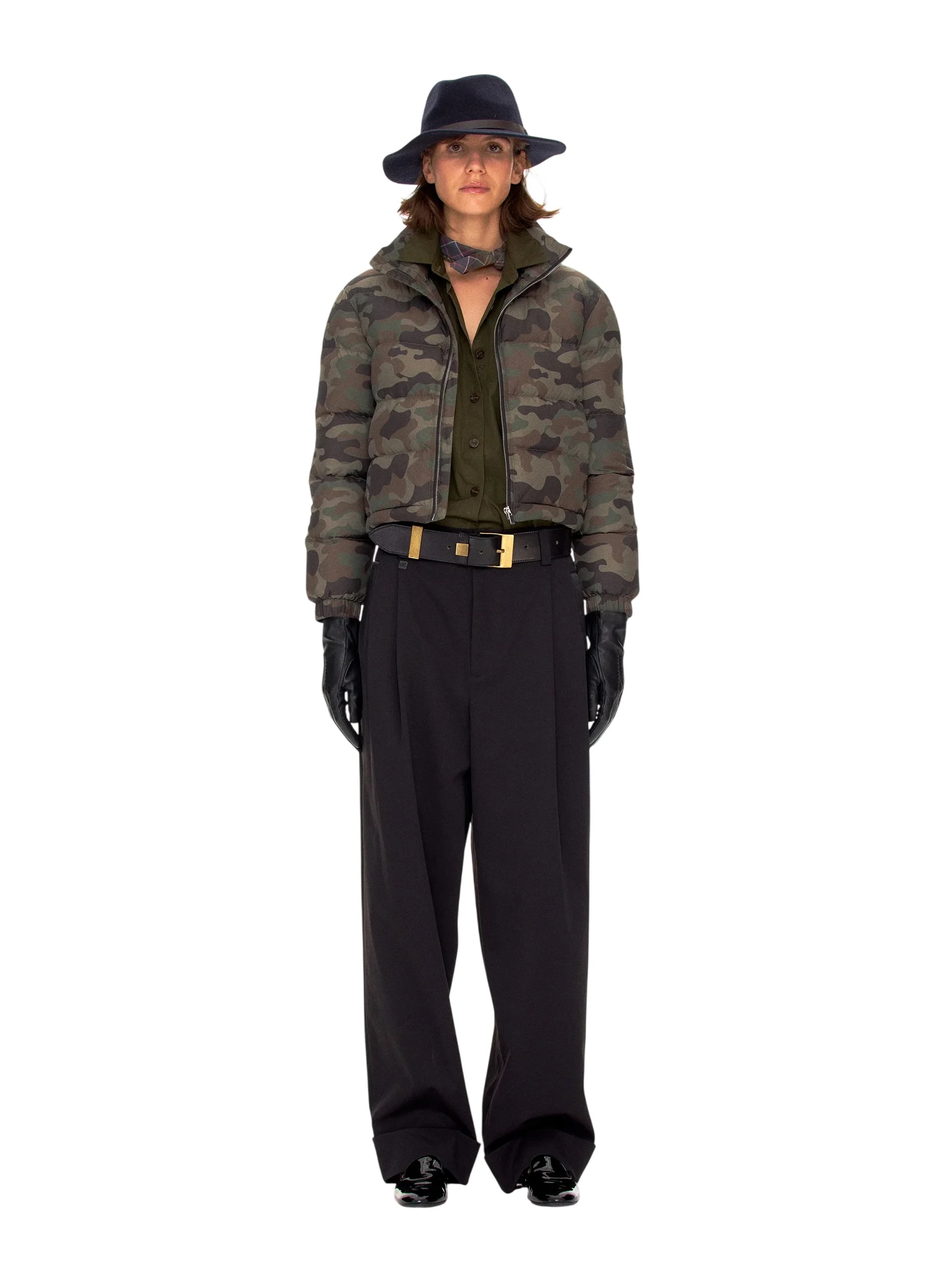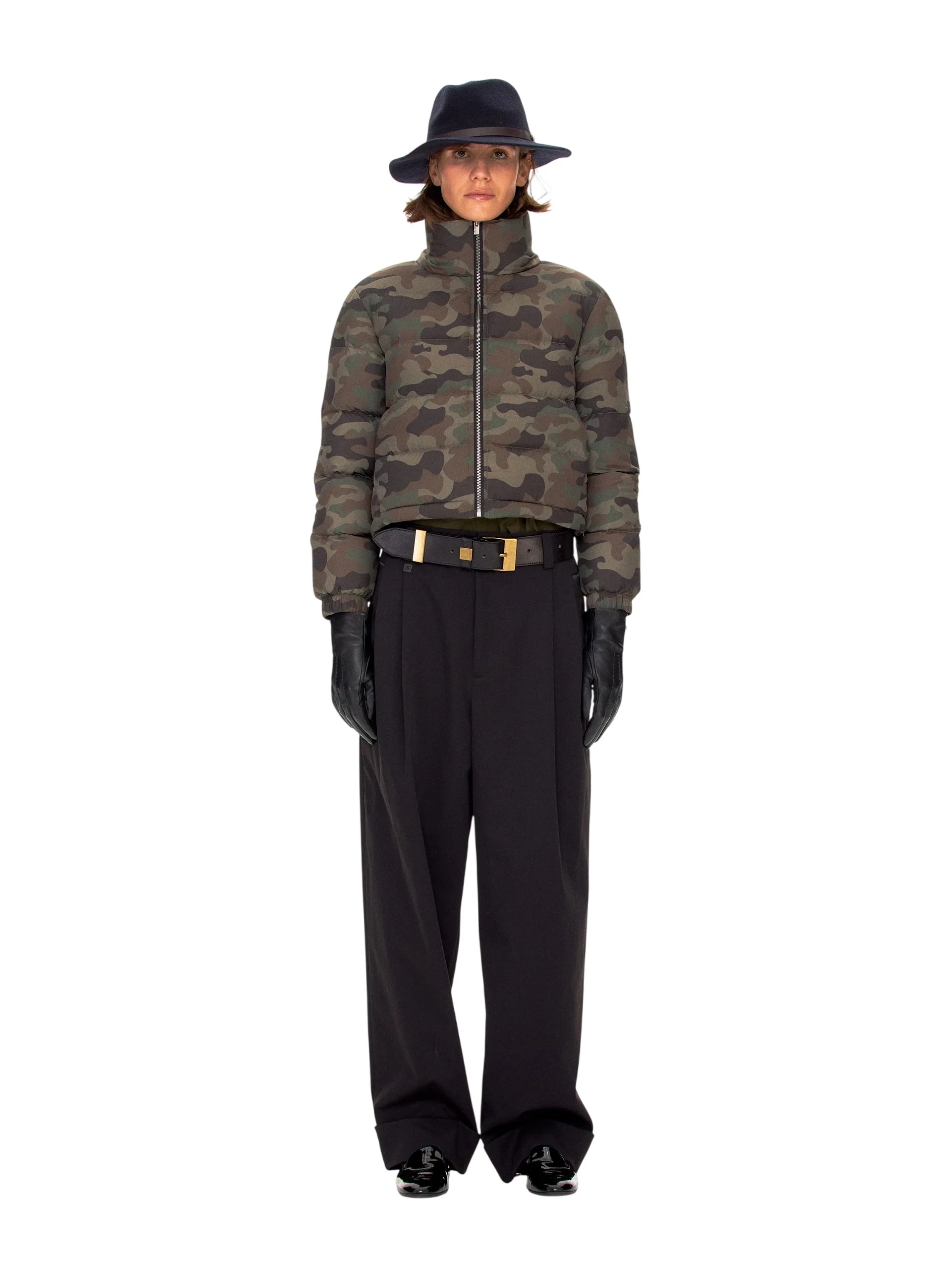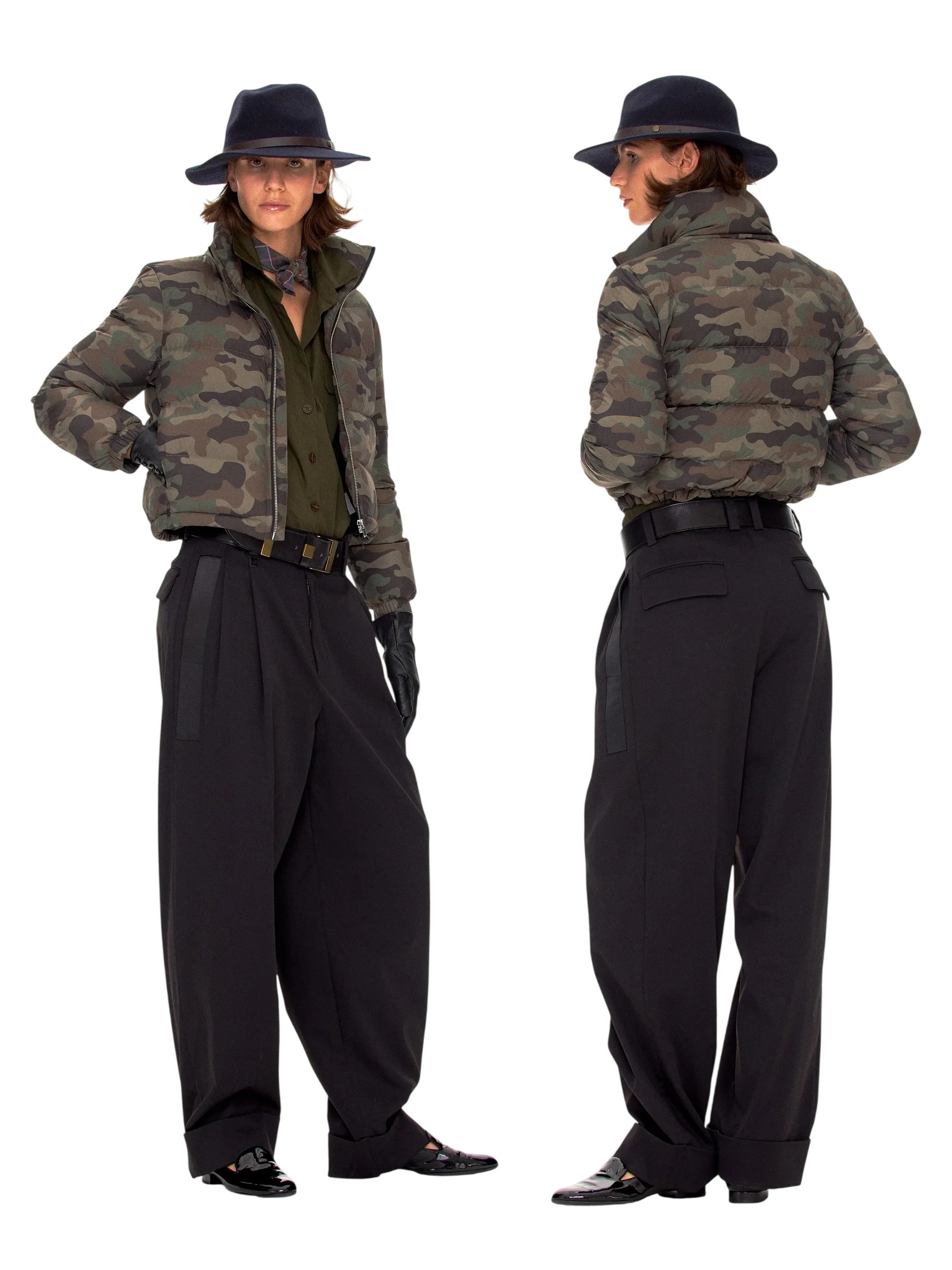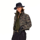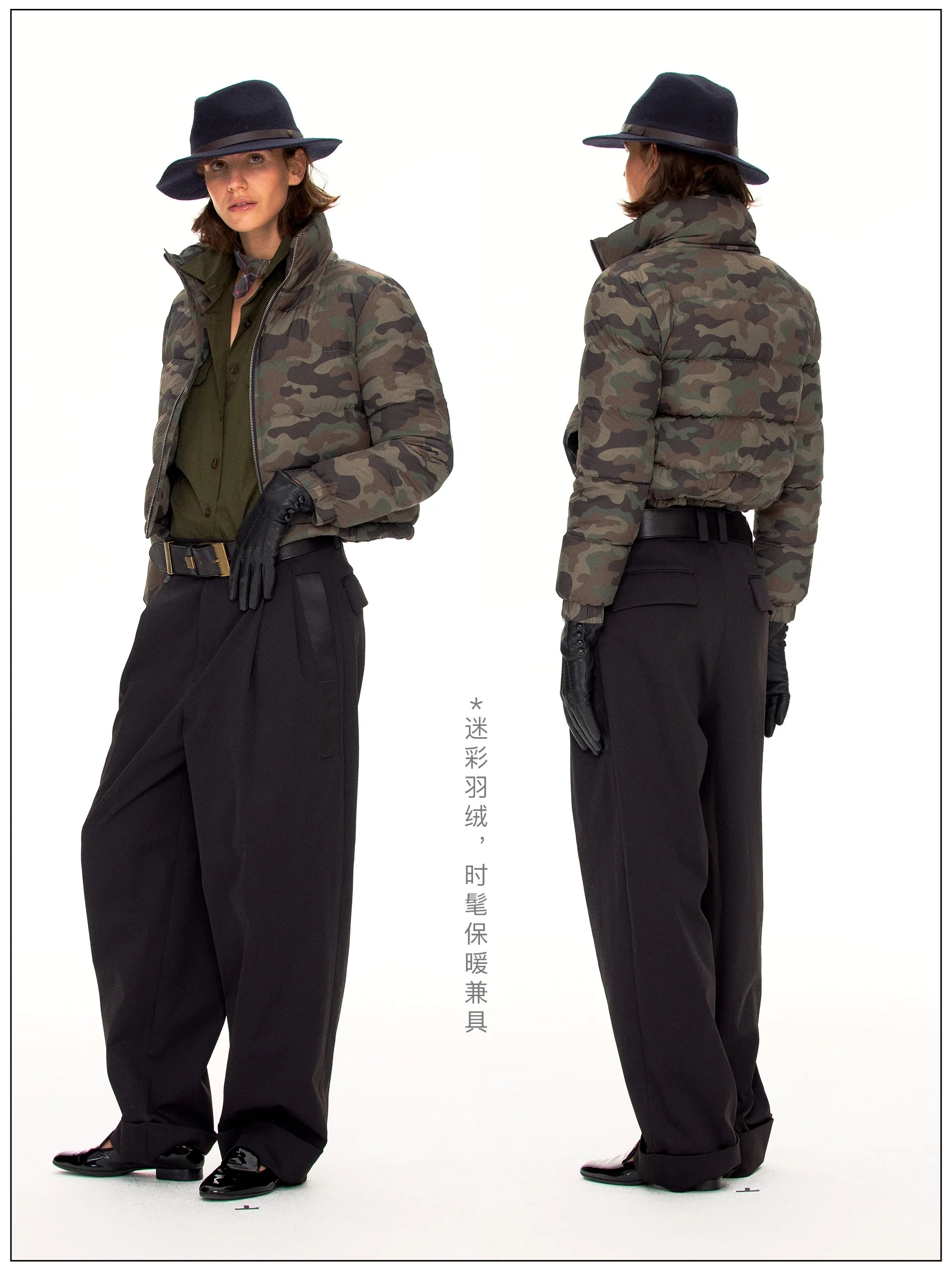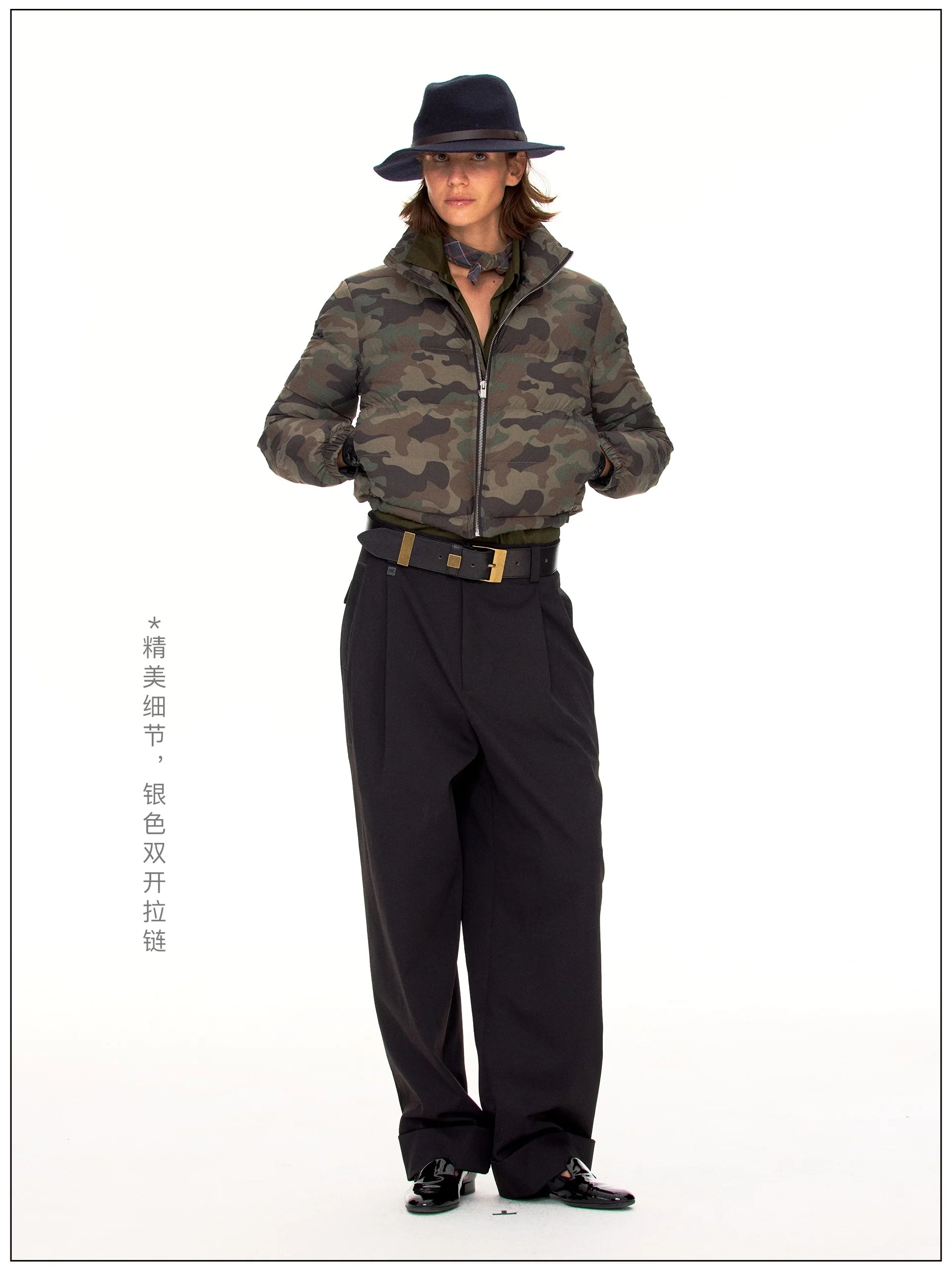 Elevate your cold-weather style with this women's slim fit camouflage down jacket. Designed with both fashion and function in mind, this insulated outerwear piece features a zip-up front and neck protection for enhanced warmth and comfort. The urban-inspired camouflage print brings a rugged edge, while the tailored fit ensures a flattering silhouette. Perfect for layering in colder seasons, this jacket pairs effortlessly with structured trousers and casual accessories for a sophisticated, adventurous look.