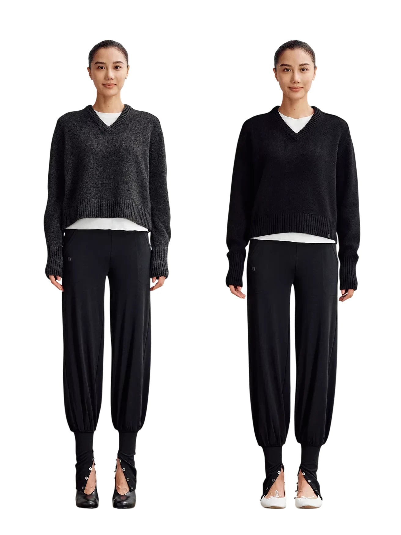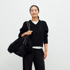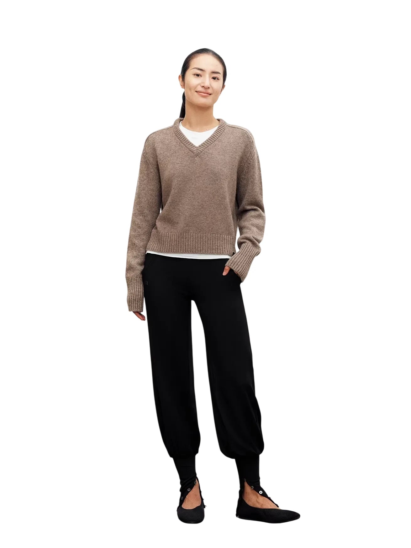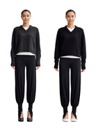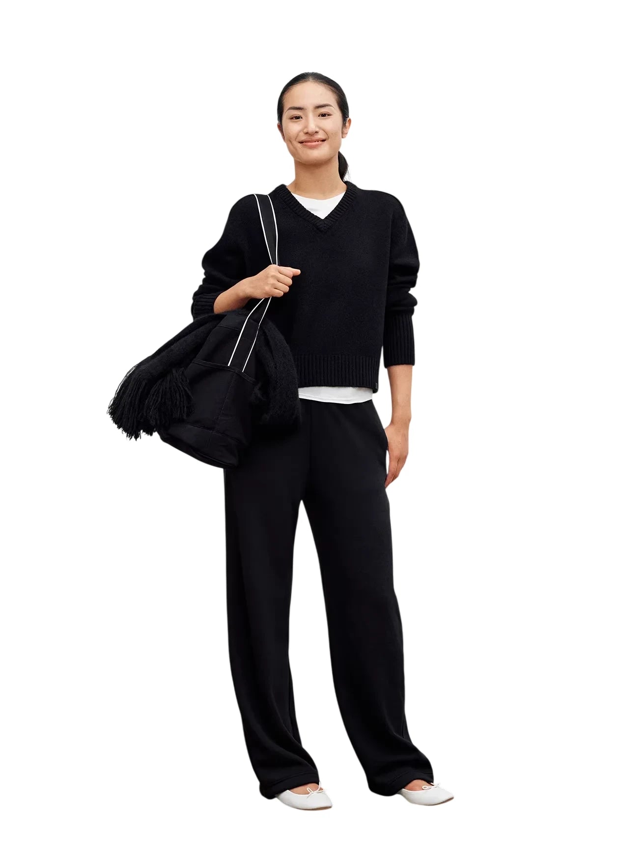 Stay cozy and stylish with this women's V-neck knitted sweater, perfect for cool-weather workwear. Crafted in a soft black knit, it features ribbed cuffs and hem for a refined finish. The short, relaxed-fit design makes it an ideal layering piece over shirts or tees. Pair it effortlessly with black pants for a chic monochromatic look.