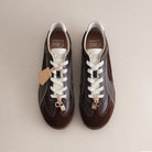 Step into timeless style with these retro-inspired women's sneakers in a striking dark walnut colorway. Featuring wave-like stitching details, contrasting white laces, and a comfortable cushioned sole, these versatile casual shoes are perfect for daily wear. Designed for both fashion and comfort, they're a standout addition to any wardrobe.