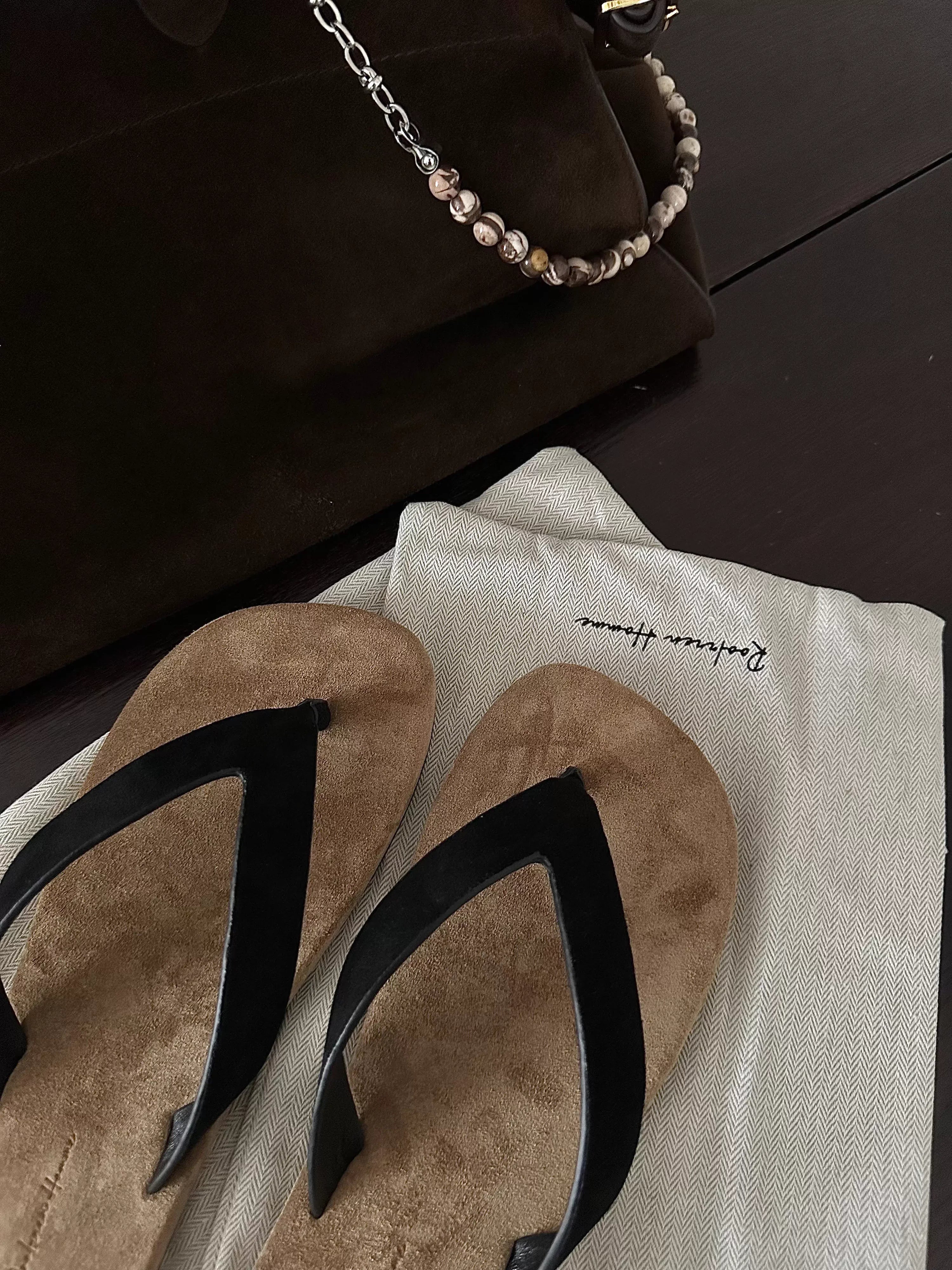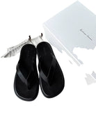 Elevate your casual footwear with these women's flat flip flops, crafted from luxurious Italian calf suede for a soft and refined feel. Featuring a non-slip sole and minimalist thong design, these sandals blend comfort with effortless style. The light brown suede footbeds contrast elegantly with the glossy black straps, making them perfect for warm-weather wear or relaxed outings.