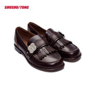 Step into the season with these fashionable 2025 winter loafers designed for women. Crafted in polished dark brown leather, these square-toe loafers feature elegant fringe detailing and a unique pairing of a metal flower buckle on one shoe and a standard buckle on the other. The low heel and slip-on construction offer both comfort and style, making them a standout addition to any wardrobe.