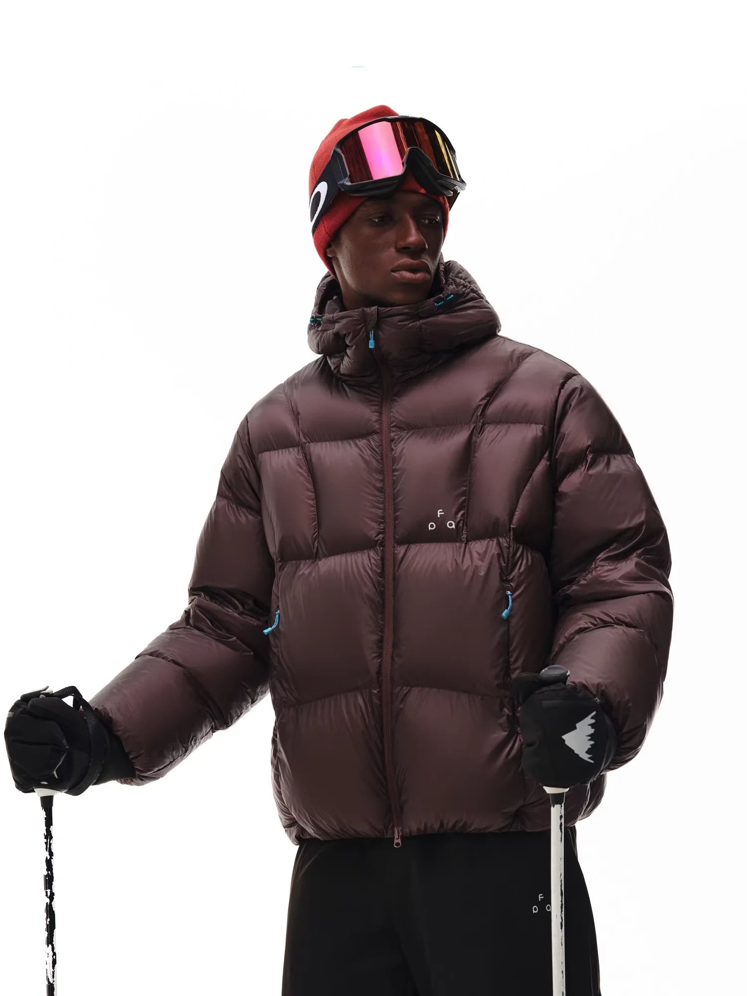 Filled with 95% white goose down and offering 800 fill power insulation, this jacket ensures exceptional heat retention without adding bulk. It features a hooded design and a water-repellent finish rated at level 4, making it ideal for snowy and wet conditions.