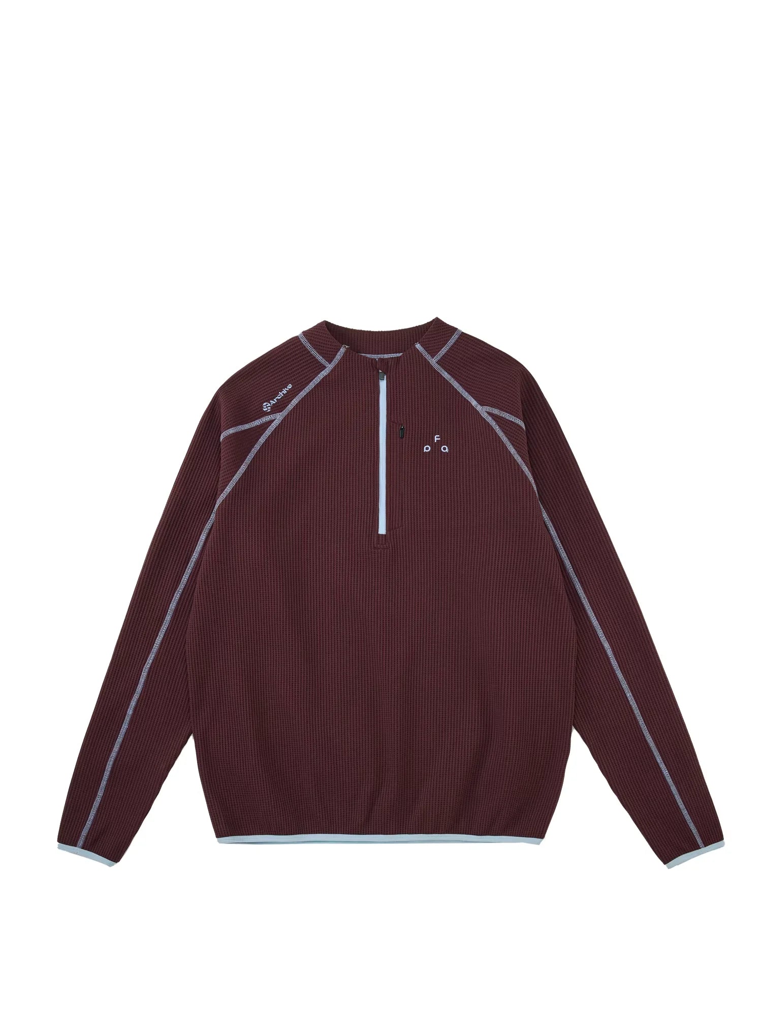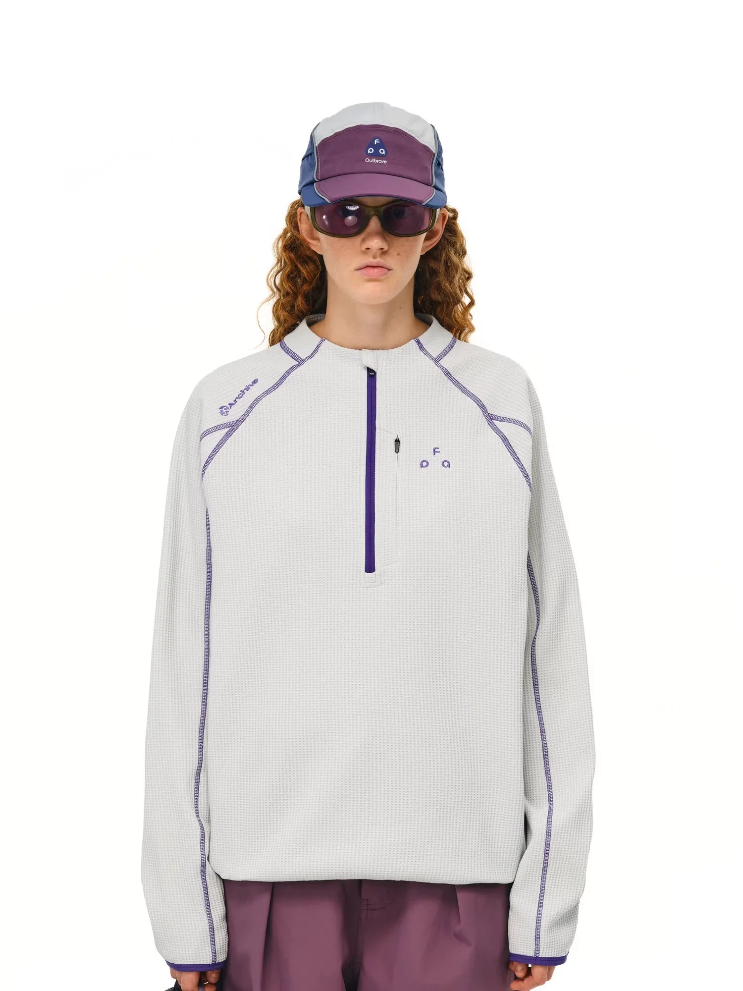 The shirt includes a half zipper for adjustable ventilation, a mock neck for added coverage, and a loose fit for ease of movement. Subtle seam detailing and high-performance functionality make it a stylish and practical choice.