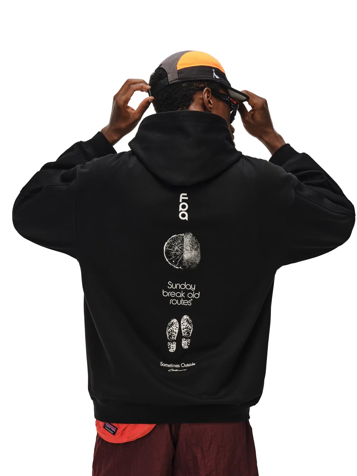 Stay stylish and warm with this autumn-ready outdoor sports hoodie. Designed for both casual wear and active lifestyles, this heavyweight hoodie features eye-catching graphics and thoughtful slogans like "Sunday break old routes" and "Sometimes Outside" printed across the back. With artistic illustrations including a moon and footprints, it adds a creative flair to your wardrobe.