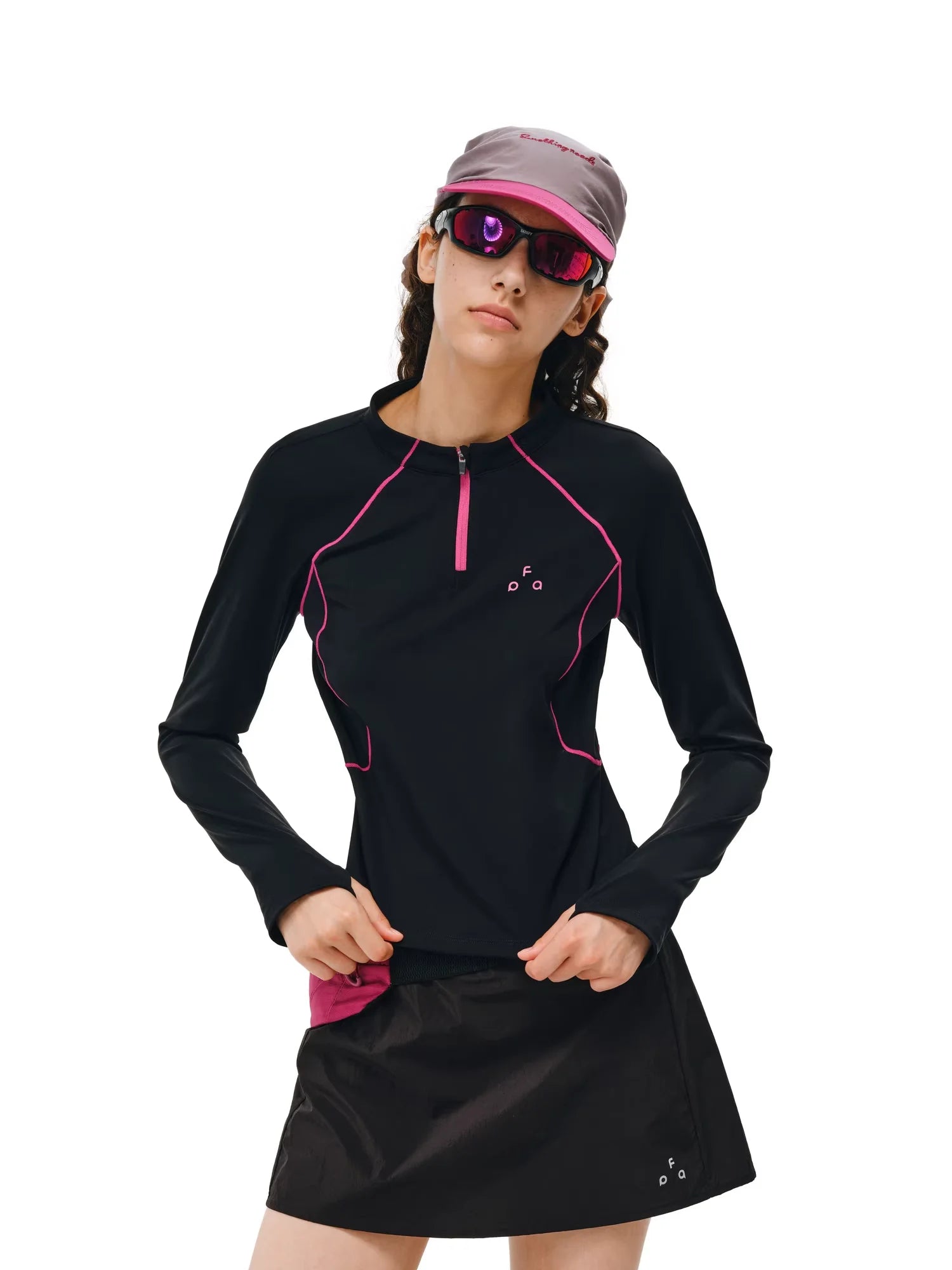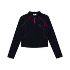Stay active and stylish with this women's long sleeve athletic T-shirt, designed with a sleek black finish and vibrant pink piping along the seams. Featuring a half-zip front and slim fit silhouette, this top is perfect for outdoor workouts, casual wear, or street-style looks during the spring and autumn seasons. Designed for comfort and performance, it includes a small chest logo and pairs well with sporty accessories for a complete activewear ensemble.