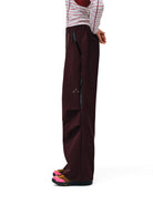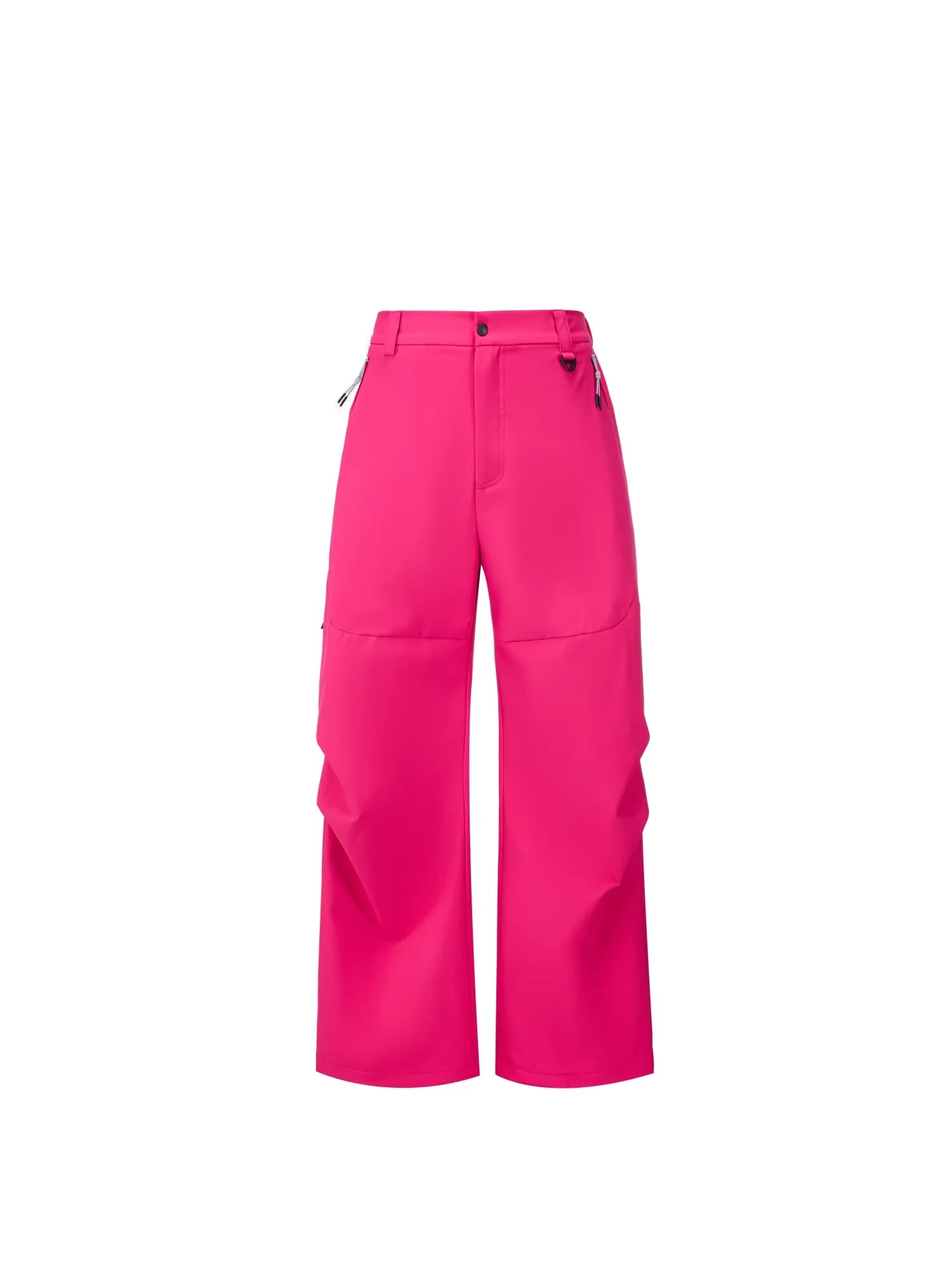 Featuring a wide-leg, relaxed fit and bright pink color, they include practical elements like thigh side zippers with snap button detailing for adjustable ventilation or style. An elastic waistband with drawstring closure ensures a customizable fit, making them suitable for various activities.