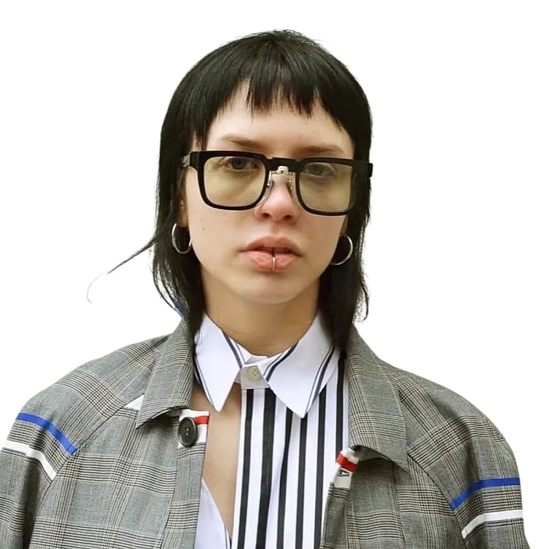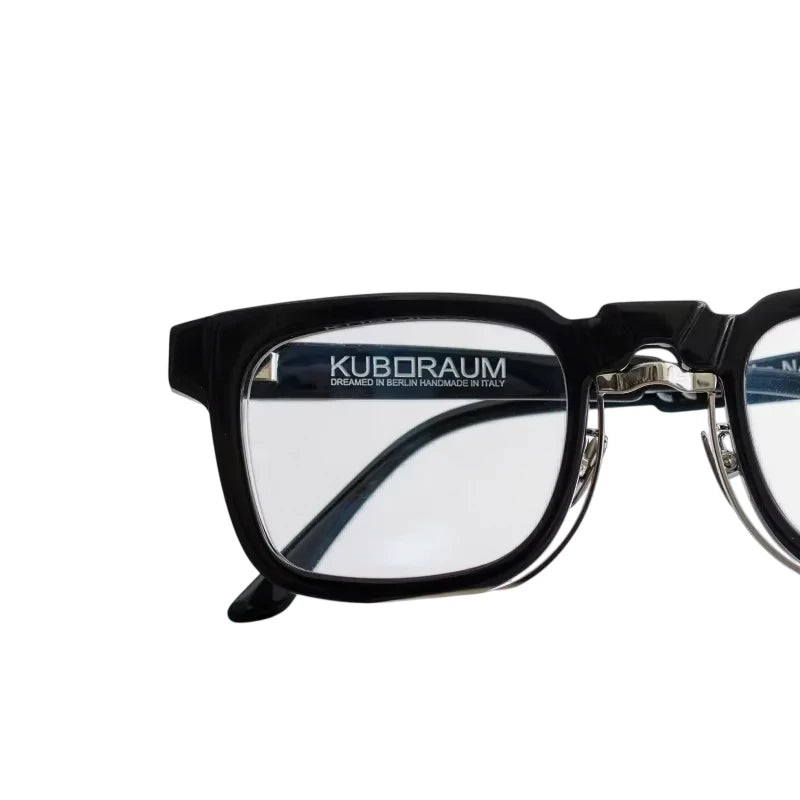 Experience a bold fusion of vintage and modern design with these avant-garde square-frame glasses for men and women. Crafted from glossy black acetate, the frames feature slightly thickened rims and a refined metallic bridge, offering an innovative and deconstructed aesthetic. Handmade with artisanal care, these glasses combine distinctive style with everyday function.