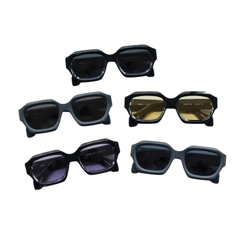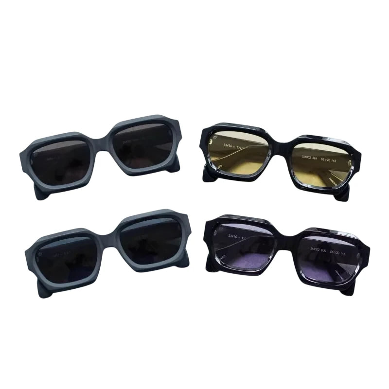 Make a bold style statement with these futuristic fashion sunglasses, designed for both men and women. Featuring chunky geometric frames in sleek shades of black and dark grey, these sunglasses offer a modern, edgy look. The slightly tinted lenses are available in black, yellow, and purple, adding a unique flair to each pair. Perfect for those seeking statement eyewear with a contemporary design.