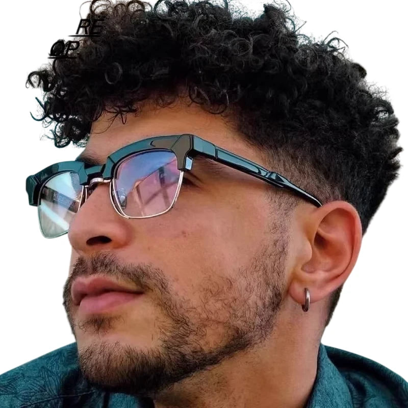 Discover modern sophistication with these futuristic half-frame browline glasses and sunglasses designed for both men and women. Featuring a bold black upper frame paired with sleek metallic rims, this eyewear offers a refined twist on the classic clubmaster style. Perfect for elevating everyday looks or making a fashion statement.