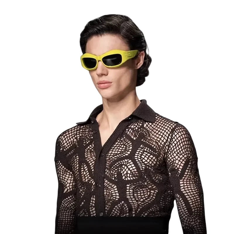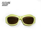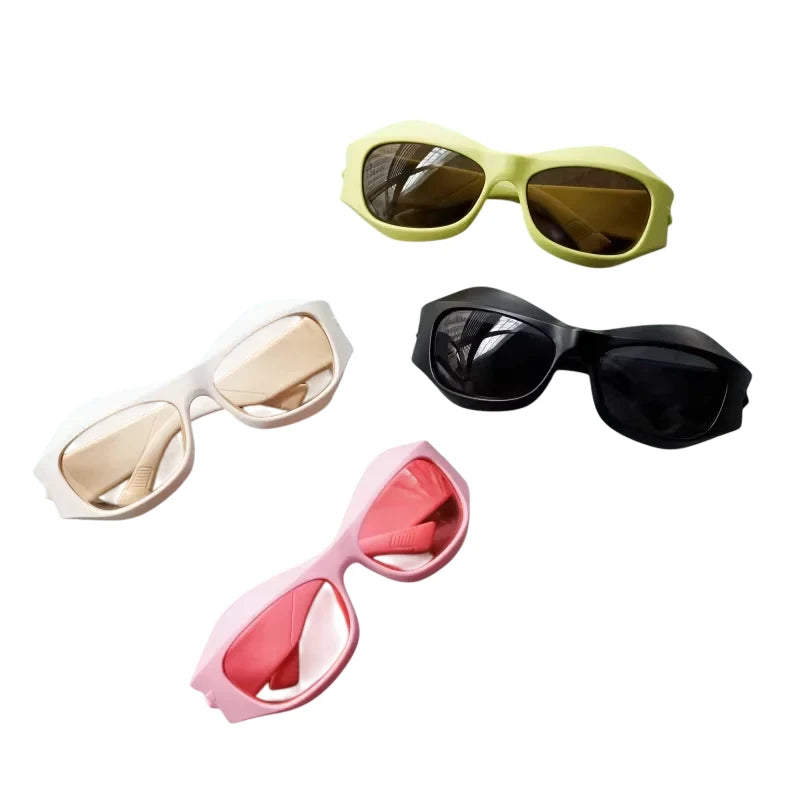 Make a bold fashion statement with these futuristic irregular oval sunglasses, designed for unisex wear. Featuring thick, retro-inspired frames, this collection includes four vibrant color options: lime green with brown lenses, black with dark lenses, beige with tan lenses, and bubblegum pink with rose-tinted lenses. Each pair combines modern design with a playful touch, perfect for casual outings or fashion-forward styling. The tinted lenses not only add style but also provide a unique look tailored to your vibe.