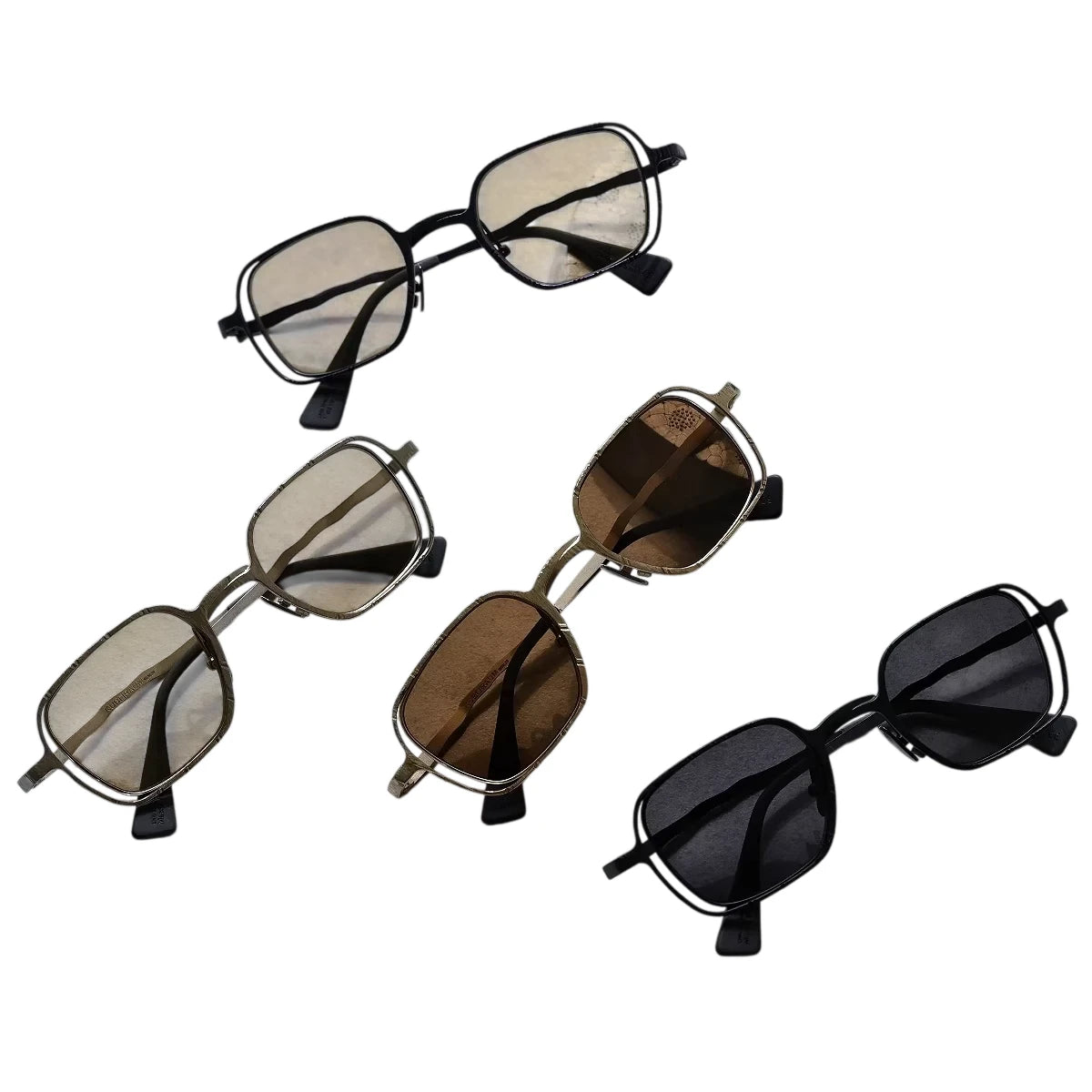 Elevate your eyewear collection with these high-end men's rectangular sunglasses frames, featuring a distinctive hammered texture design for a refined yet avant-garde look. The frames are offered in a selection of elegant color combinations, including classic black, gold with brown lenses, silver with tinted lenses, and matte black. Combining modern minimalism with a retro-inspired flair, these sunglasses are an ideal accessory for the fashion-conscious man seeking both sophistication and statement style.