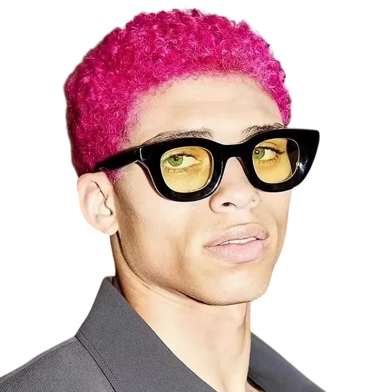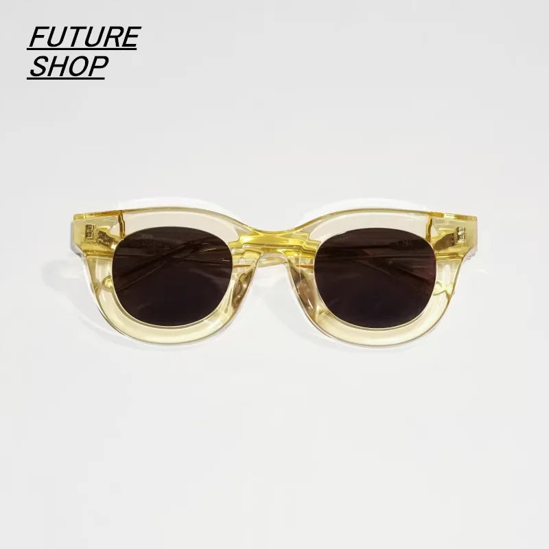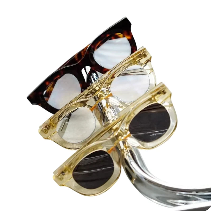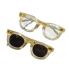 Elevate your eyewear collection with this pair of oversized, 3D design glasses suitable for both men and women. Featuring a bold, rounded frame in a translucent yellow-gold hue, these eyeglasses come with interchangeable lens options — clear prescription lenses and dark-tinted lenses for sun protection.