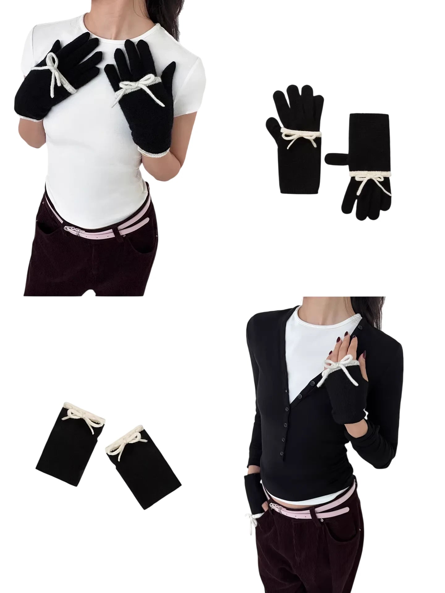 The set includes two color combinations: light blue with a brown bow and black with a white bow. These gloves provide both elegance and cozy insulation, making them a perfect accessory for colder weather.