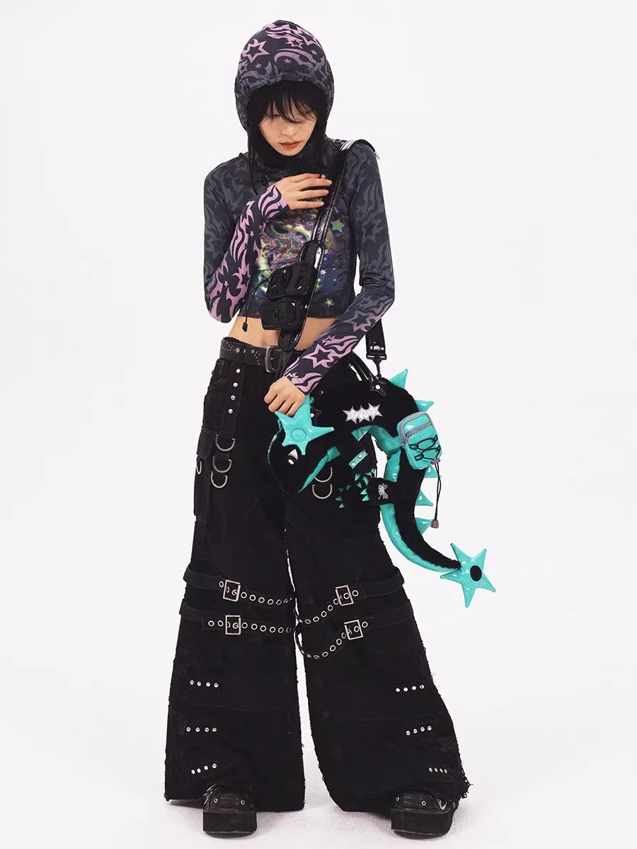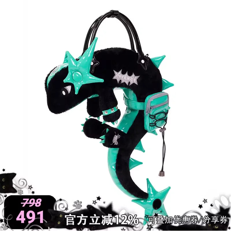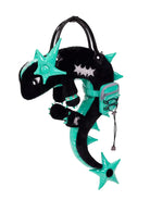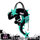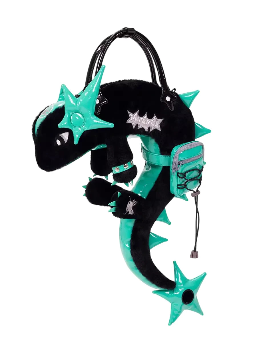 Make a bold fashion statement with this plush-style handbag designed in the shape of a stylized dinosaur or lizard. Featuring a predominantly black body accented by vibrant turquoise details, this unique accessory showcases shiny spikes along its head and tail for a rebellious, punk-inspired look.