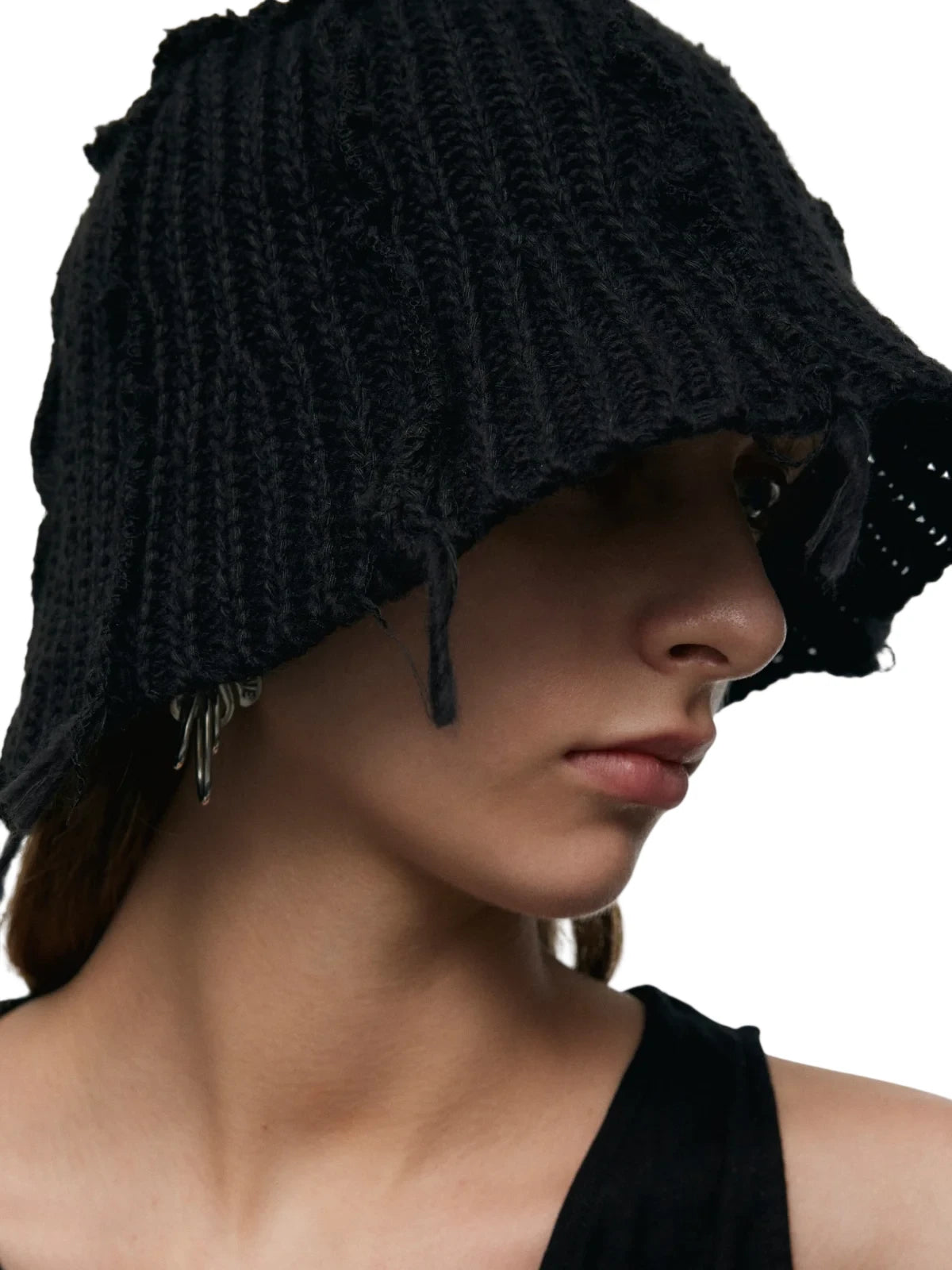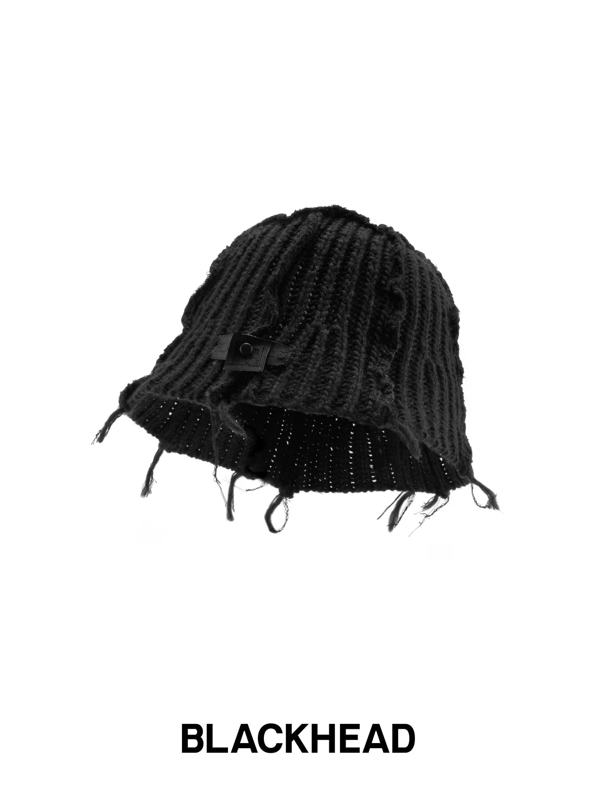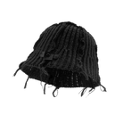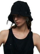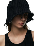 This chunky knit bucket hat features a unique tassel design, exuding a casual and individualistic street style. The black chunky knit construction has a subtle distressed and frayed edge effect, showcasing a unique vintage texture. Black webbing with metal eyelets on the sides adds a utilitarian touch. The unisex design makes it suitable for both men and women.