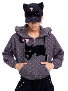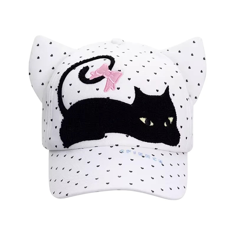 Add a touch of playful charm to your outfit with this whimsical unisex baseball cap. Designed in crisp white fabric, the cap features scattered black heart prints and a prominently embroidered black cat on the front, highlighted by vivid yellow eyes and a pink bow. Cute 3D cat ears top off the design for a fun, costume-inspired effect. Ideal for younger audiences and fans of quirky fashion, this cap brings personality to any casual look.