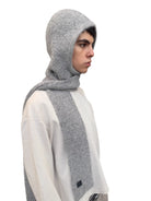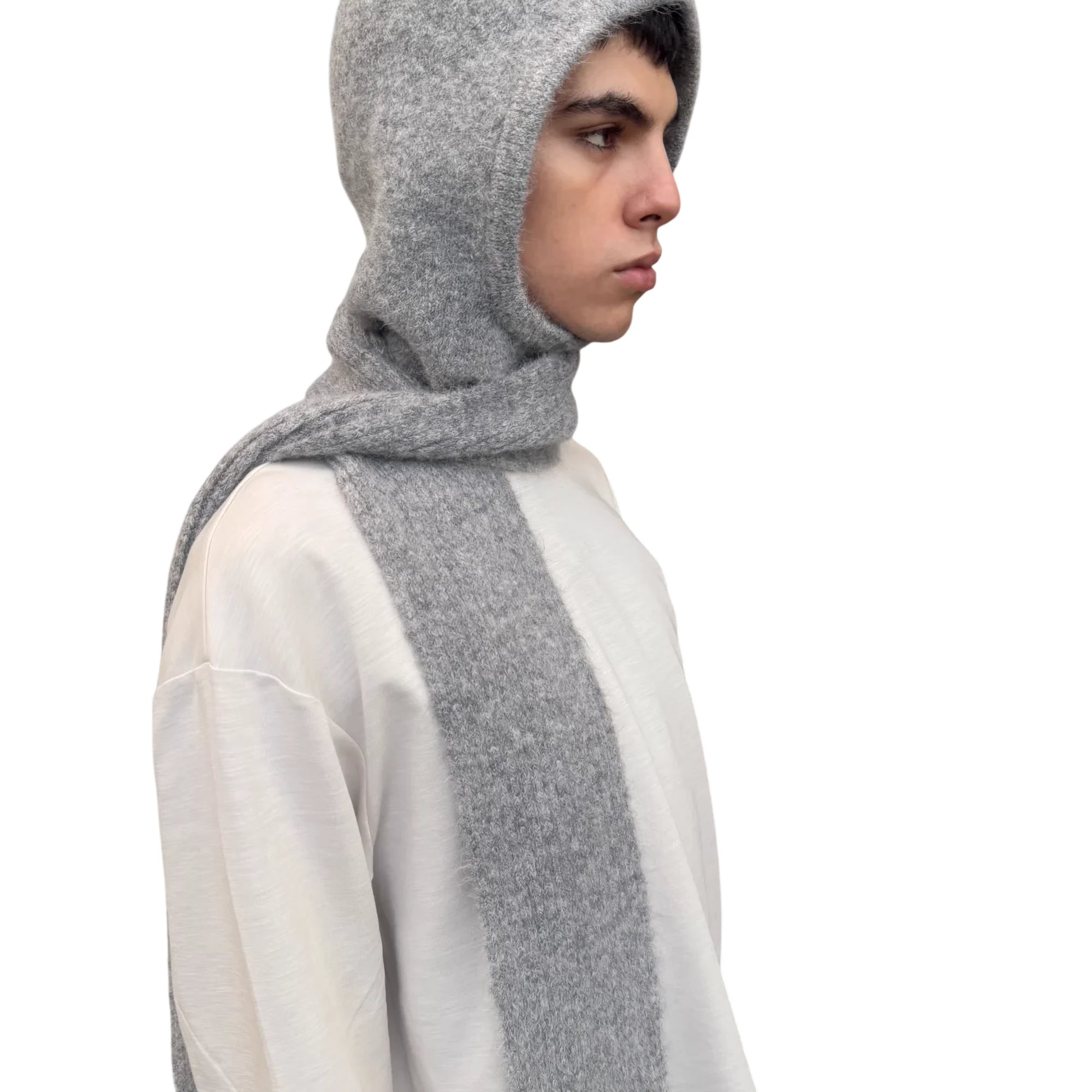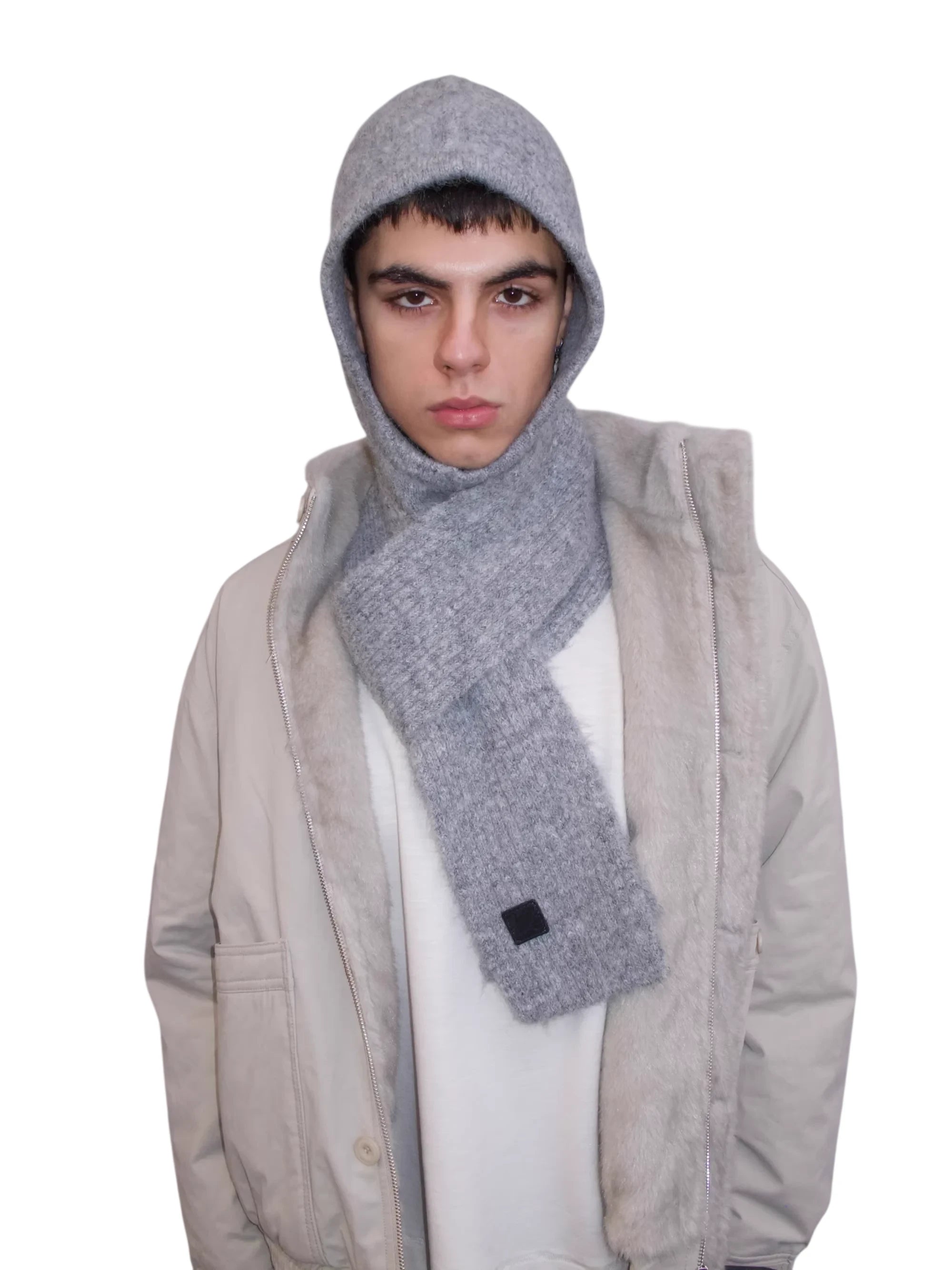 Stay warm and stylish with this cozy alpaca blend balaclava hood. Designed for autumn and winter, it features a soft, fuzzy knit texture that offers both insulation and comfort. The hooded scarf design wraps around the head and neck, making it perfect for cold-weather layering. Worn by a male model, this versatile accessory pairs effortlessly with casual or relaxed-fit outerwear.