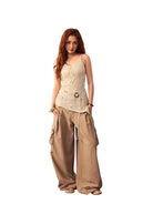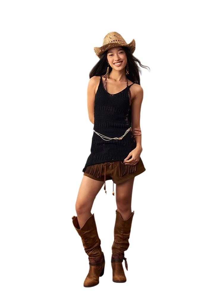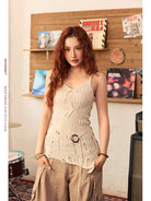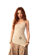 This women's sleeveless knit dress features an asymmetric, three-dimensional design with distressed detailing for a bold, modern look. The fitted silhouette includes a deep V-neckline and thin shoulder straps, adding a touch of elegance. A white beaded belt cinches the waist, enhancing the overall shape. Styled with a bohemian flair, this dress pairs well with casual accessories for a standout outfit.