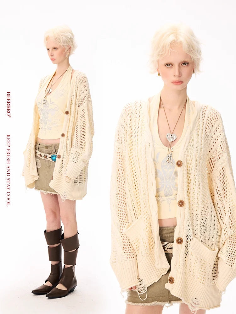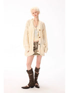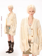 Elevate your casual wardrobe with this extra soft open-knit wool cardigan, designed for a relaxed and effortless look. The oversized fit and 3D eyelet knit pattern create a cozy texture, while large front pockets and wooden buttons add functionality and rustic charm. Styled on a female model, the cream cardigan pairs perfectly with laid-back boho-inspired outfits, making it a versatile choice for any season. Ideal for layering, it brings both comfort and style to your everyday ensemble.
