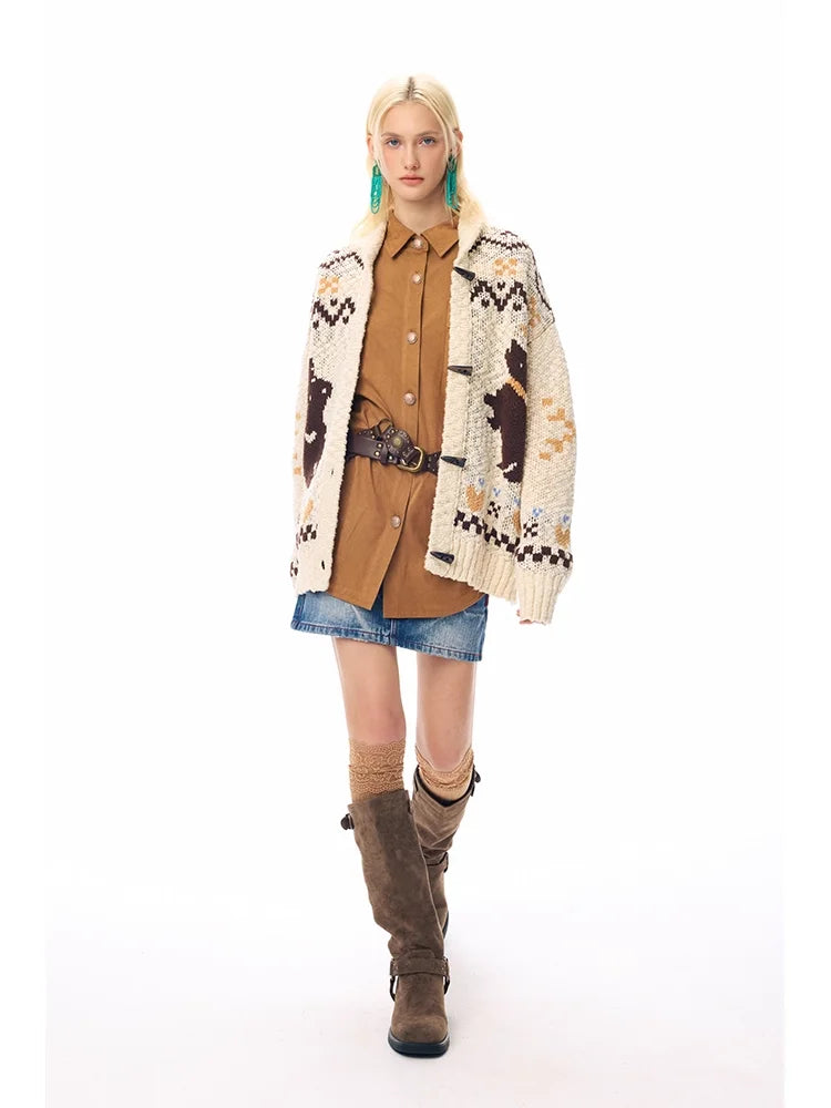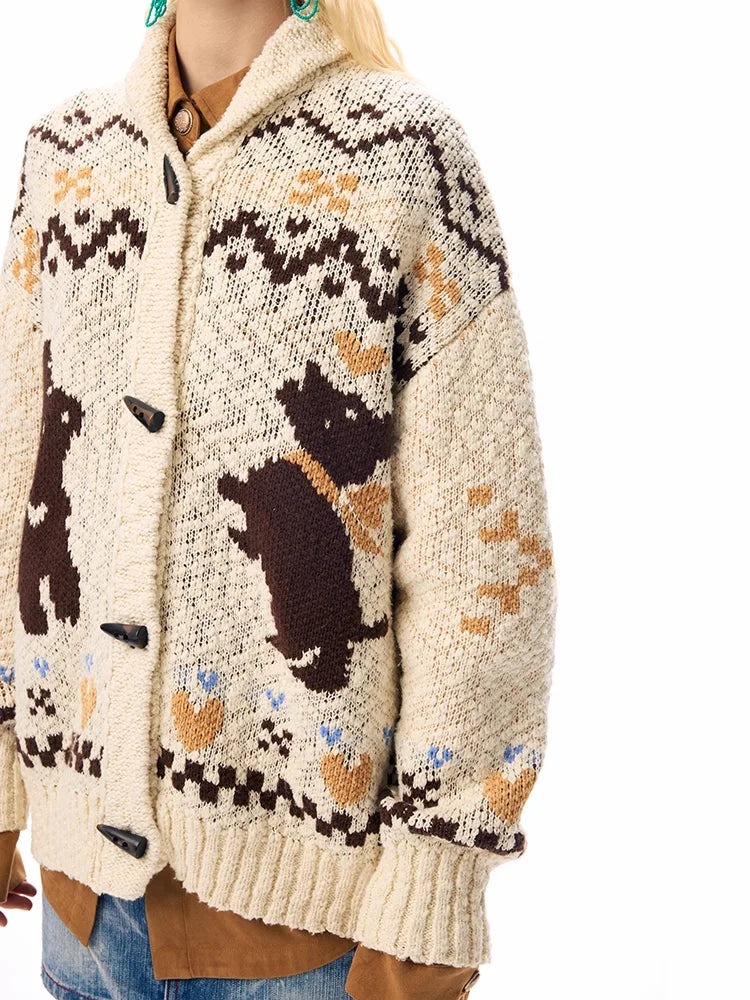This cozy and stylish jacquard knit cardigan for women features a charming bear motif and classic Fair Isle geometric patterns in neutral tones of cream, brown, and black. Designed with a chunky texture and toggle button closure, it delivers both warmth and playful sophistication. The oversized fit pairs effortlessly with casual or smart-casual ensembles for a distinctive seasonal look.