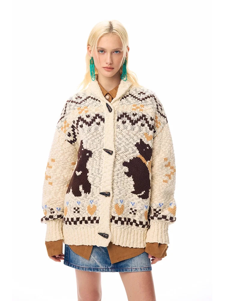 BeerBro Fair Isle Jacquard Knit Cardigan with Bear Motif for Women