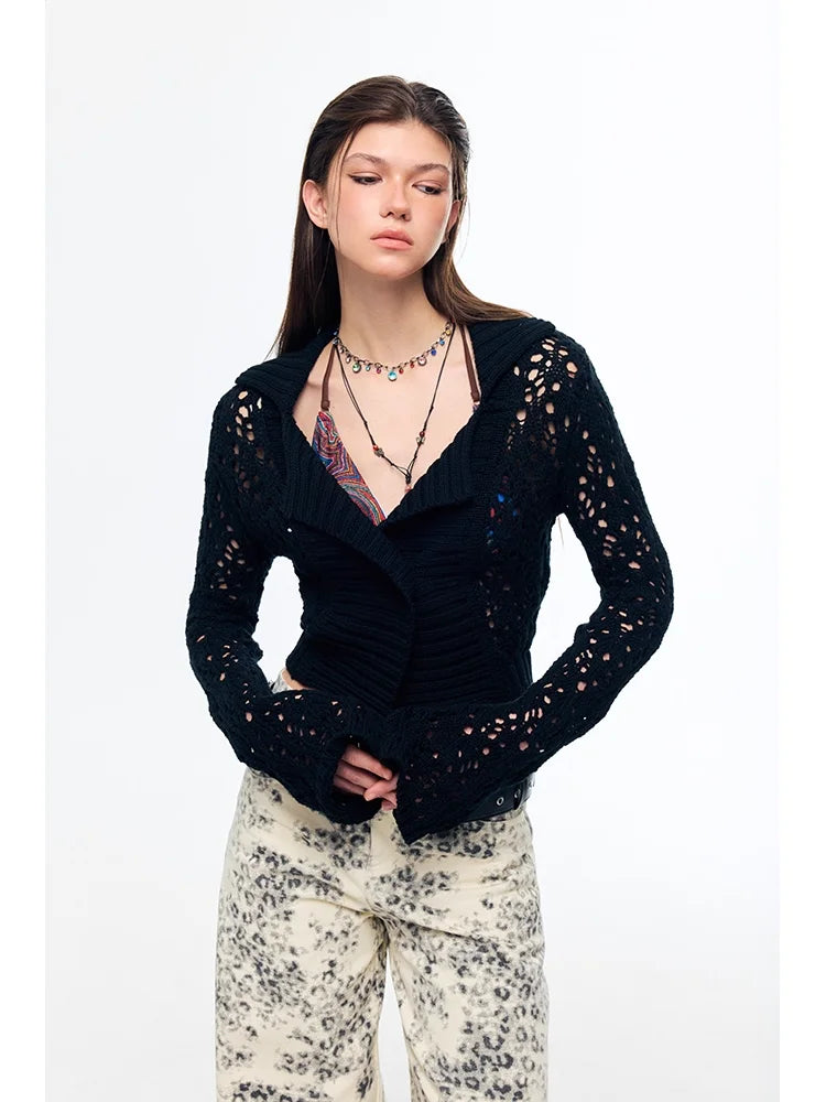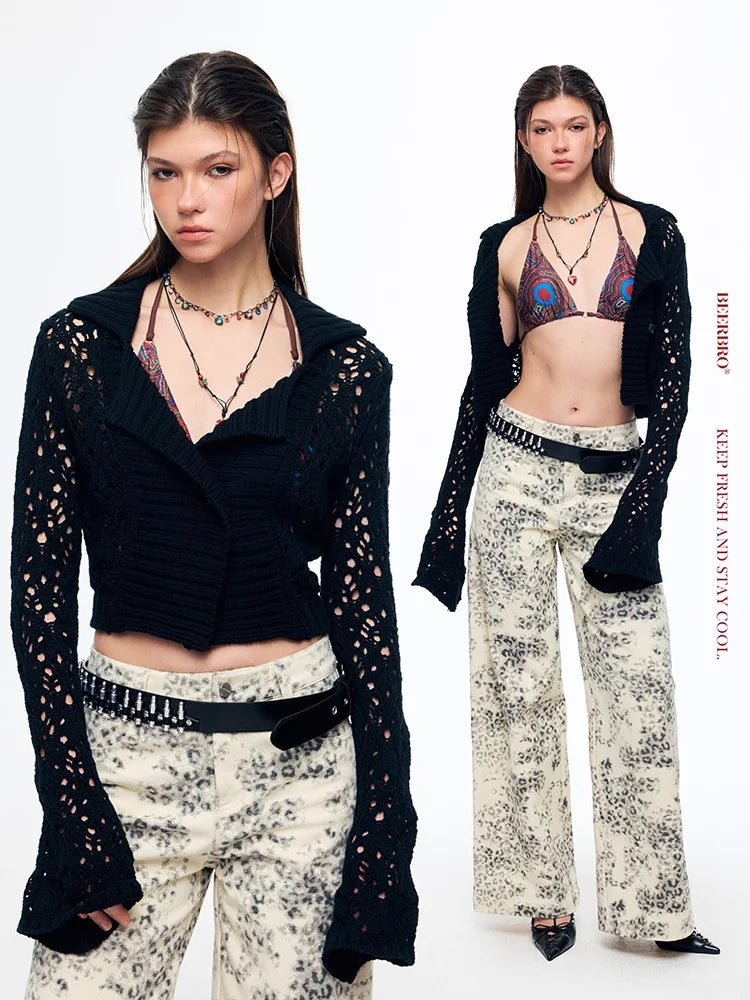 Elevate your streetwear style with this chic and modern cardigan sweater. Designed for women, it features a breathable open-knit construction with delicate floral patterns for an edgy yet feminine touch. The wide lapel and cropped fit add contemporary flair, making it perfect for layering over casual or trendy outfits. Long sleeves ensure added comfort, while the fitted silhouette flatters the figure. Pair it with high-waisted trousers or your favorite denim for a bold, fashion-forward look.