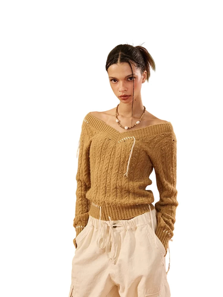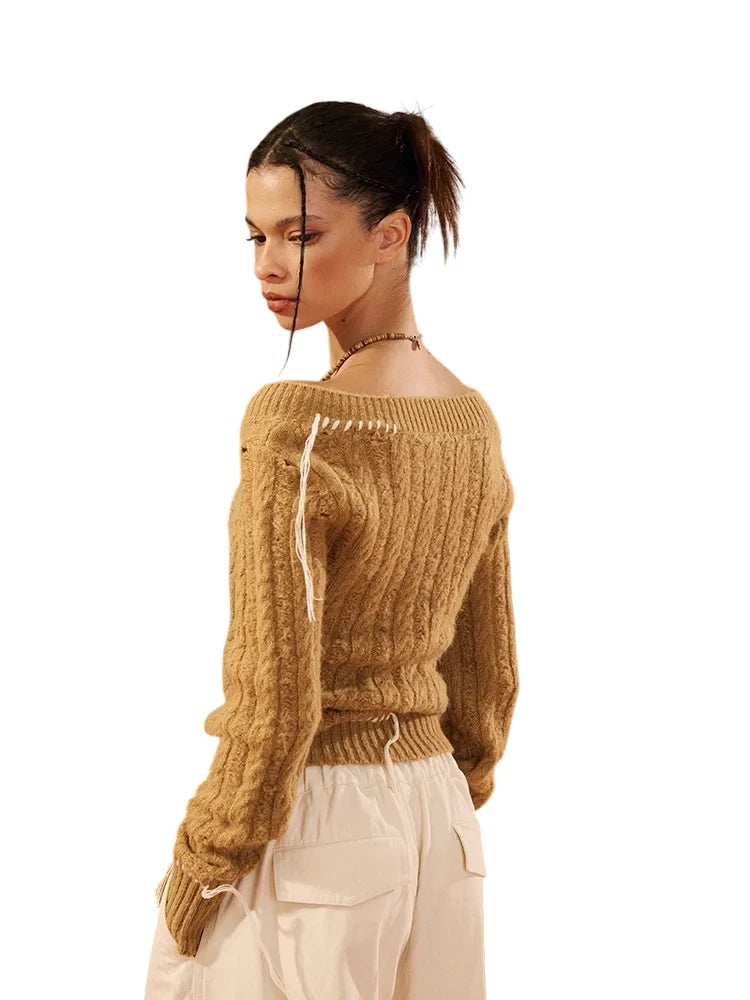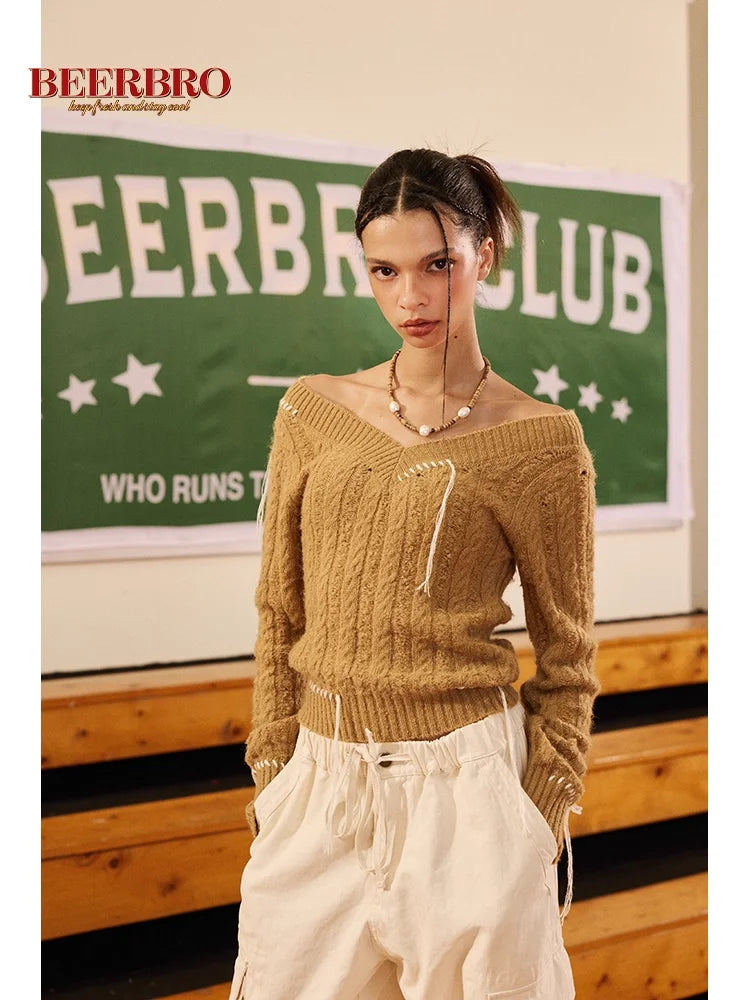 BeerBro Off-Shoulder Cable-Knit Sweater with Hand-Stitched Accents