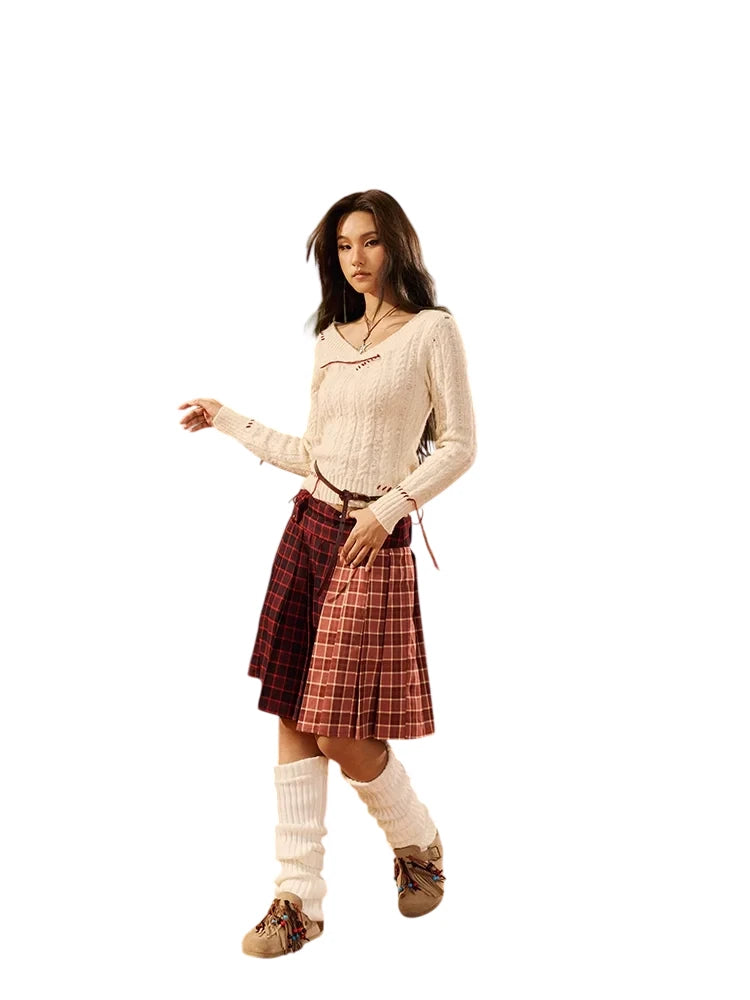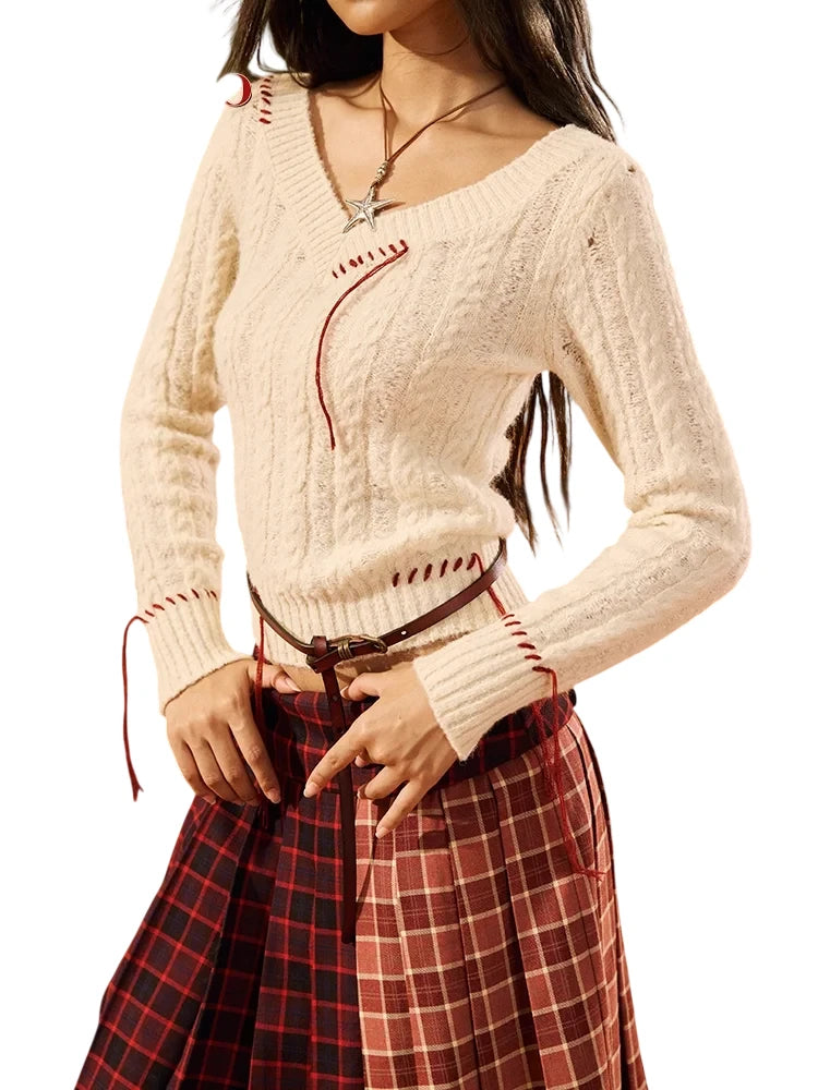 This women's off-shoulder sweater features a stylish cable-knit design in a soft cream color. Detailed with unique hand-stitched red accents along the collar and shoulders, it presents a modern interpretation of classic knitwear. The flattering silhouette is slightly fitted at the waist, making it perfect for autumn layering. Pair it effortlessly with skirts or jeans for a versatile, fashion-forward look.