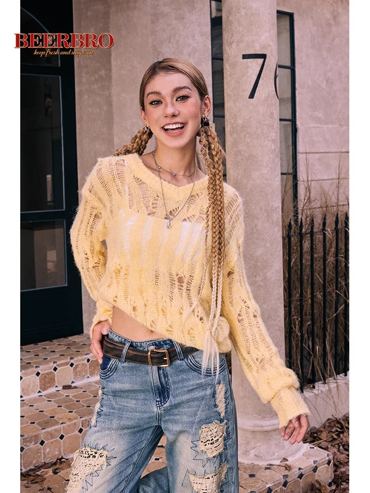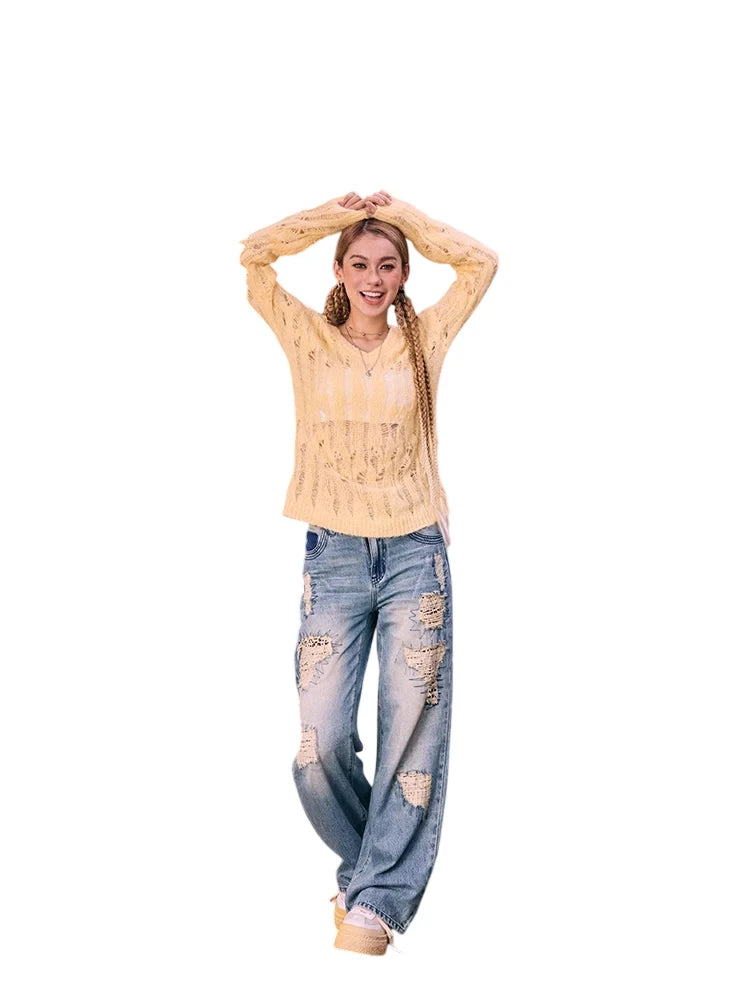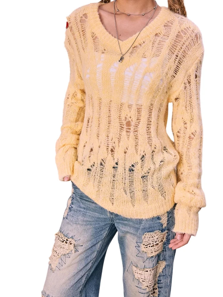 Stay effortlessly stylish with this casual V-neck pullover sweater crafted from soft mohair yarn. Featuring a relaxed, loose fit and a distressed, semi-sheer knit, this long sleeve top offers an edgy yet comfortable look. The wide neckline and slightly cropped silhouette make it a versatile piece for layering or pairing with high-waisted jeans. Designed for women who appreciate laid-back fashion with a hint of attitude.
