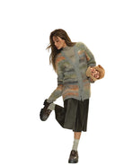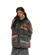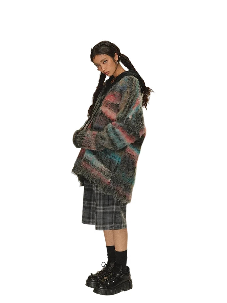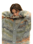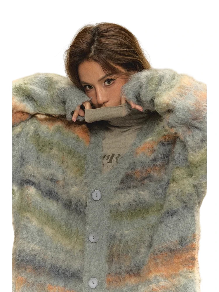 Stay cozy and stylish through the colder months with this women's loose knit cardigan. Designed with a soft, brushed texture, it features an eye-catching gradient pattern with irregular stripes in muted tones of light gray, moss green, and burnt orange. The cardigan comes with a flattering V-neckline and a button-down front, making it easy to layer over your favorite tops. Perfect for autumn and winter wear, this piece offers both comfort and charm.