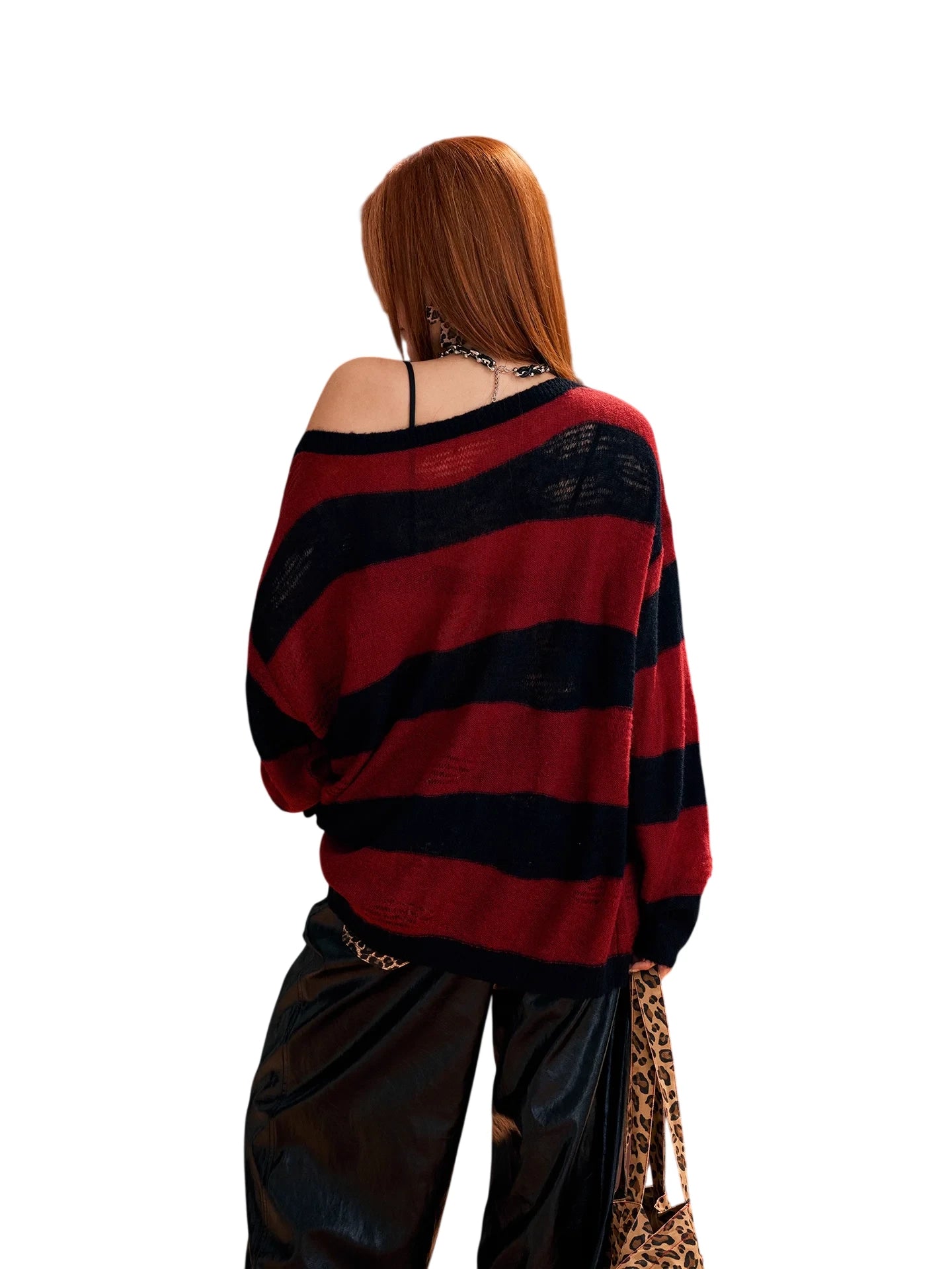 Make a bold statement with this off-shoulder black and red striped knit sweater for women. Featuring a grunge-inspired design with distressed details and torn accents, this sweater adds edge to any outfit. The prominent text across the chest enhances its punk aesthetic, while safety pin embellishments complete the rebellious look. Perfect for layering with leather pants or skirts, this sweater is ideal for those wanting to express a bold style with confidence.