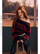 BeerBro Women's Off-Shoulder Black and Red Striped Knit Sweater