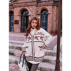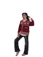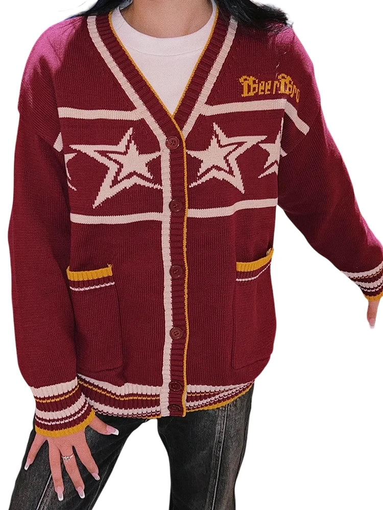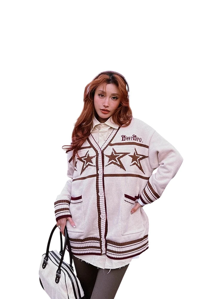 BeerBro Women's Retro V-Neck Star Knit Cardigan - Autumn Winter Loose Fit