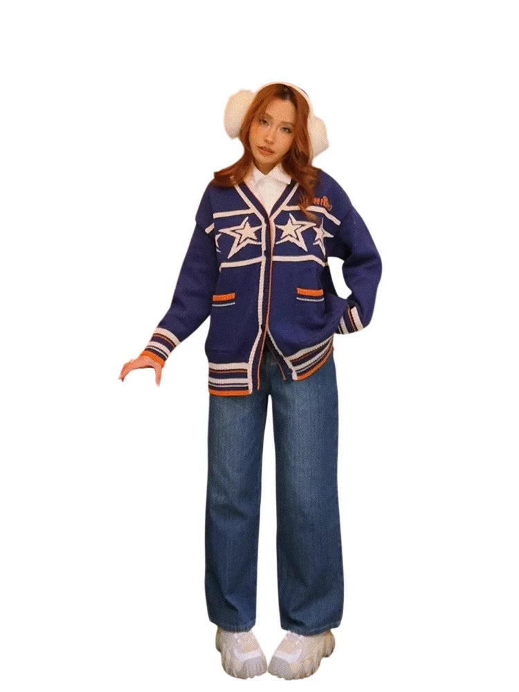 Stay warm and stylish with this women's retro V-neck knitted cardigan, perfect for autumn and winter seasons. Featuring a loose, laid-back fit for that effortless lazy look, this sweater stands out with bold white stars across the chest and sleeves. The contrast orange and white trim adds a pop of color, while the navy blue base keeps it classic. Ideal for layering over your favorite outfits, it's a cozy addition to any wardrobe.