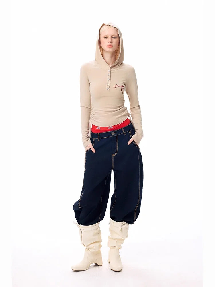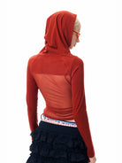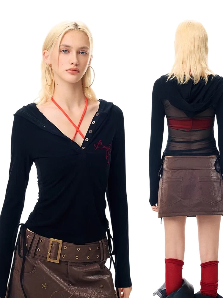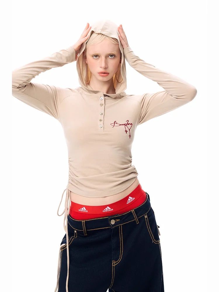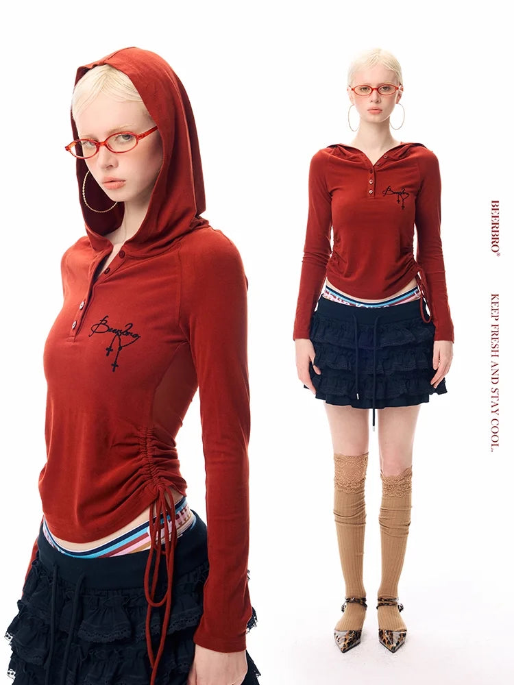 Elevate your casual wardrobe with this slim fit hooded sweater, designed for women and perfect for autumn and spring wear. Crafted from cozy brushed knit fabric, this stylish top features a rich deep red hue, long sleeves, and a half button-up front. The unique drawstring ruching on the side adds a fashionable, adjustable fit, while subtle embroidered detailing lends a refined touch. Ideal for layering or wearing on its own, this sweater blends comfort with contemporary style.