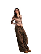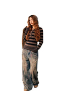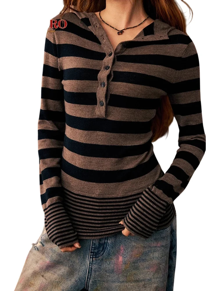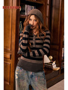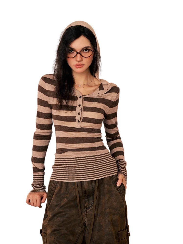 Stay warm and stylish during the autumn and winter seasons with this slim-fit wool knit base layer for women. Featuring a classic horizontal stripe pattern in black and brown, this long-sleeve top includes a button-up henley neckline and extended sleeves with thumbholes for added comfort and layering. The attached or layered hood adds a cozy touch, perfect for casual wear. Pair it with your favorite jeans for a laid-back, effortlessly chic look.