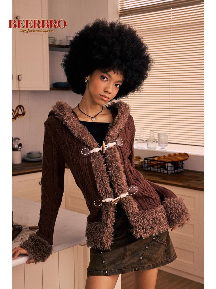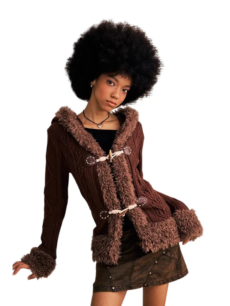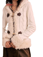 Stay warm and stylish this winter with this thickened twist knit hooded cardigan designed for women. Featuring a cozy faux-fur trim along the hood, cuffs, and hem, and accented with charming brown toggles, this cardigan blends comfort with rustic elegance. Perfect for layering, it's ideal for chilly indoor or outdoor settings, offering both functionality and fashionable appeal.