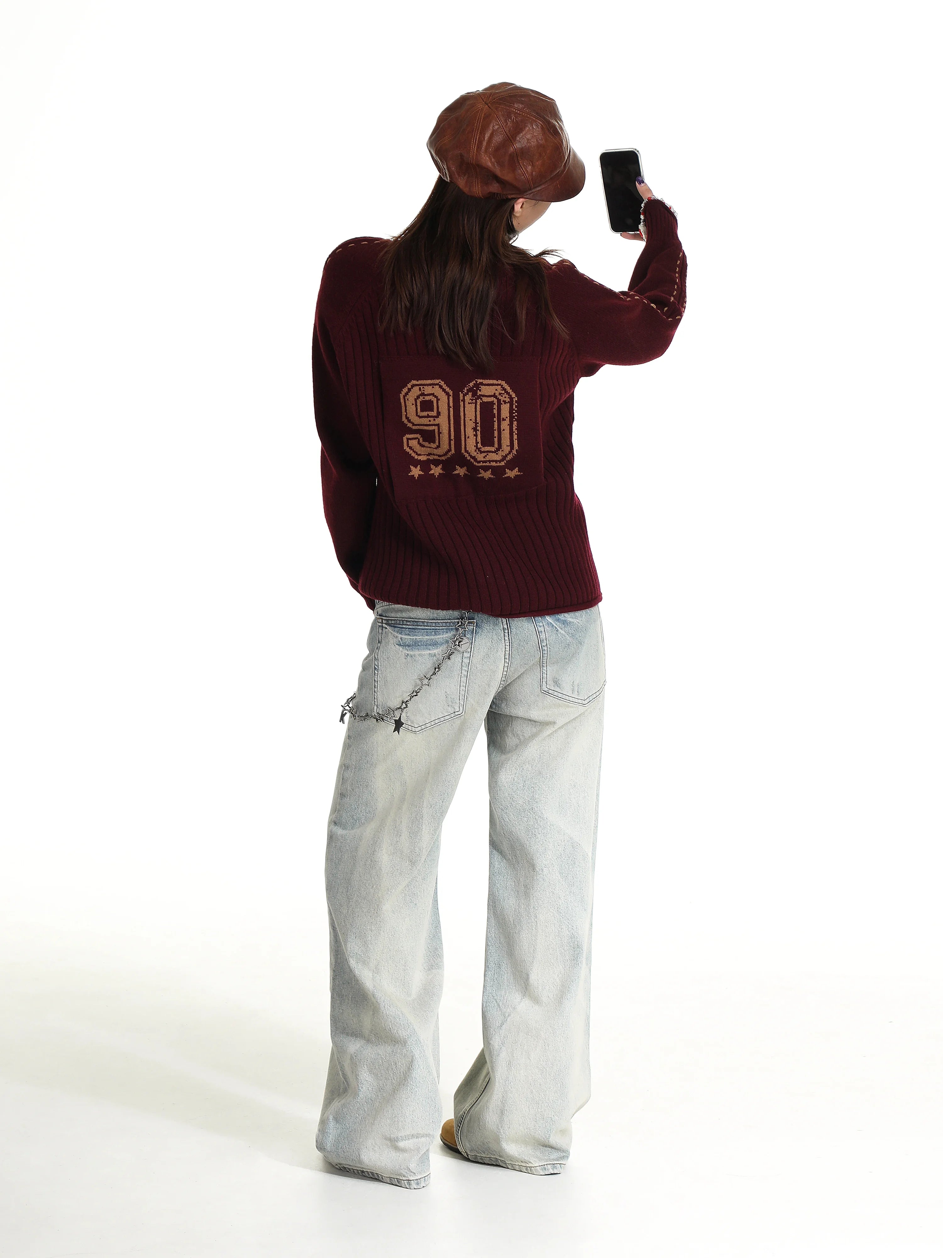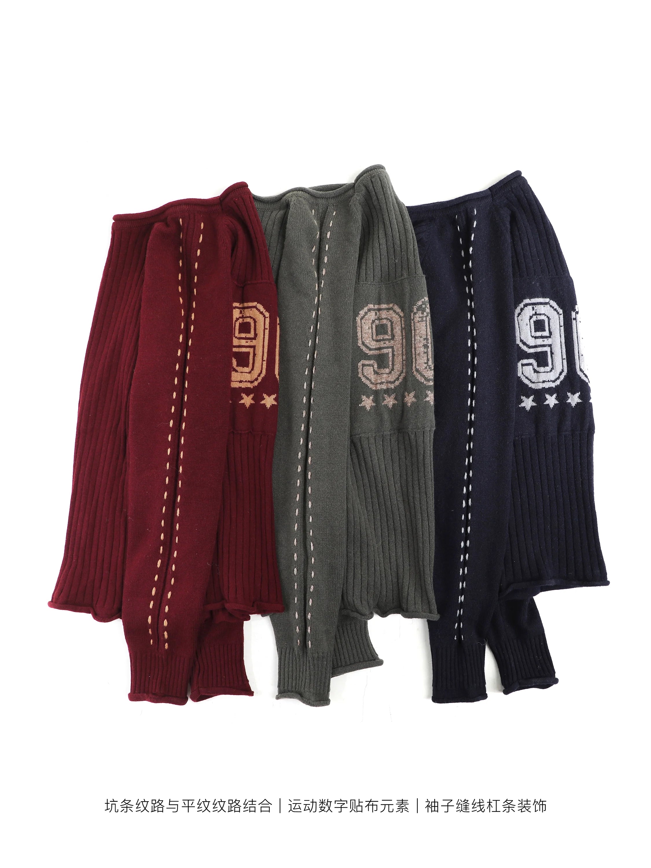 This unisex crew neck sweater features a ribbed knit texture and is available in three classic colors: burgundy, olive green, and navy blue. Each sleeve is adorned with an embroidered '90' patch and three stars near the upper arm, along with a contrasting dotted stitch detail running vertically. The design combines sporty aesthetics with cozy knitwear, making it a versatile piece for any casual wardrobe.