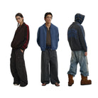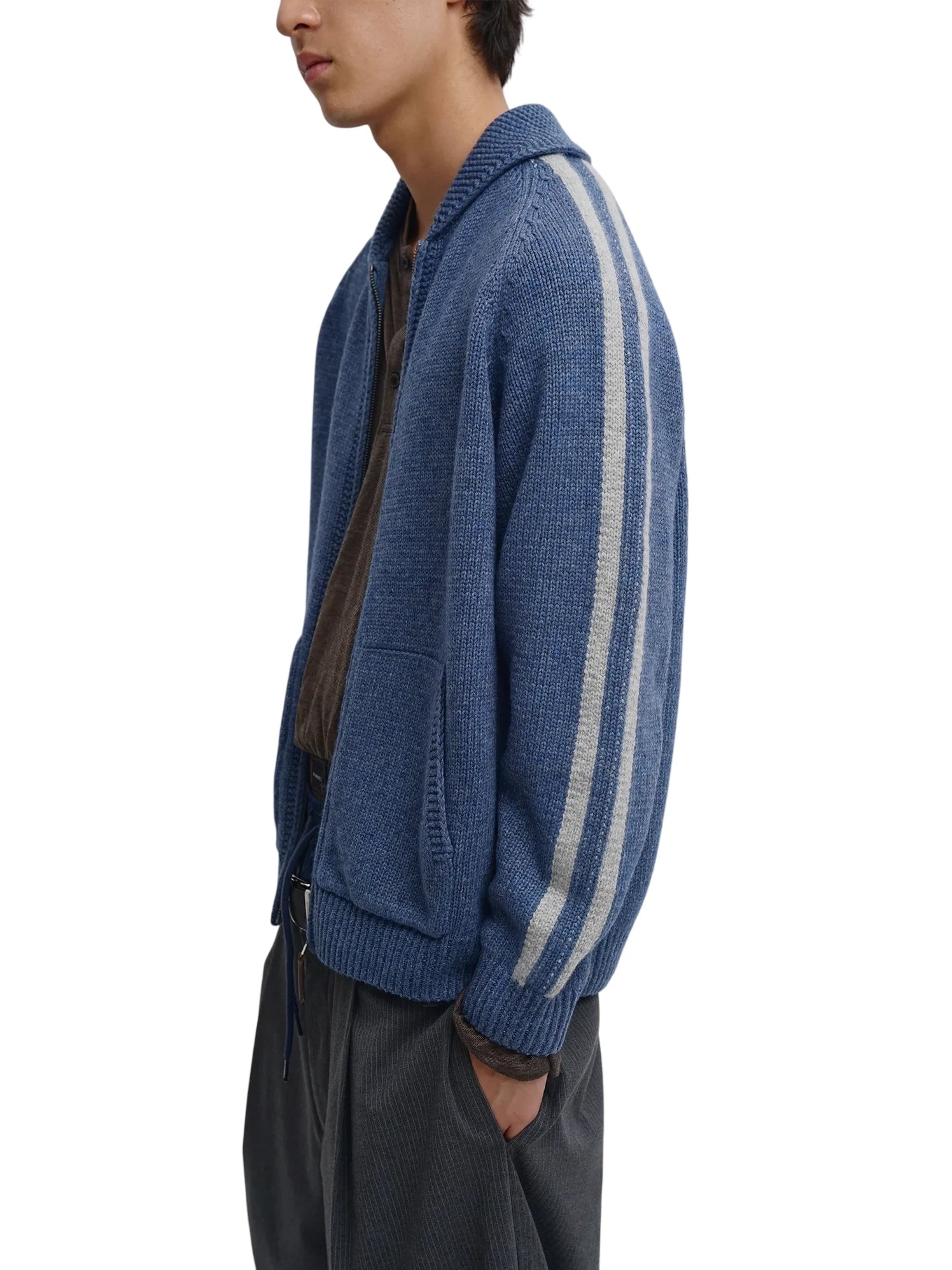 This autumn-ready cardigan sweater features a varsity-inspired design with bold letter accents. Made from full wool, it offers both warmth and style for cooler weather. The unisex design is highlighted by its zip-up front, vibrant color-block stripes, and oversized fit—ideal for relaxed, streetwear looks. A statement piece for layering, it pairs effortlessly with cargo pants, wide trousers, or denim for a casual and comfortable outfit.