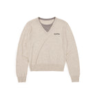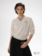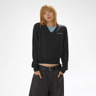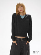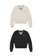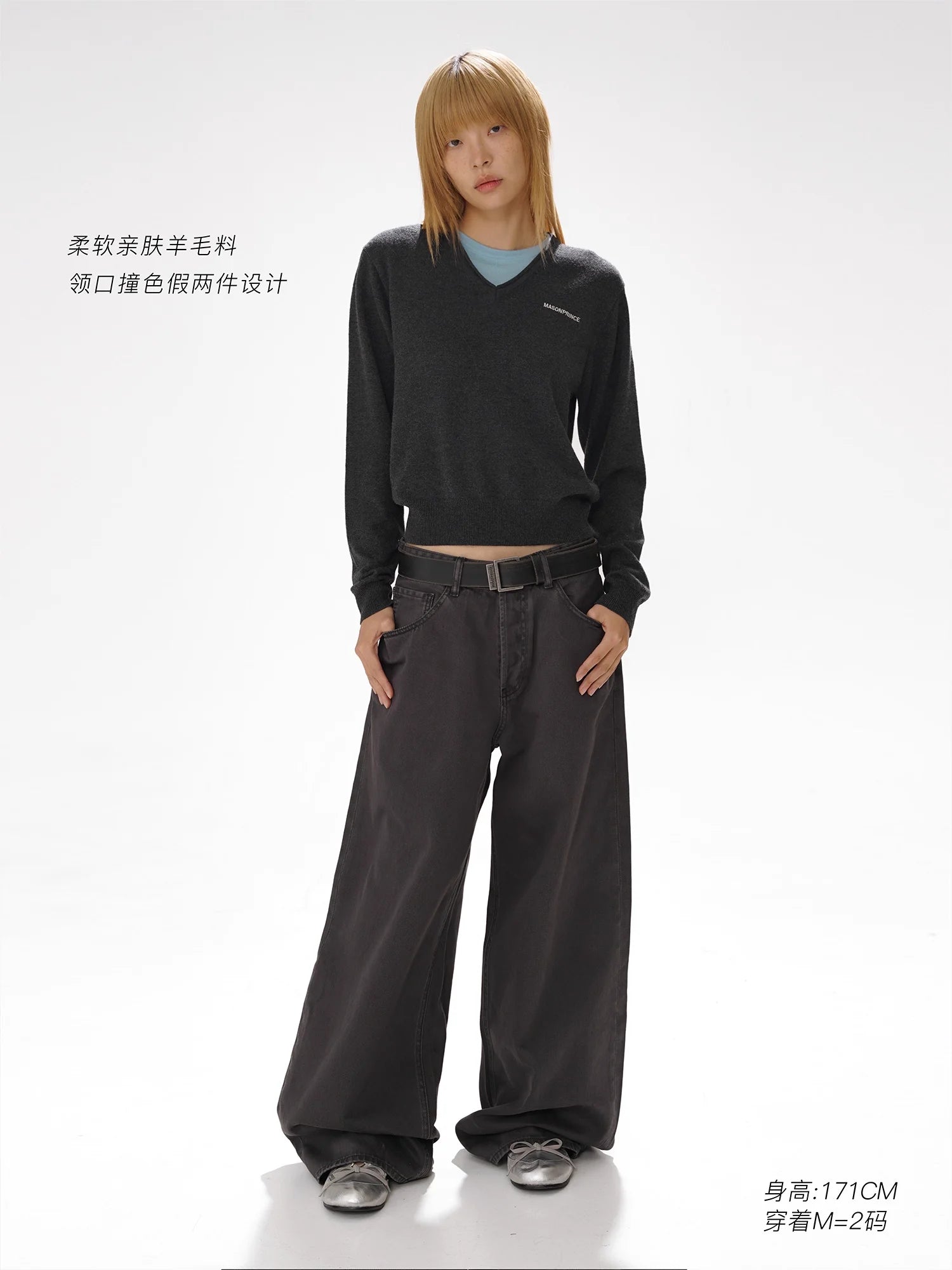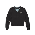 This women's charcoal grey V-neck sweater features a stylish color-blocked faux two-piece design with a relaxed silhouette. Embroidered detailing on the chest adds a subtle touch of elegance, while a peek of light blue crew-neck lining enhances the layered look. Long sleeves and soft wool construction make it a versatile and comfortable addition to any spring wardrobe.
