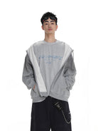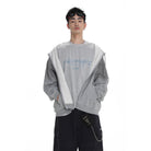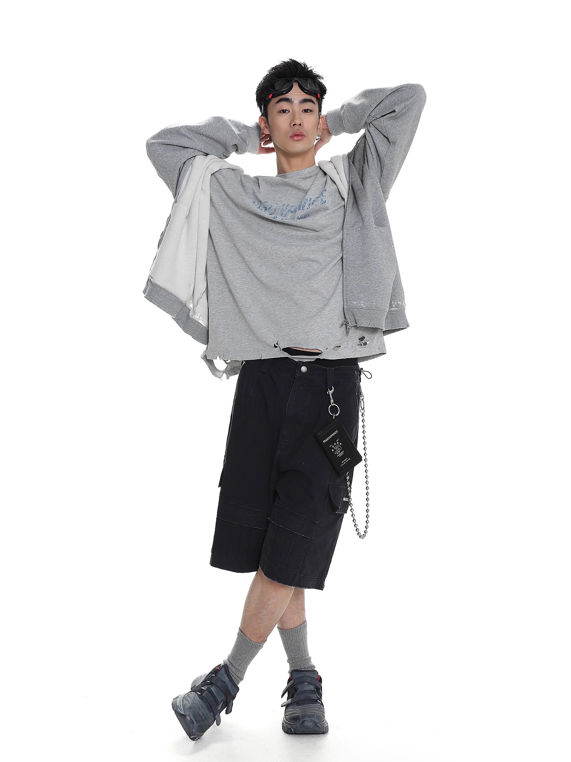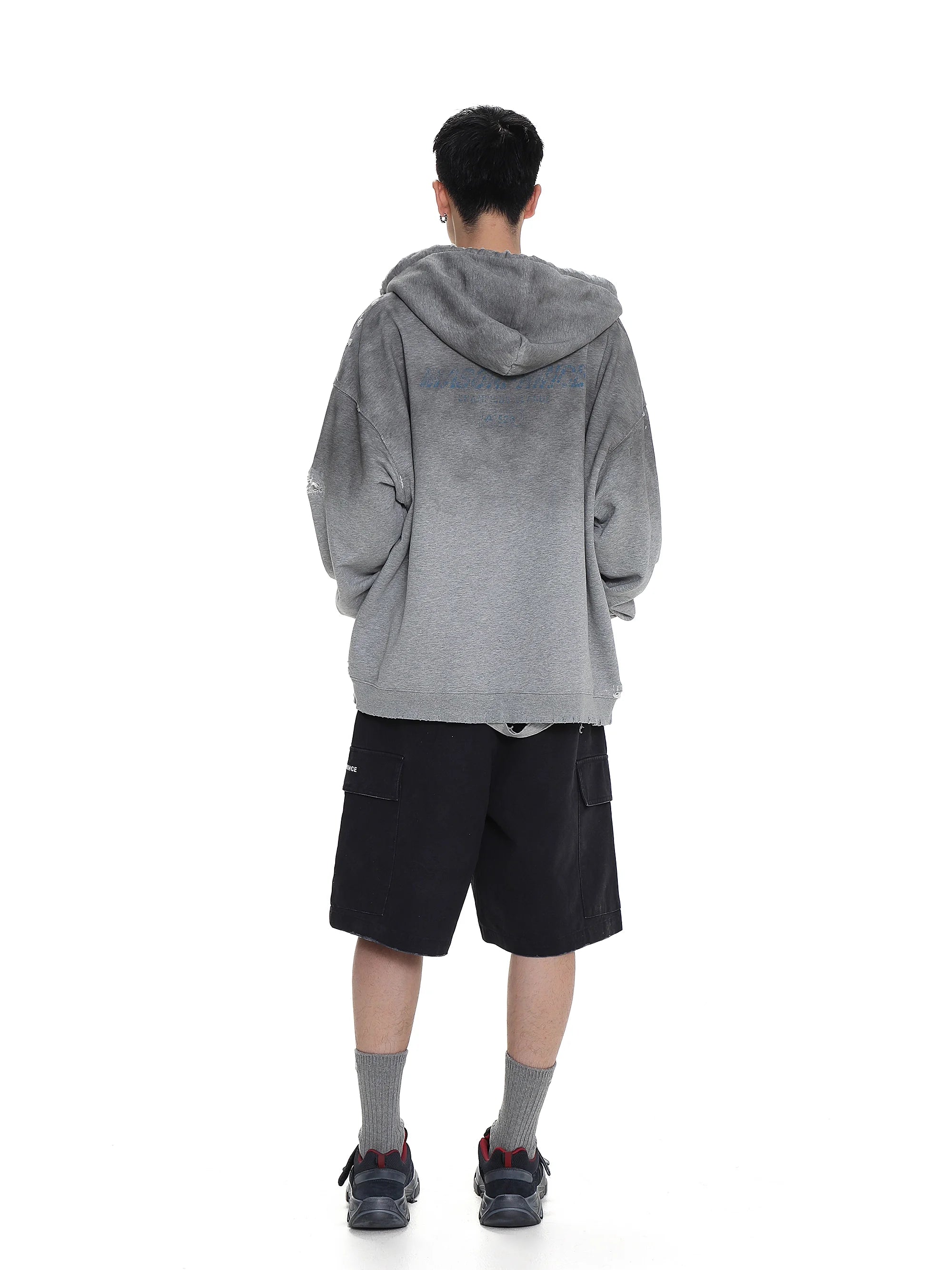 This men's distressed zip-up hoodie jacket blends vintage charm with modern street style. Featuring a soft fleece lining for extra comfort, it is worn draped over the shoulders to create a laid-back layered look. The piece completes an urban outfit when paired with casual staples like graphic sweatshirts and cargo pants.