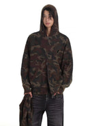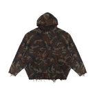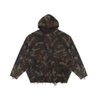 This men's zip-up hoodie showcases a rugged woodland camouflage print in shades of green, brown, and black. Crafted from a double-layered knit material with a cotton-like texture, it offers comfort and durability. The design features a front zipper closure, two functional front pockets, and a hood with subtle rib-knit trim. Distressed edges on the hem and cuffs add a worn-in, streetwear-inspired look. A leather patch detail on the chest completes the urban aesthetic.