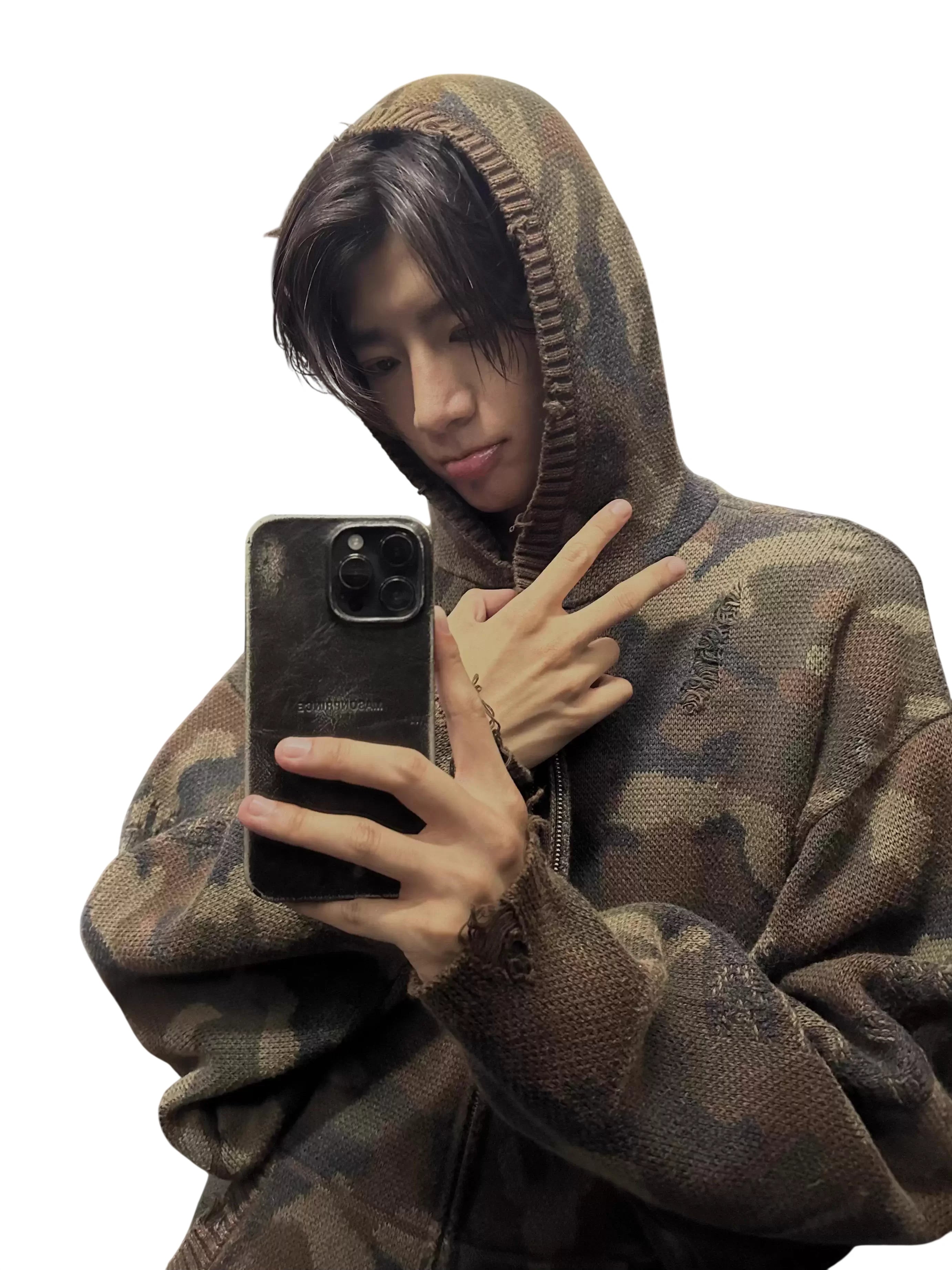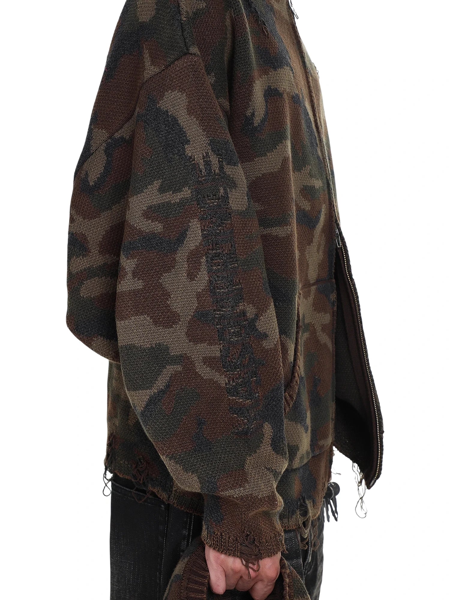 MASONPRINCE Men's Double-Layer Camouflage Knit Distressed Zip Hoodie