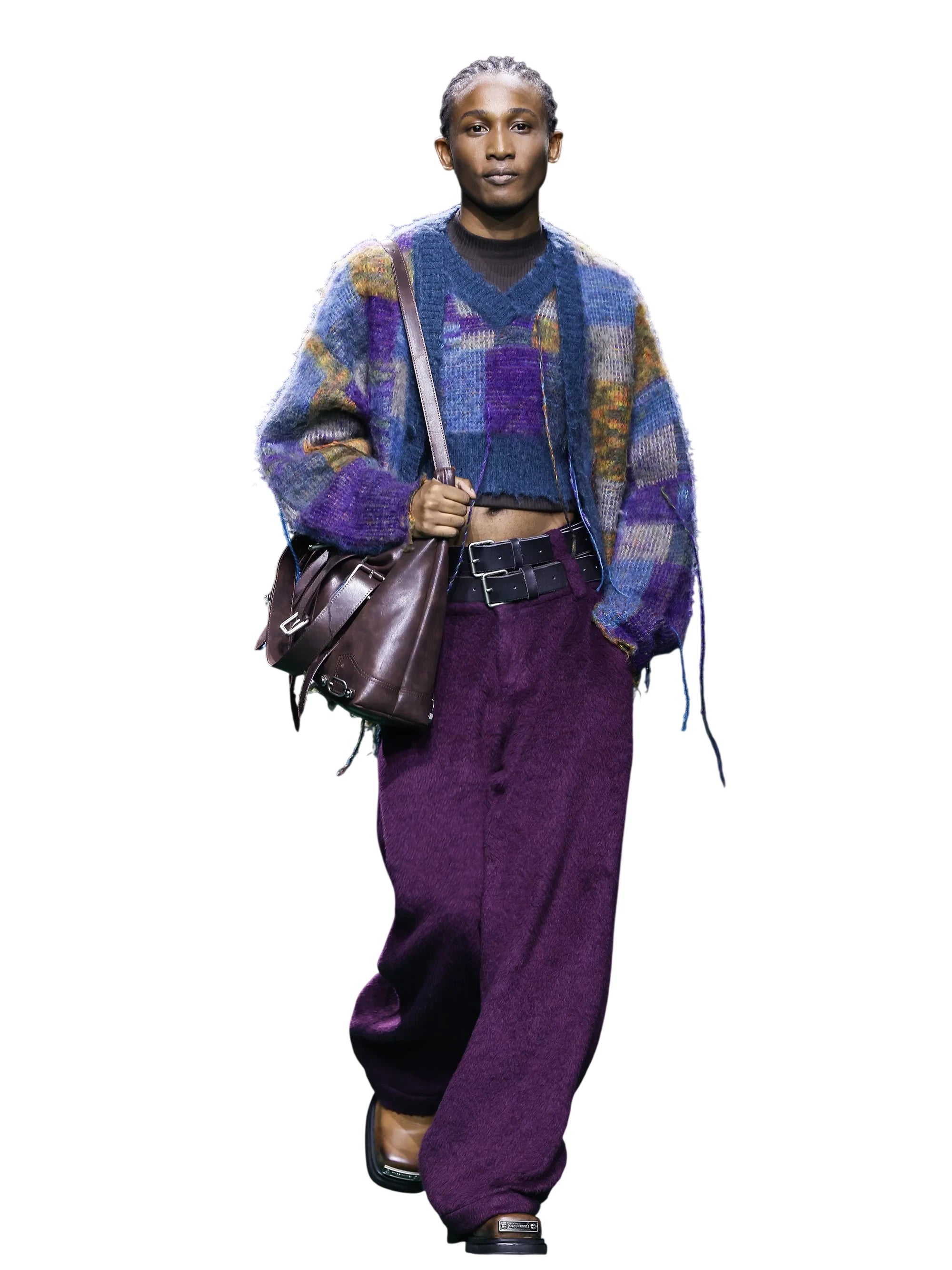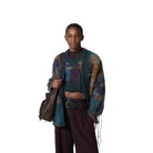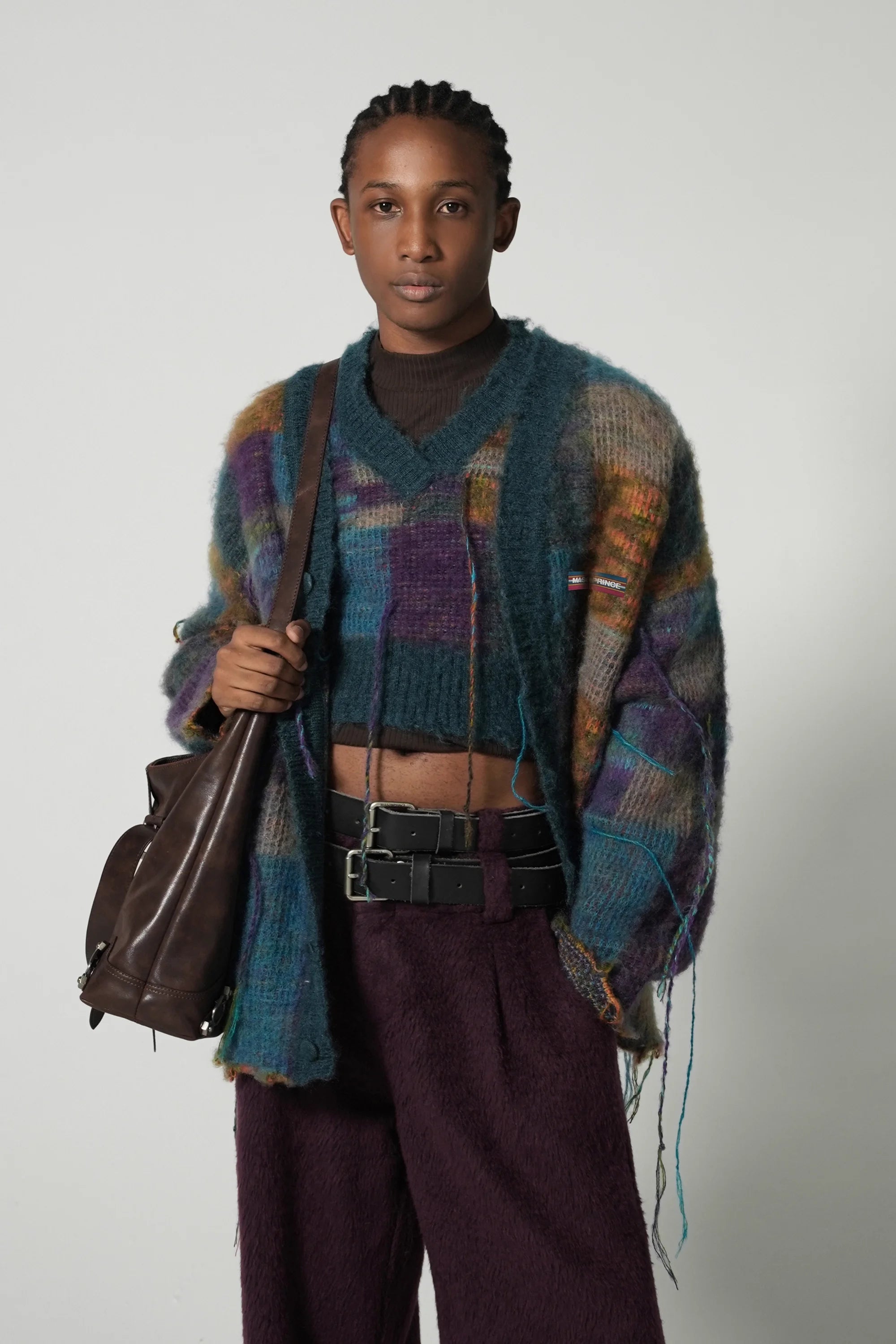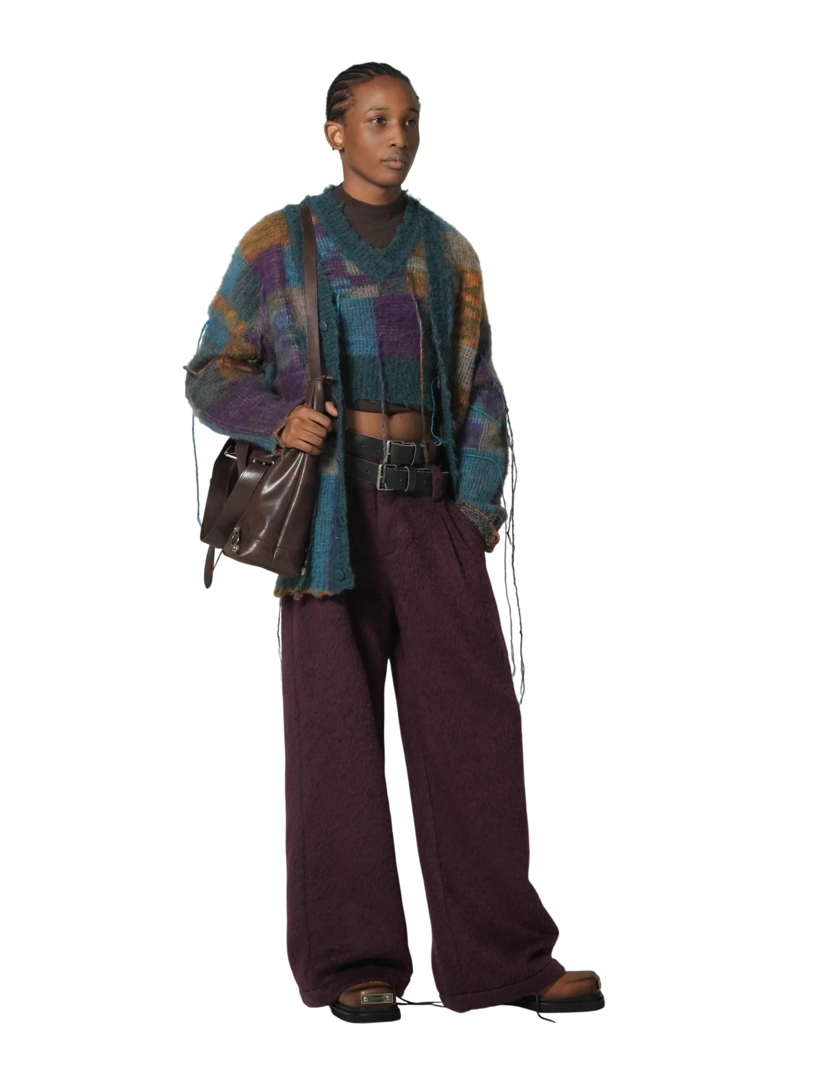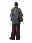 Elevate your winter style with this men's mohair blend cardigan. Featuring a bold checkered pattern in a rich palette of teal, purple, and gold, this oversized, loose-fit jacket offers both warmth and contemporary flair. The textured knit is accented with tassels for a stylish edge, making it a standout piece for any wardrobe. Layer it over sweaters or tees for a fashion-forward cold-weather look.