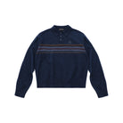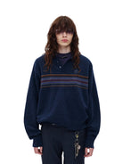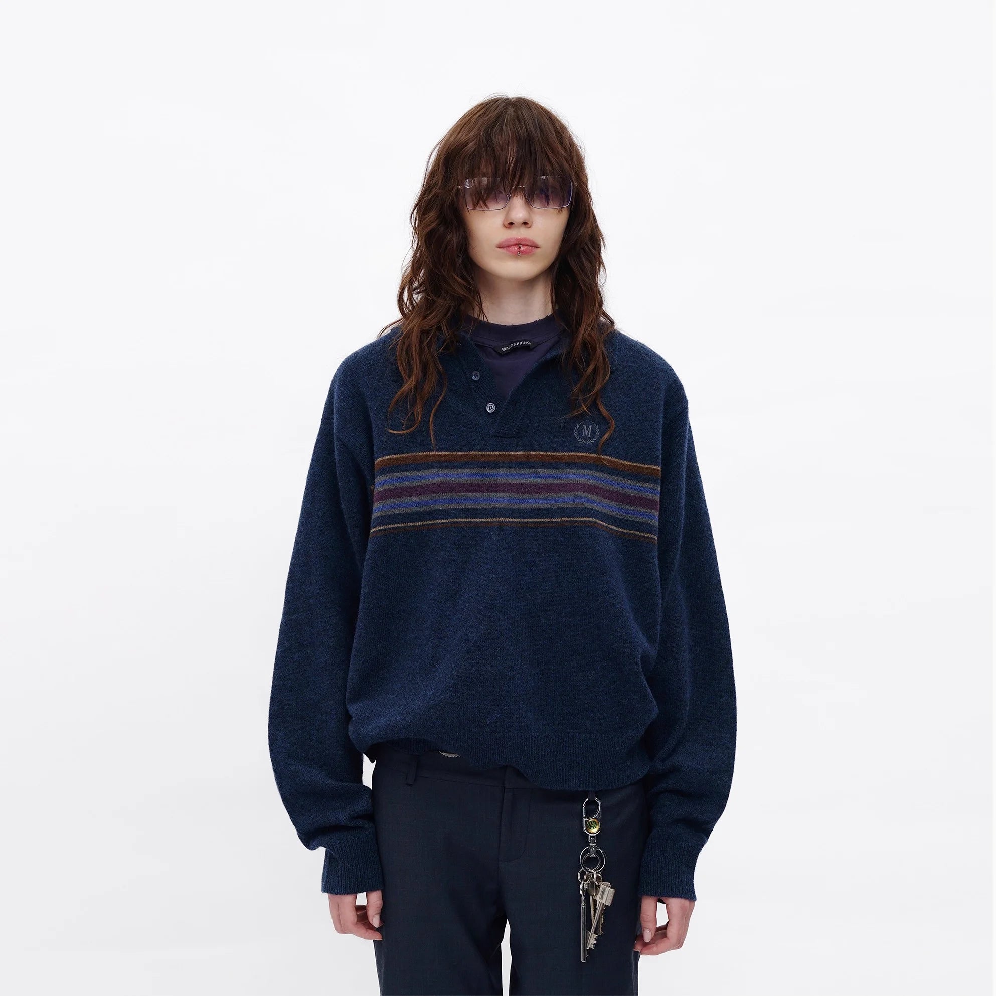 Elevate your fall wardrobe with this men's retro-inspired wool sweater. Featuring a classic navy blue color, this long-sleeve pullover showcases a henley collar with button placket for timeless appeal. A series of multi-colored horizontal stripes in brown, mustard, and blue span the chest, adding vintage charm. The sweater also includes an embroidered "M" insignia on the upper left chest. Designed with a relaxed fit, it's perfect for layering in cooler weather.
